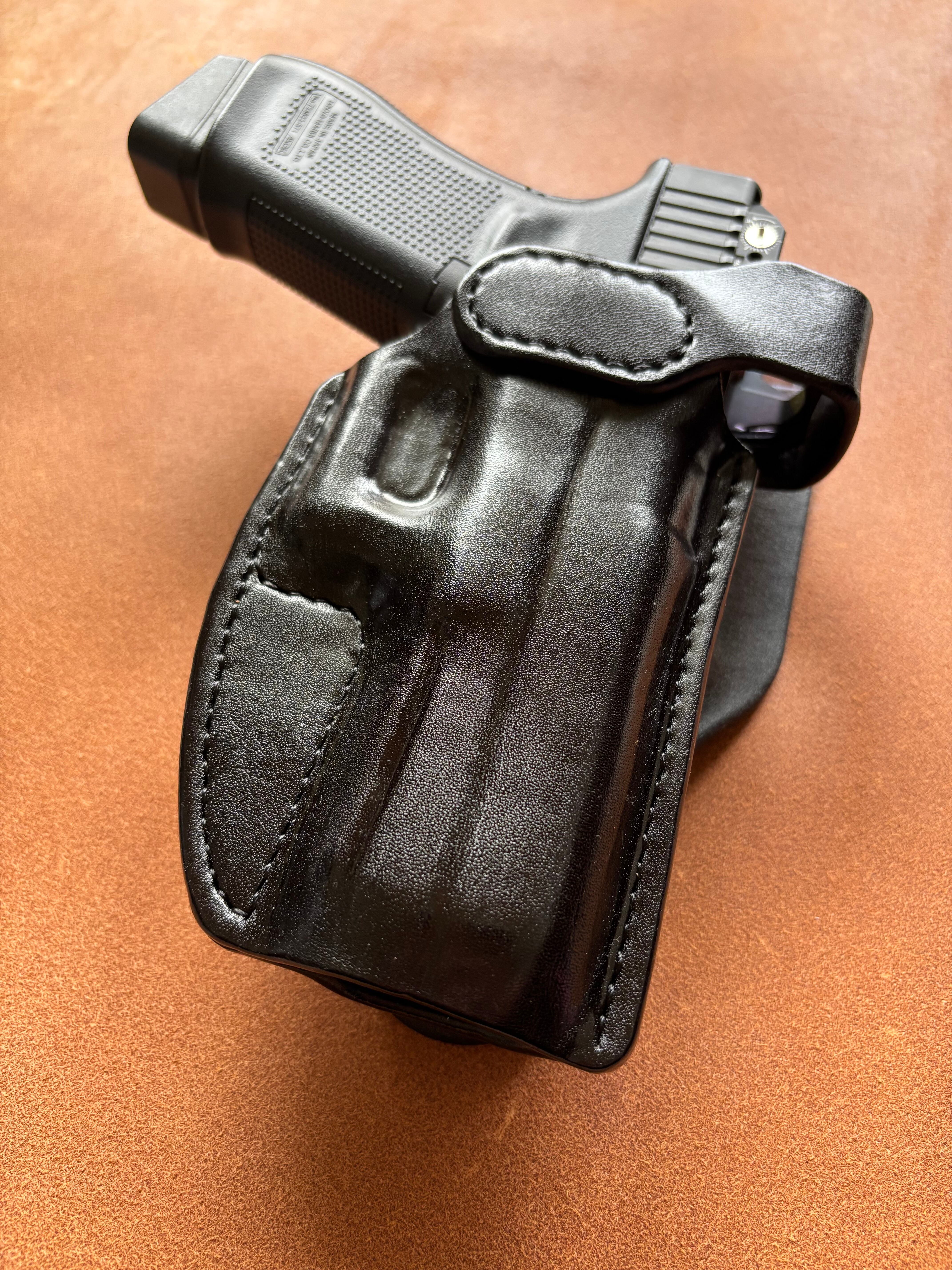栃木レザー4mm厚(フルベジタブルタンニン鞣 ヌメ革)を切り出し黒染色を行いウエットフォーミングでフィッティングしておりスムーズにリホルスター可能です