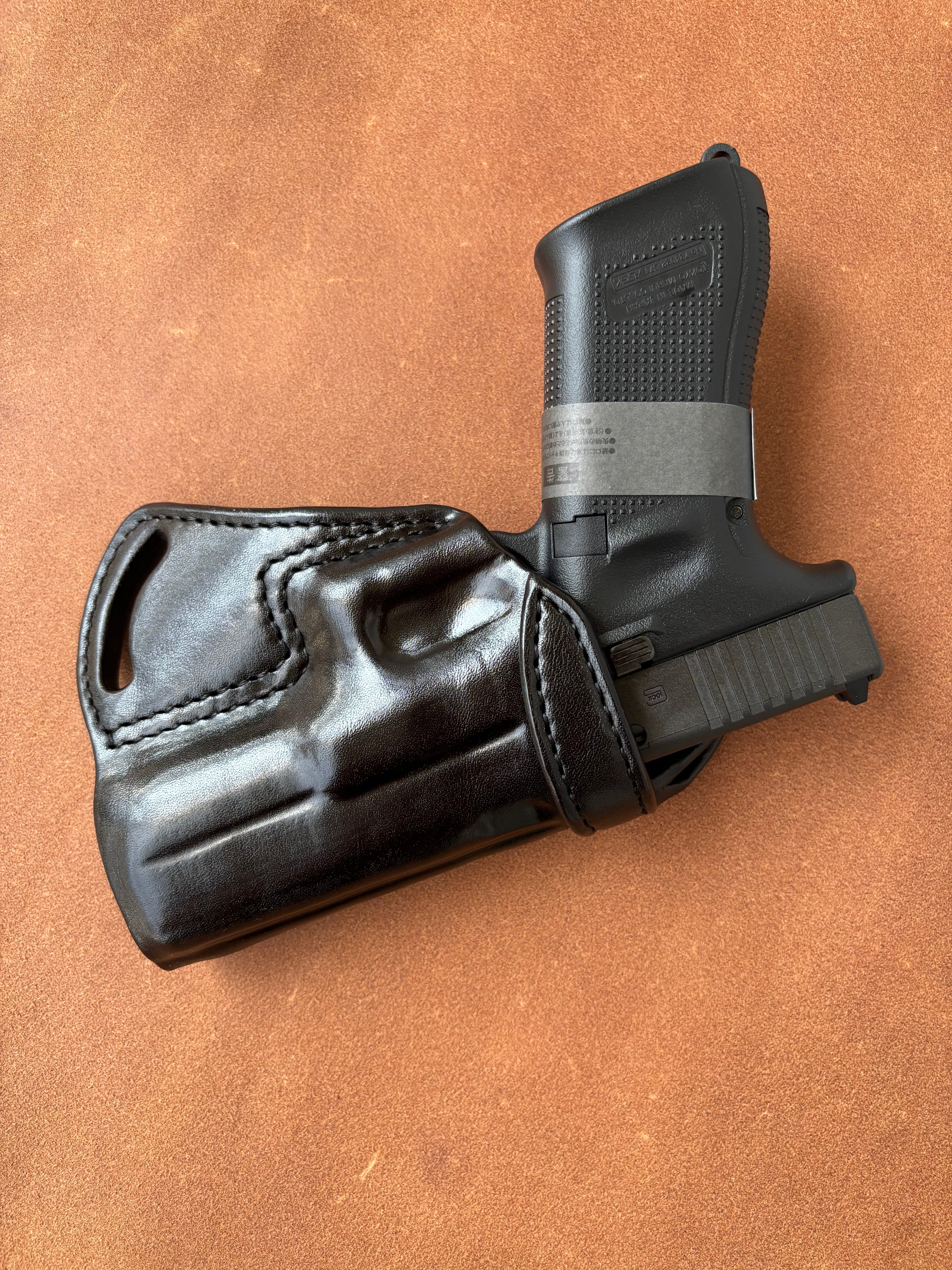 栃木レザー4mm厚(フルベジタブルタンニン鞣 ヌメ革)を切り出し黒染色を行いウエットフォーミングでフィッティングしておりスムーズにリホルスター可能です