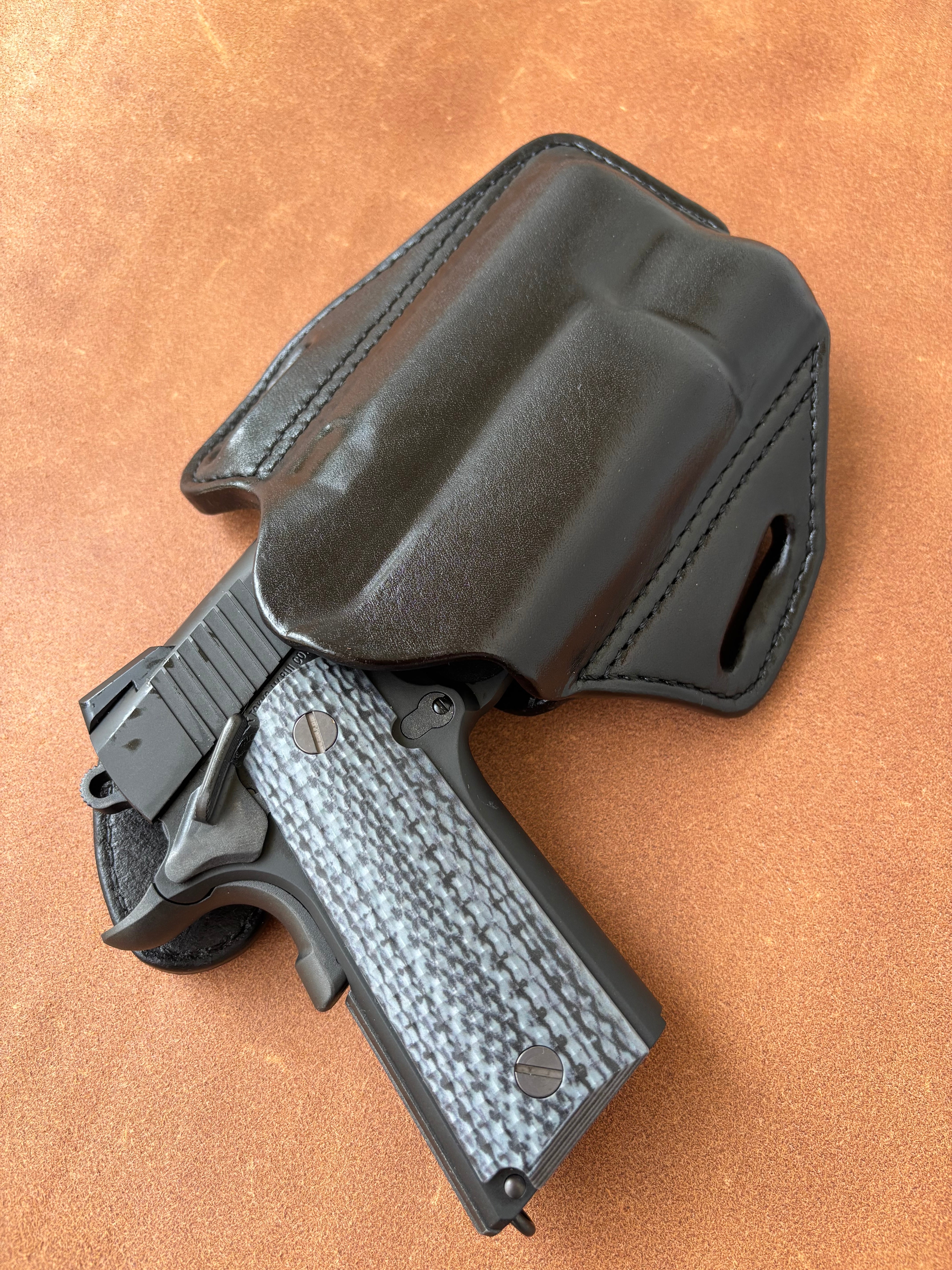 栃木レザー4mm厚(フルベジタブルタンニン鞣 ヌメ革)を切り出し黒染色を行いウエットフォーミングでフィッティングしておりスムーズにリホルスター可能です