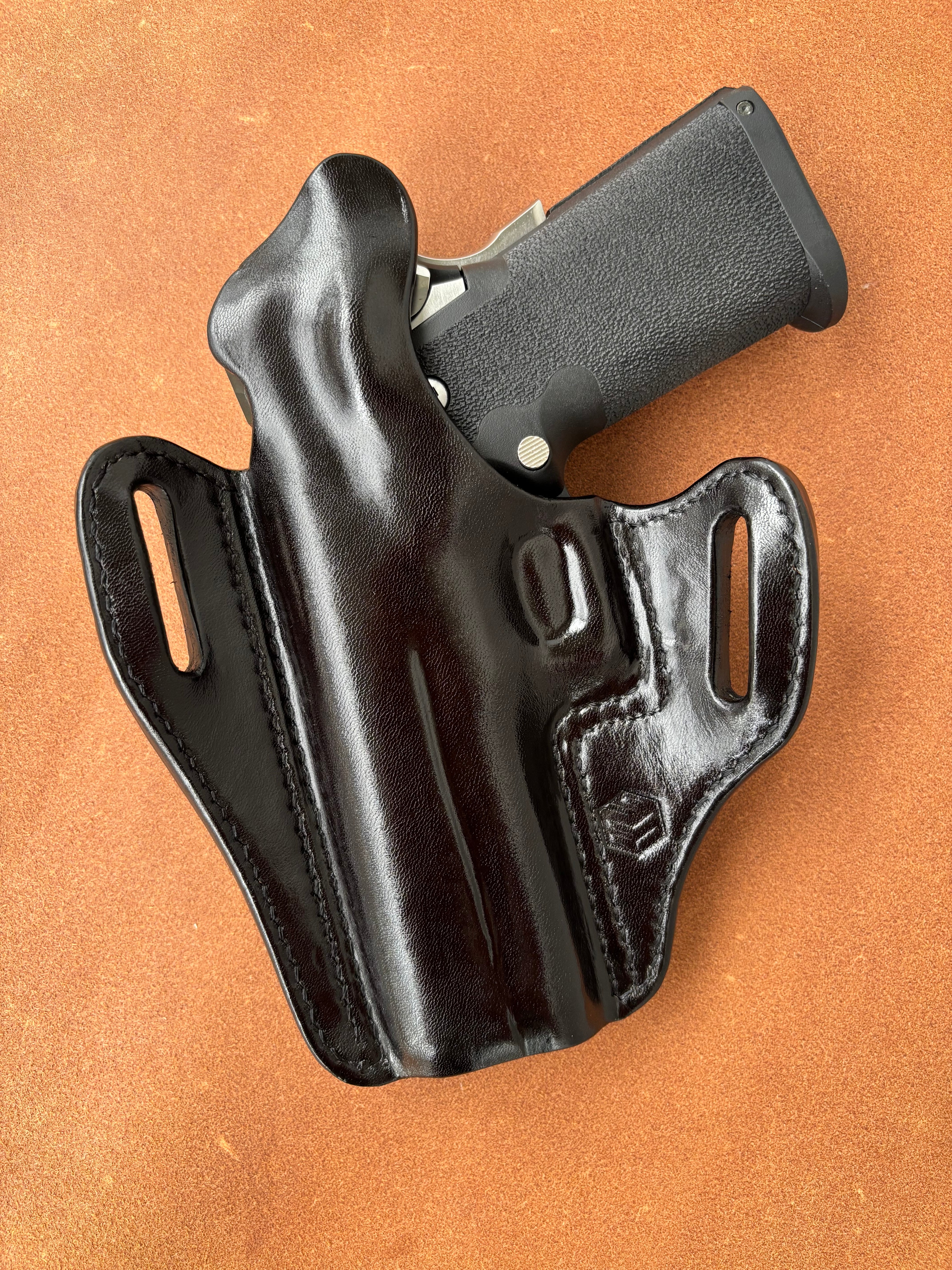 栃木レザー4mm厚(フルベジタブルタンニン鞣 ヌメ革)を切り出し黒染色を行いウエットフォーミングでフィッティングしておりスムーズにリホルスター可能です