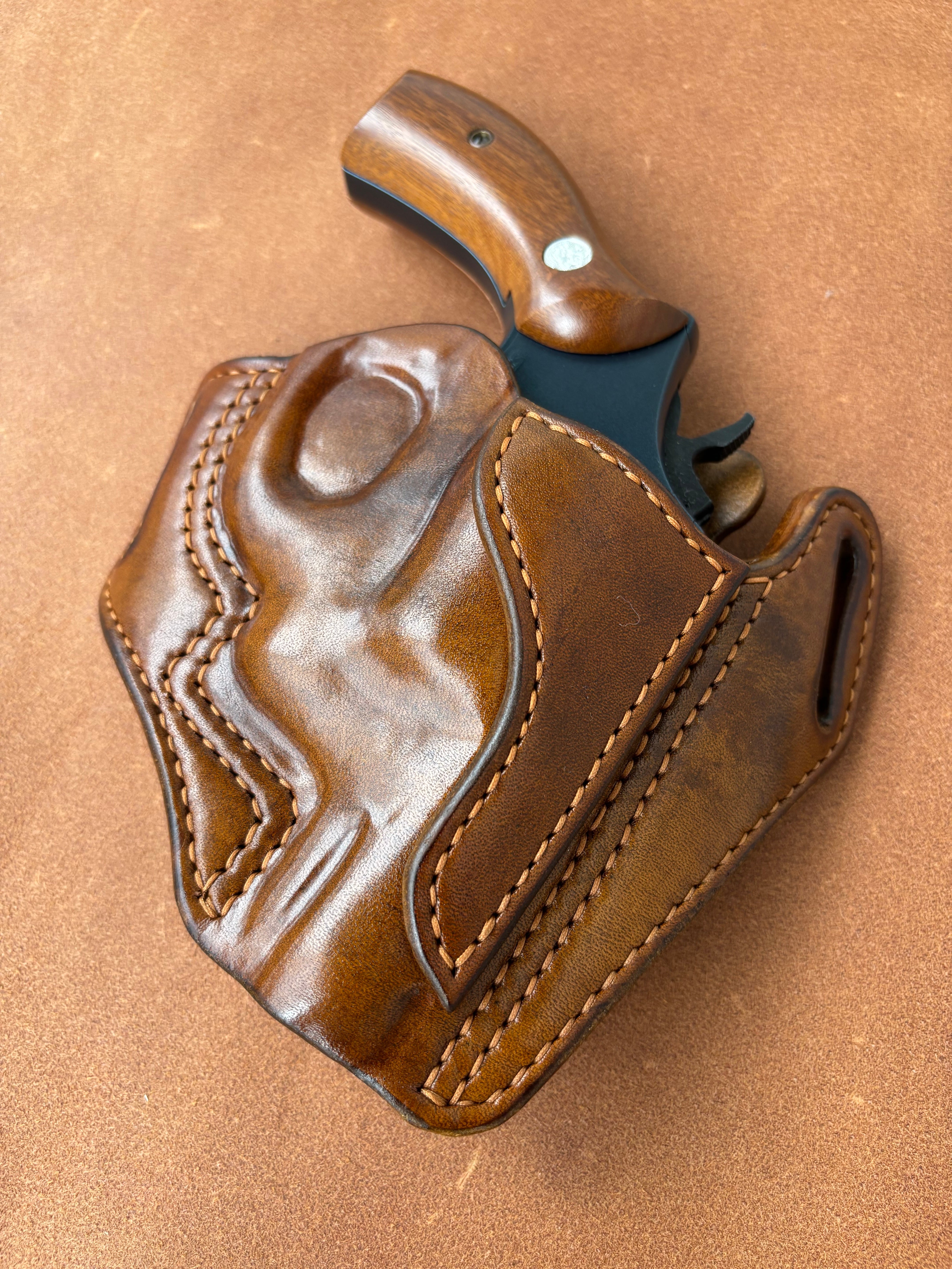 栃木レザー4mm厚(フルベジタブルタンニン鞣 ヌメ革)を切り出し黒染色を行いウエットフォーミングでフィッティングしておりスムーズにリホルスター可能です