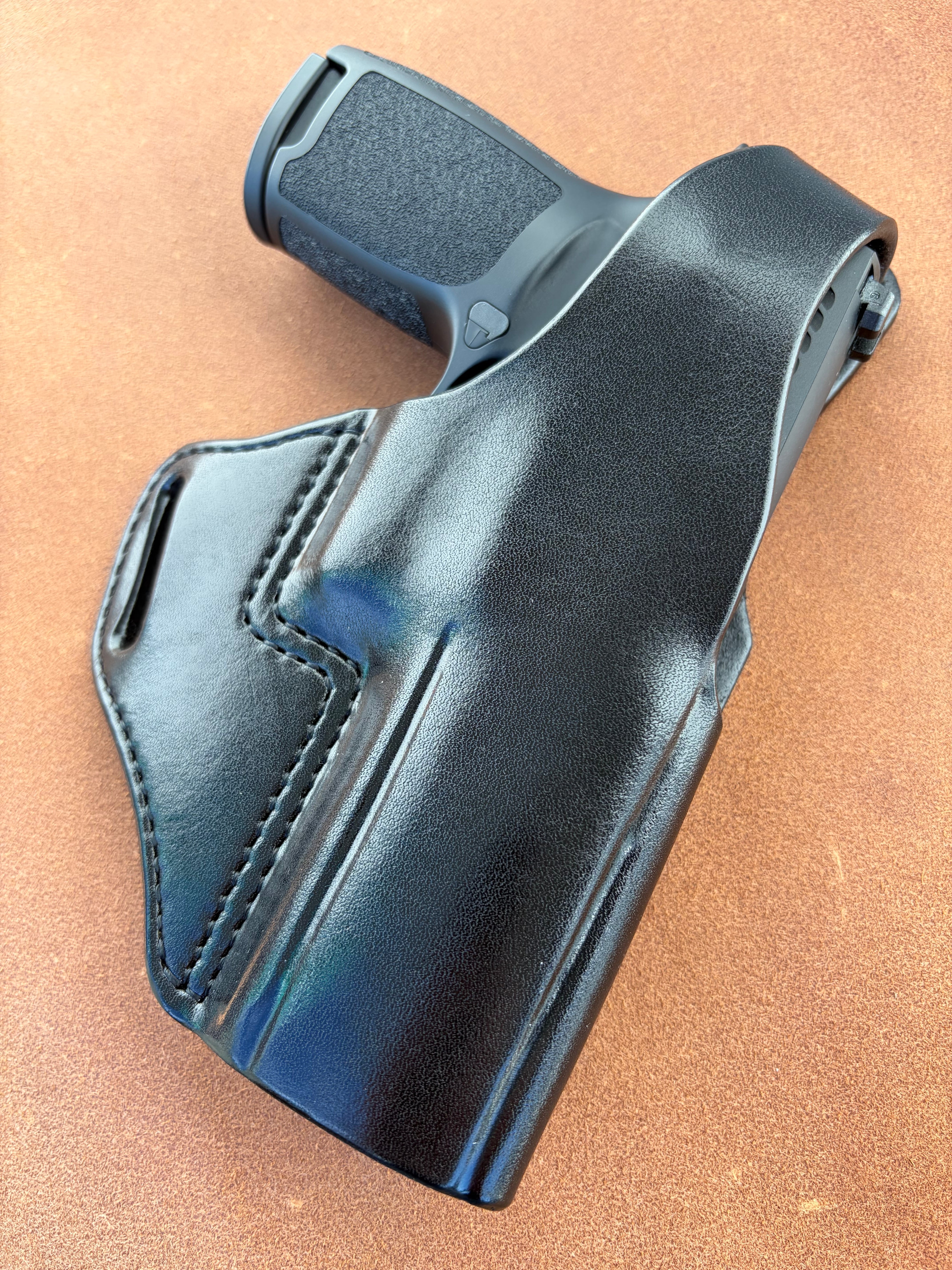 栃木レザー4mm厚(フルベジタブルタンニン鞣 ヌメ革)を切り出し黒染色を行いウエットフォーミングでフィッティングしておりスムーズにリホルスター可能です