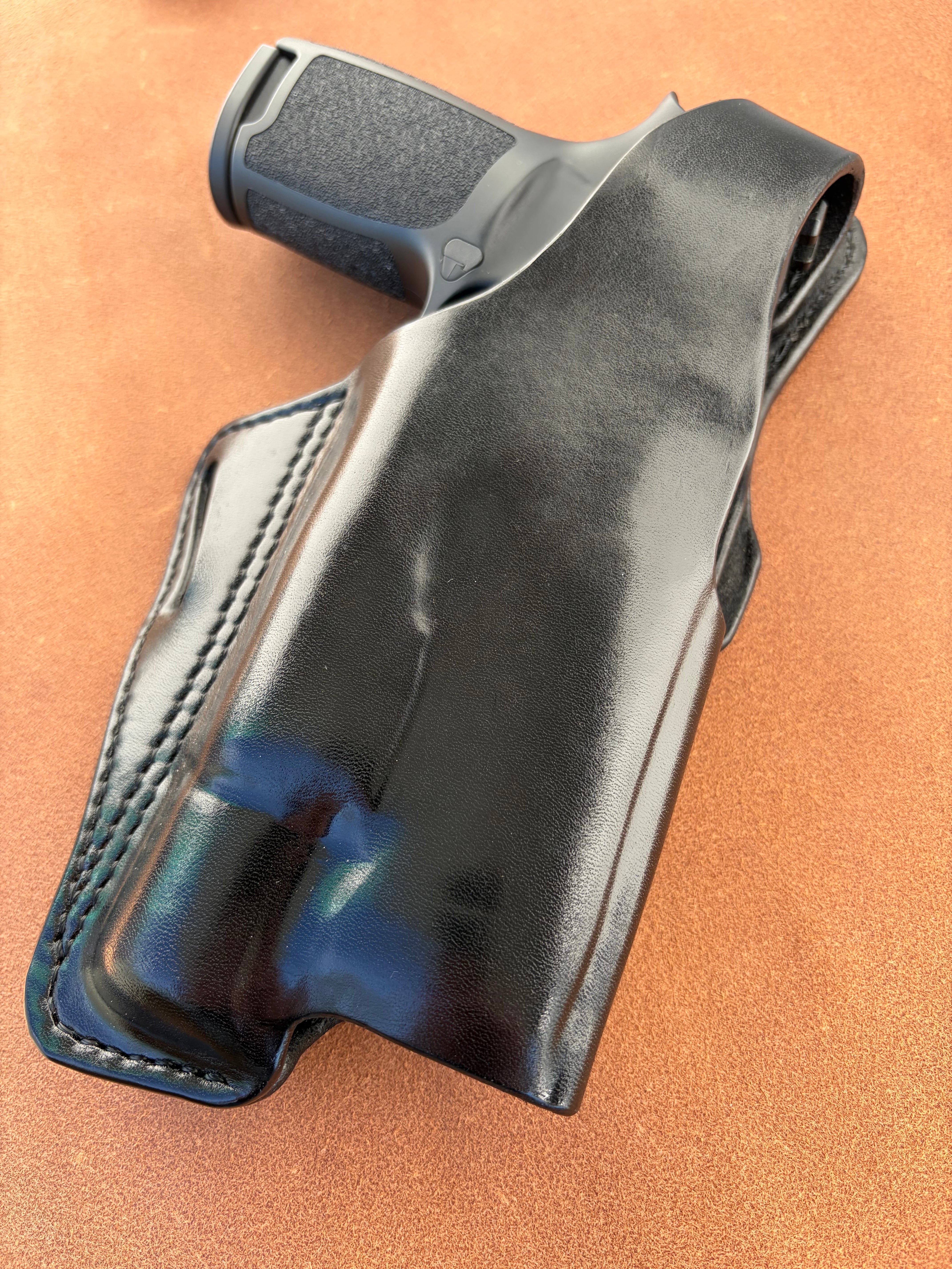 栃木レザー4mm厚(フルベジタブルタンニン鞣 ヌメ革)を切り出し黒染色を行いウエットフォーミングでフィッティングしておりスムーズにリホルスター可能です
