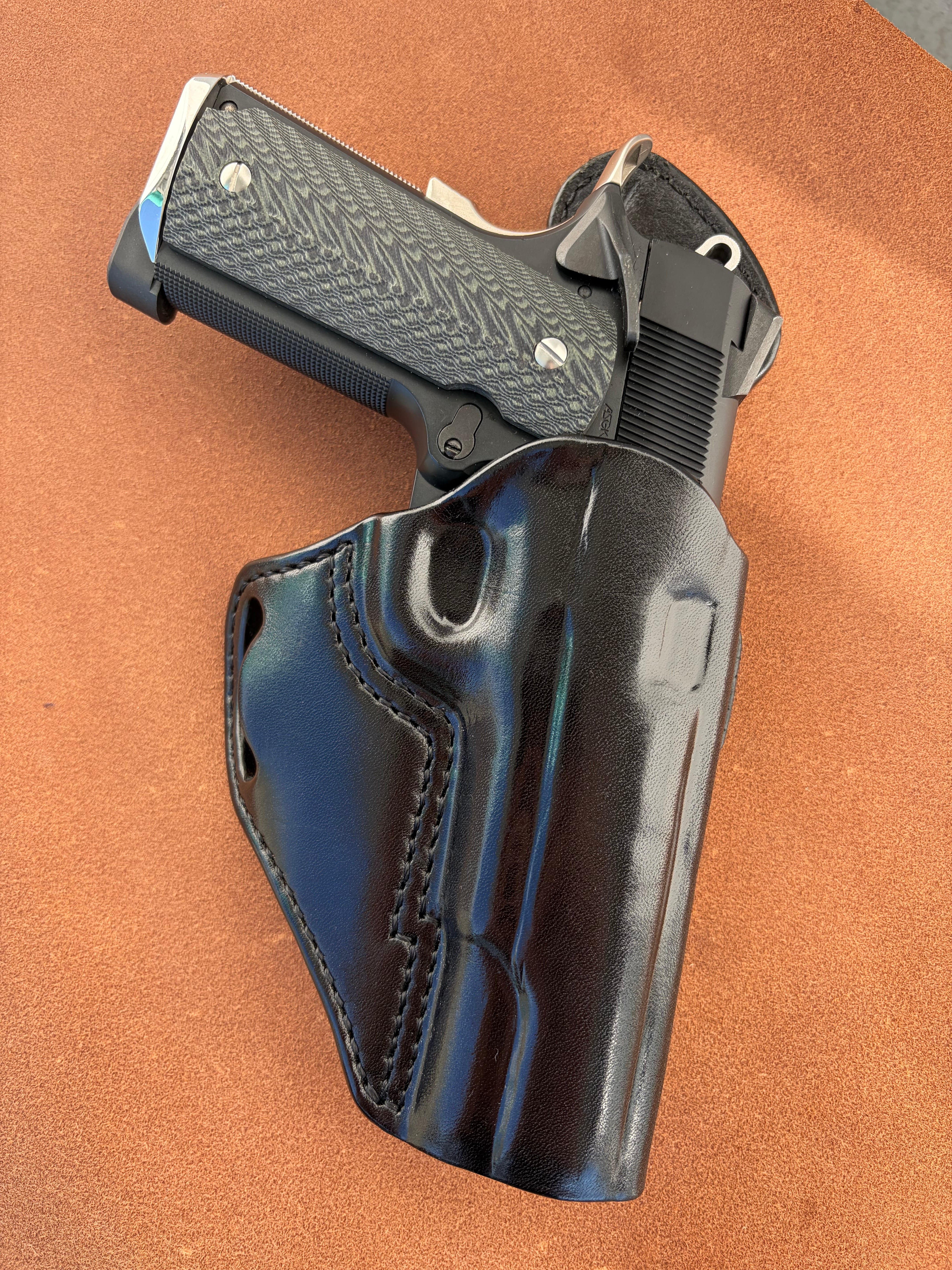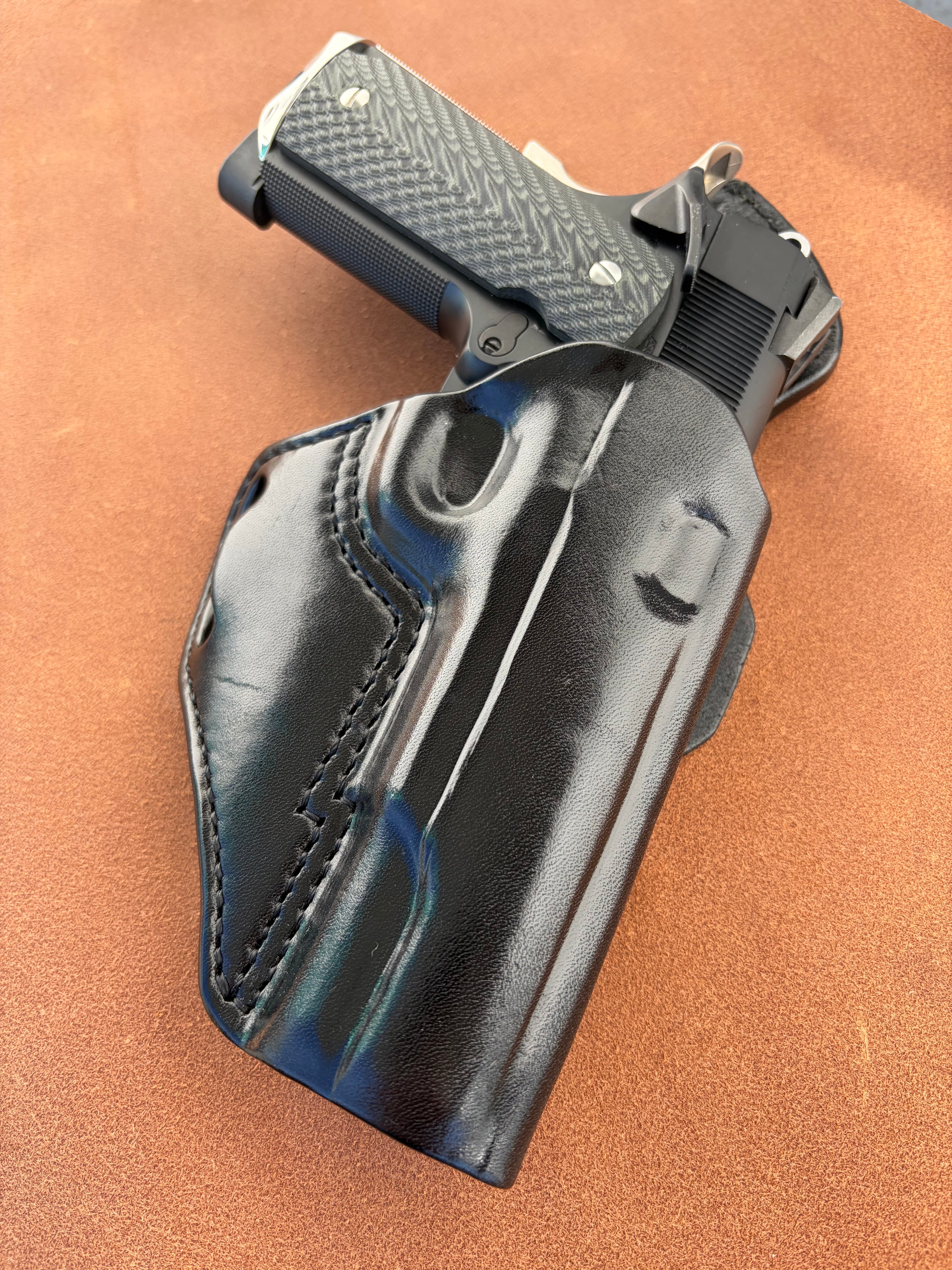 栃木レザー4mm厚(フルベジタブルタンニン鞣 ヌメ革)を切り出し黒染色を行いウエットフォーミングでフィッティングしておりスムーズにリホルスター可能です