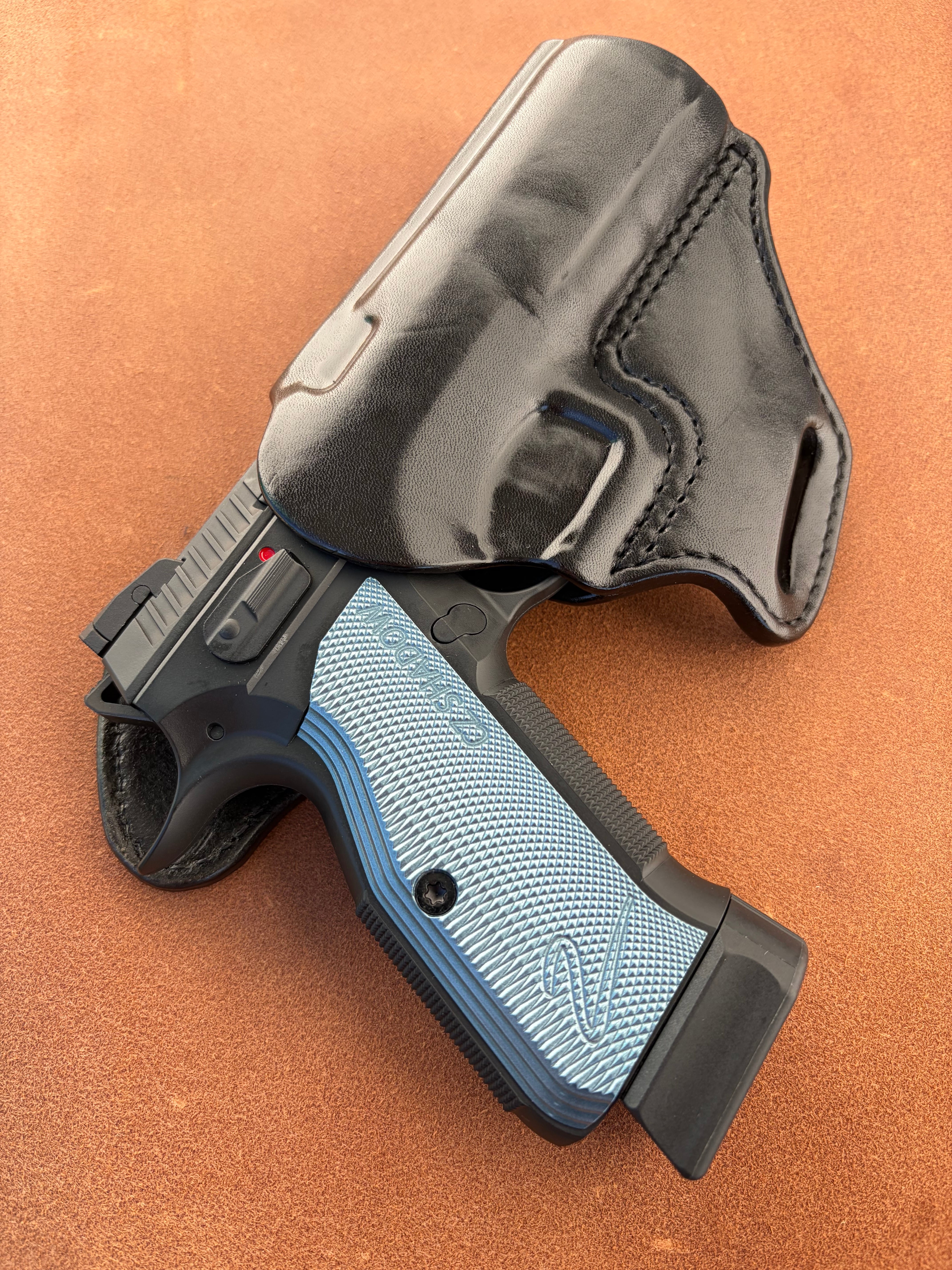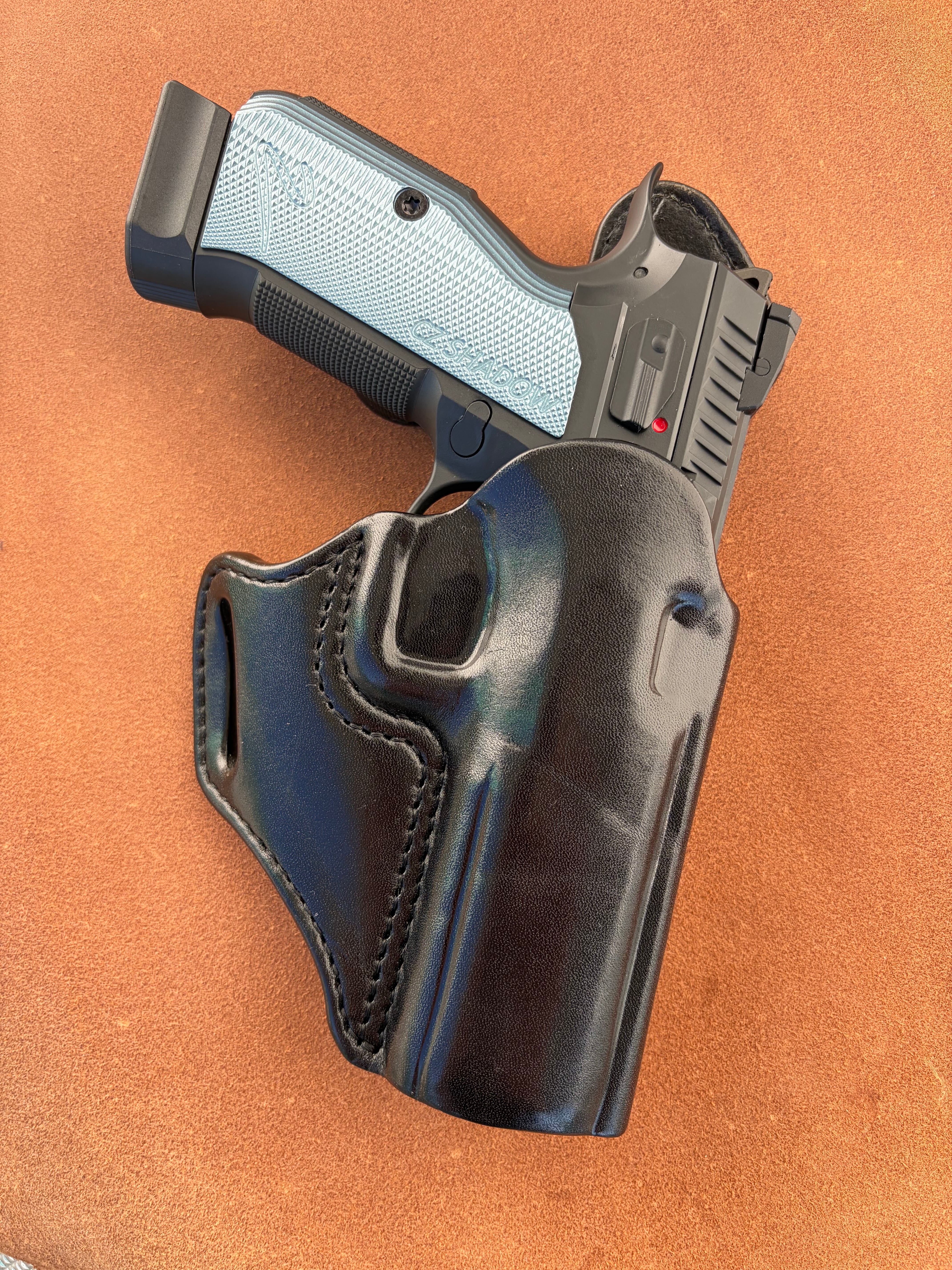 栃木レザー4mm厚(フルベジタブルタンニン鞣 ヌメ革)を切り出し黒染色を行いウエットフォーミングでフィッティングしておりスムーズにリホルスター可能です