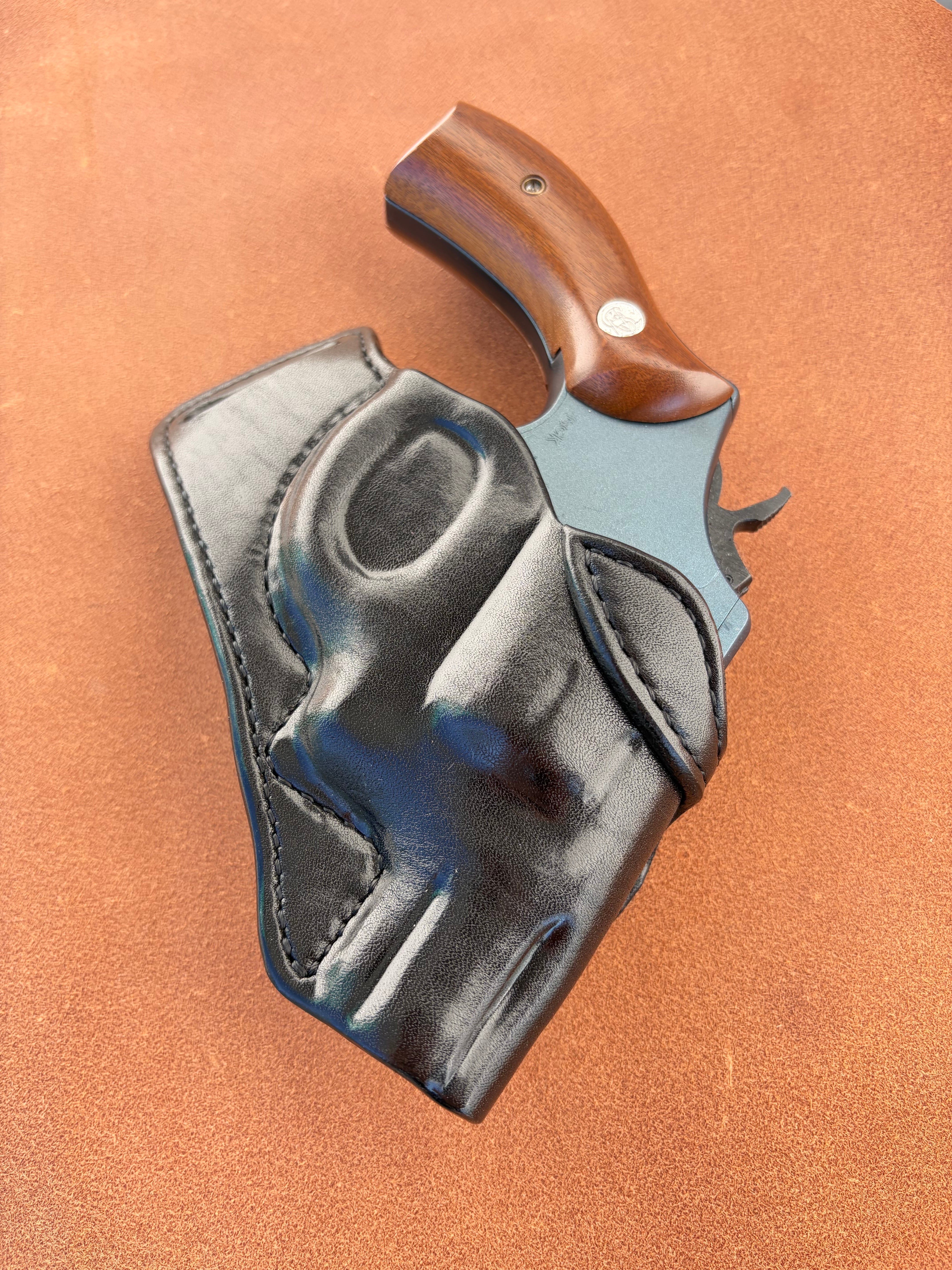 栃木レザー4mm厚(フルベジタブルタンニン鞣 ヌメ革)を切り出し黒染色を行いウエットフォーミングでフィッティングしておりスムーズにリホルスター可能です