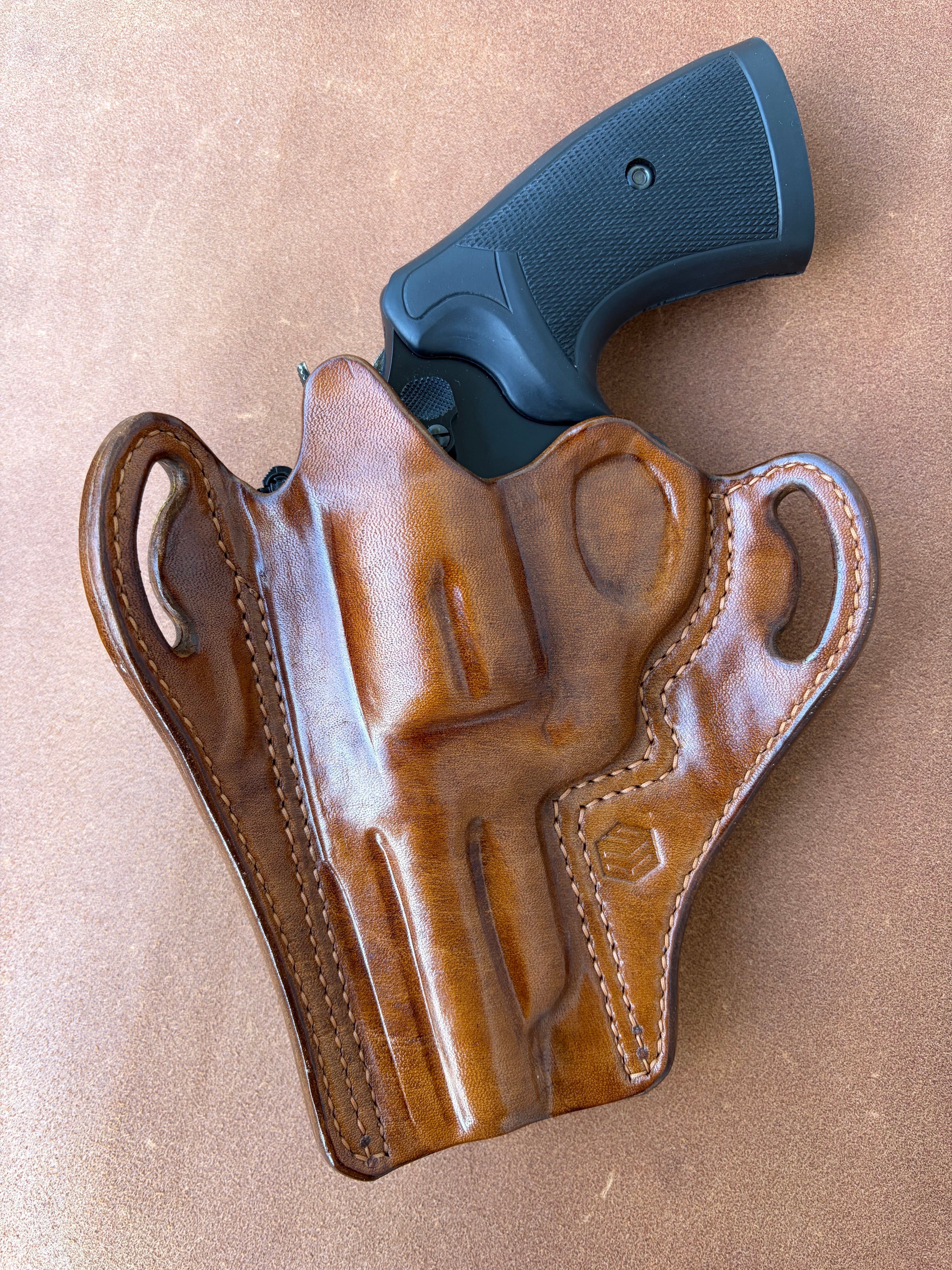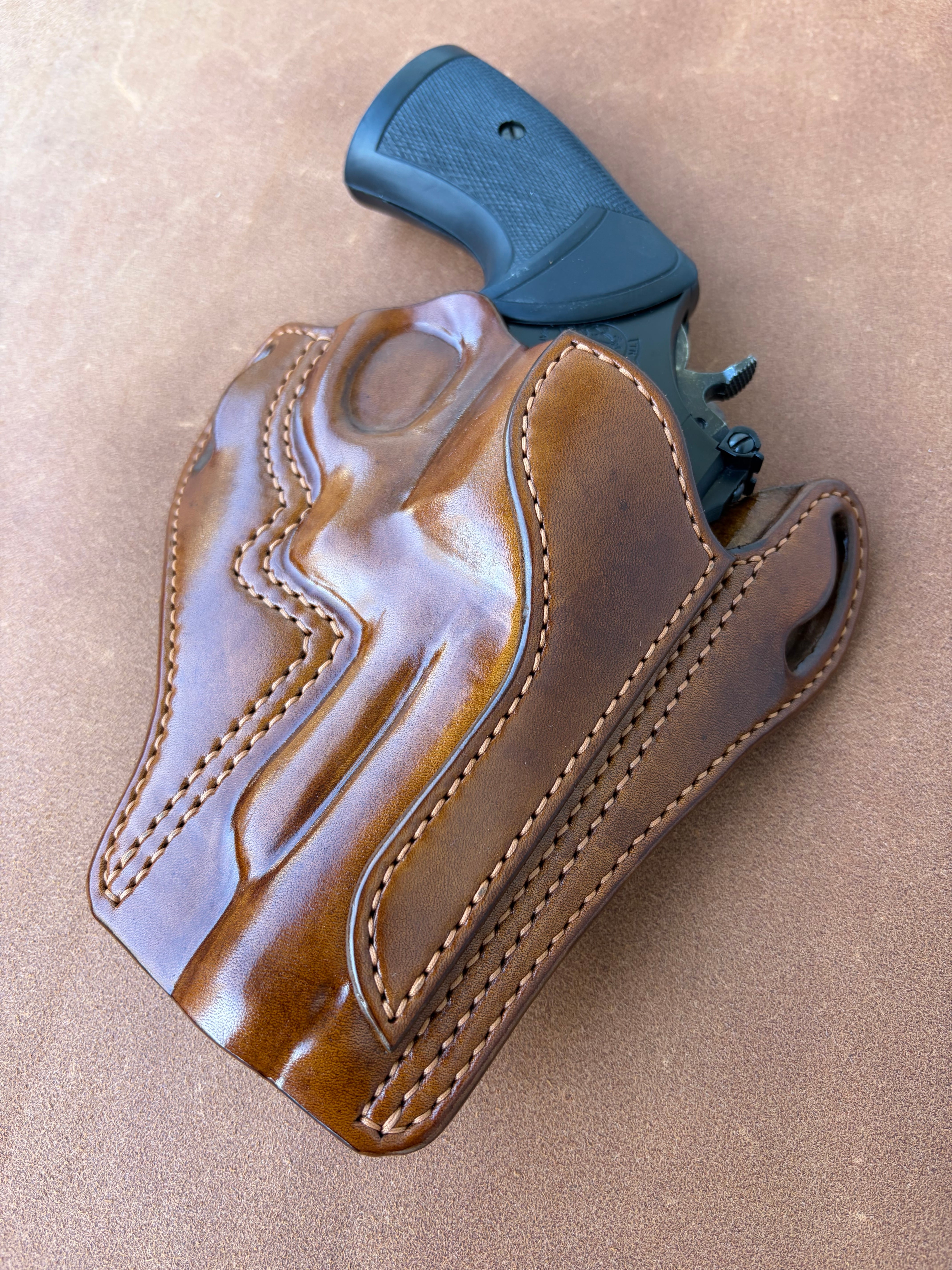 栃木レザー4mm厚(フルベジタブルタンニン鞣 ヌメ革)を切り出しライトブラウン染色を行いウエットフォーミングでフィッティングしておりスムーズにリホルスター可能です