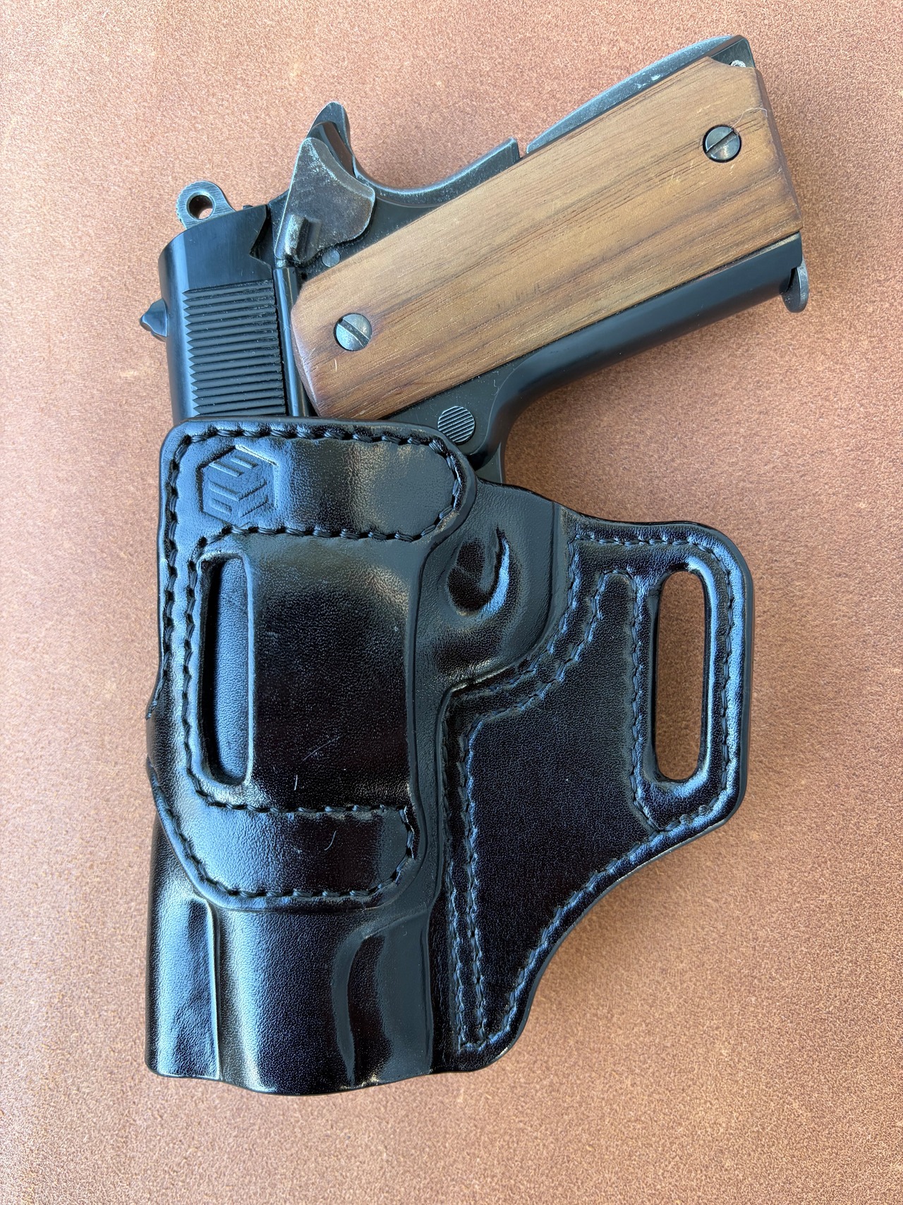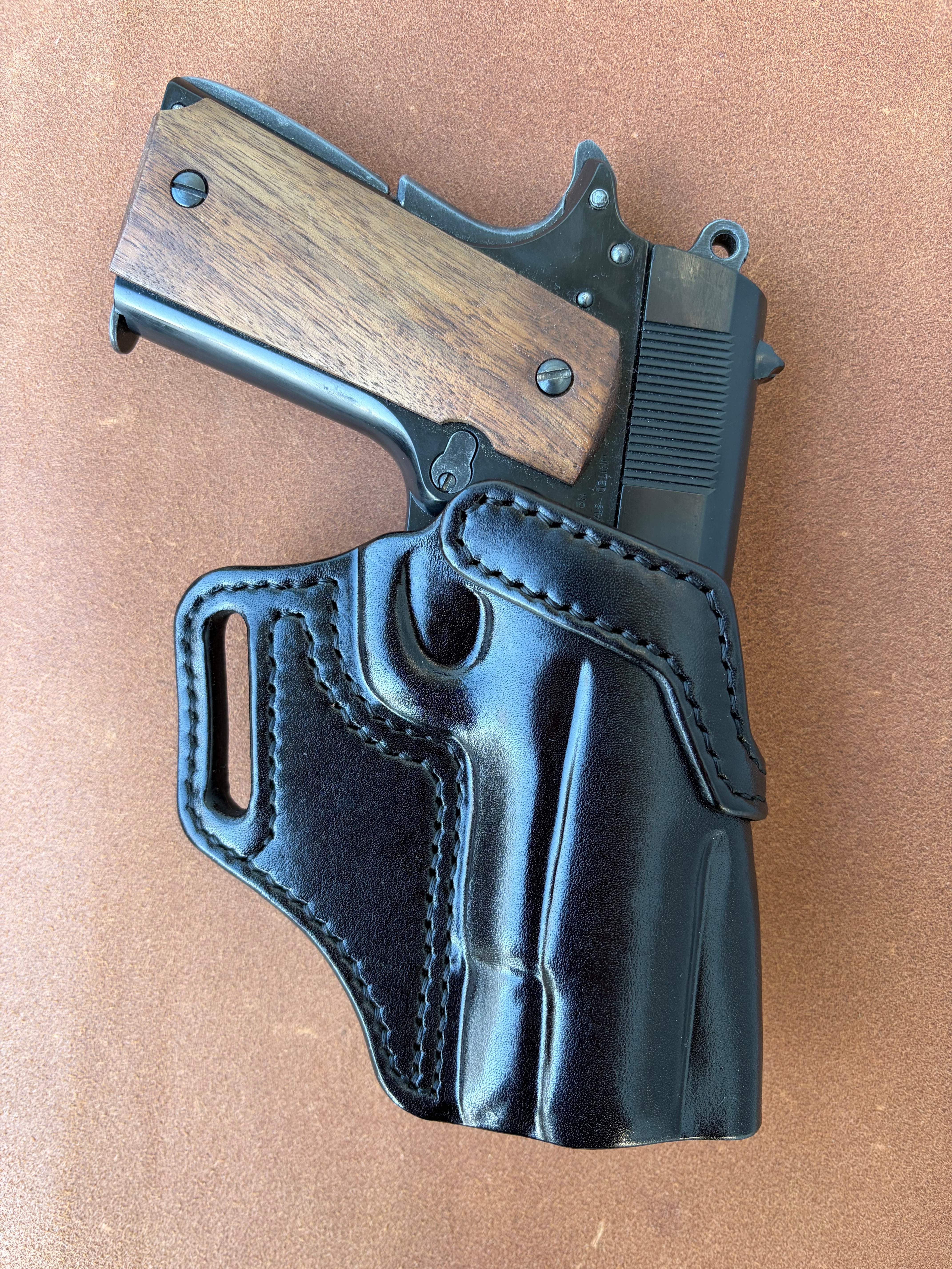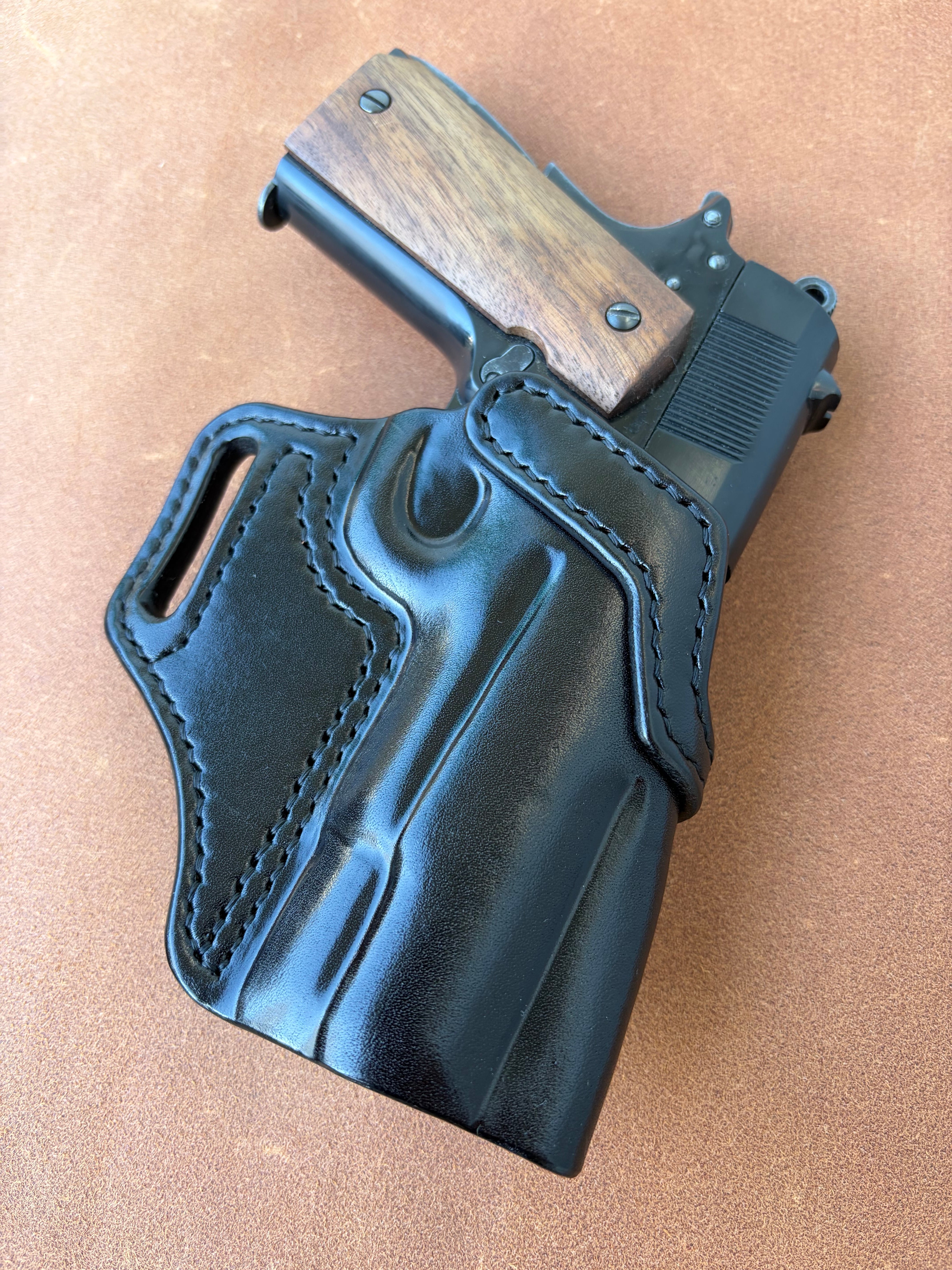 栃木レザー4mm厚(フルベジタブルタンニン鞣 ヌメ革)を切り出し黒染色を行いウエットフォーミングでフィッティングしておりスムーズにリホルスター可能です