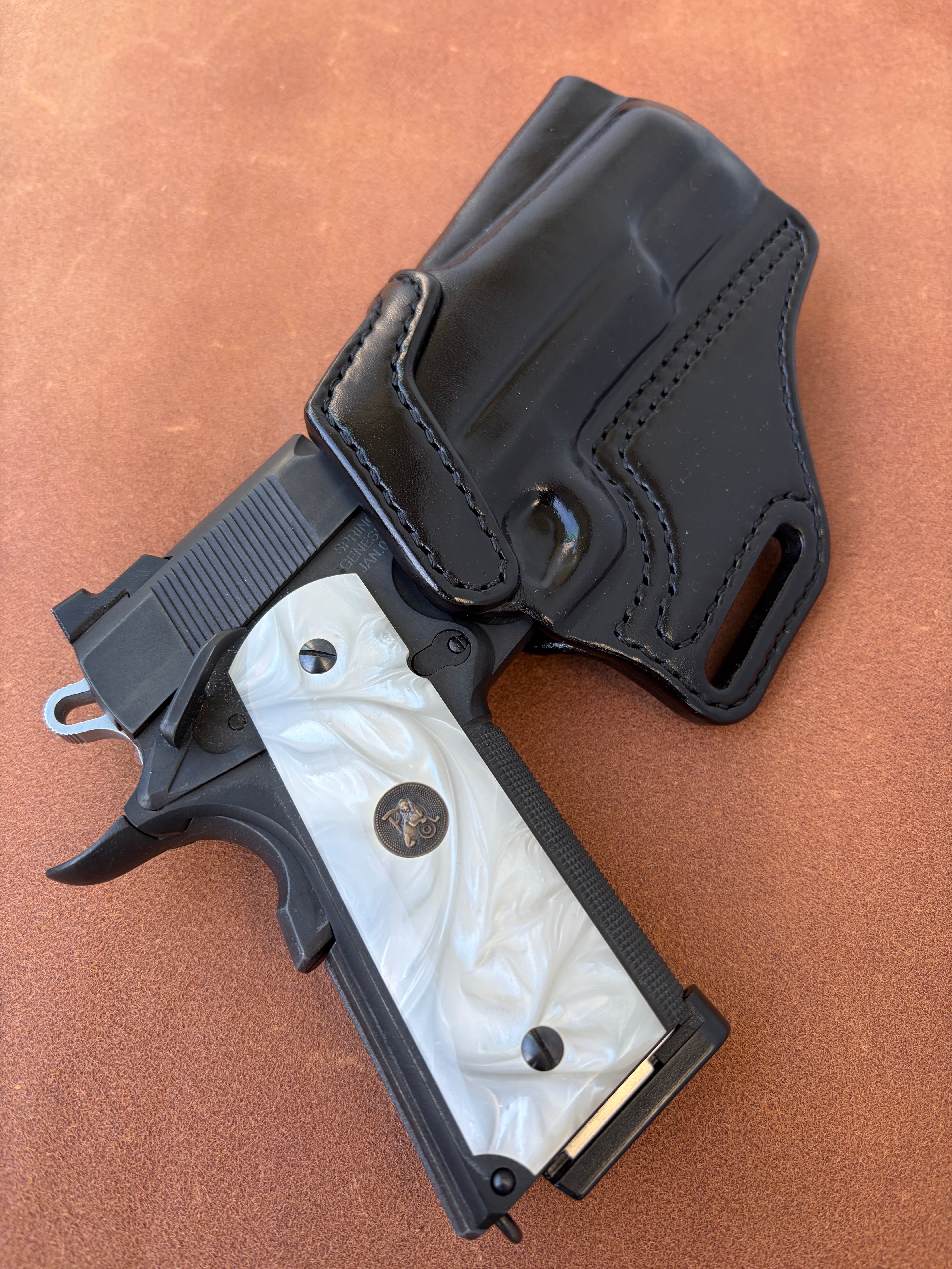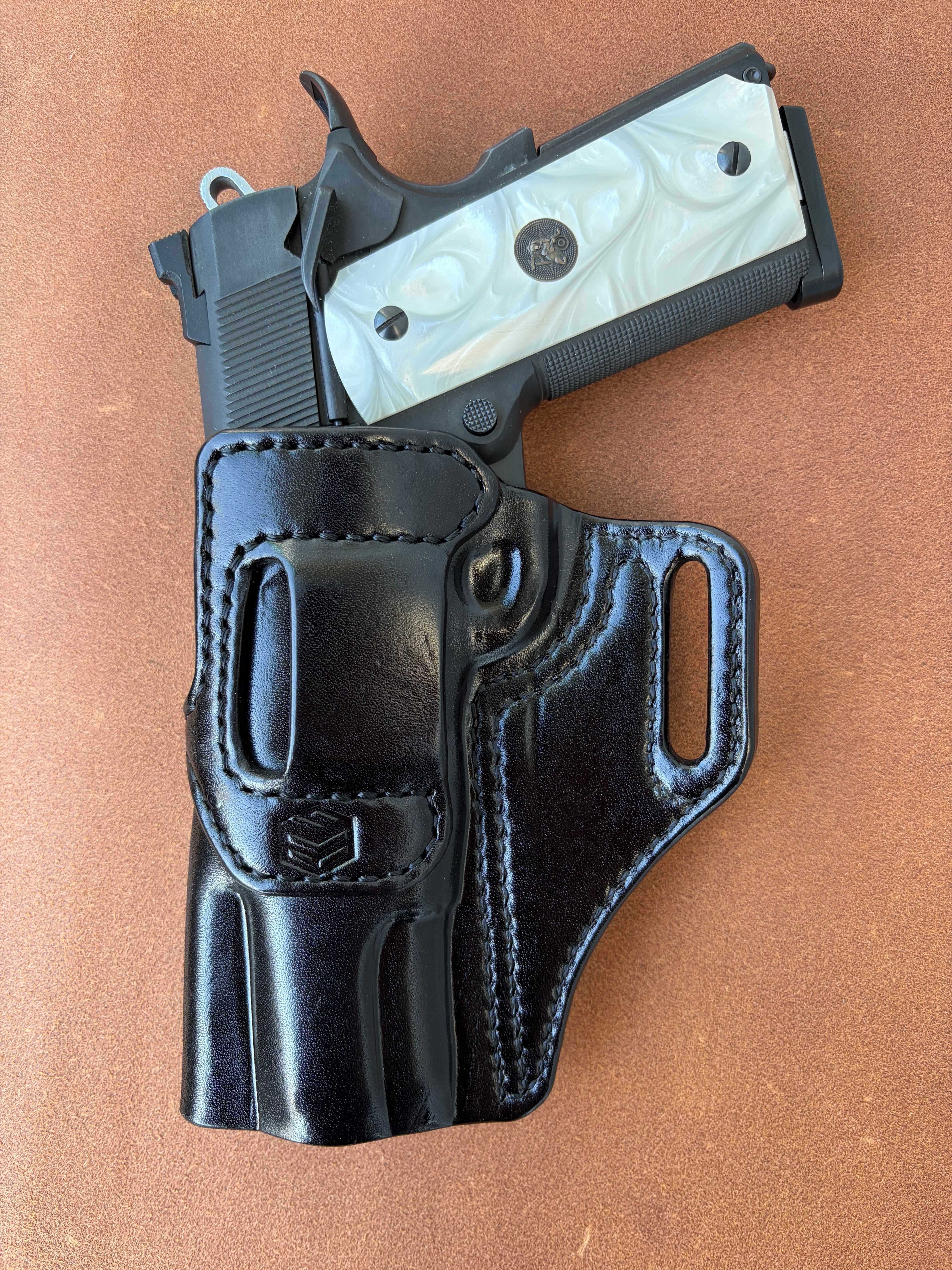 栃木レザー4mm厚(フルベジタブルタンニン鞣 ヌメ革)を切り出し黒染色を行いウエットフォーミングでフィッティングしておりスムーズにリホルスター可能です