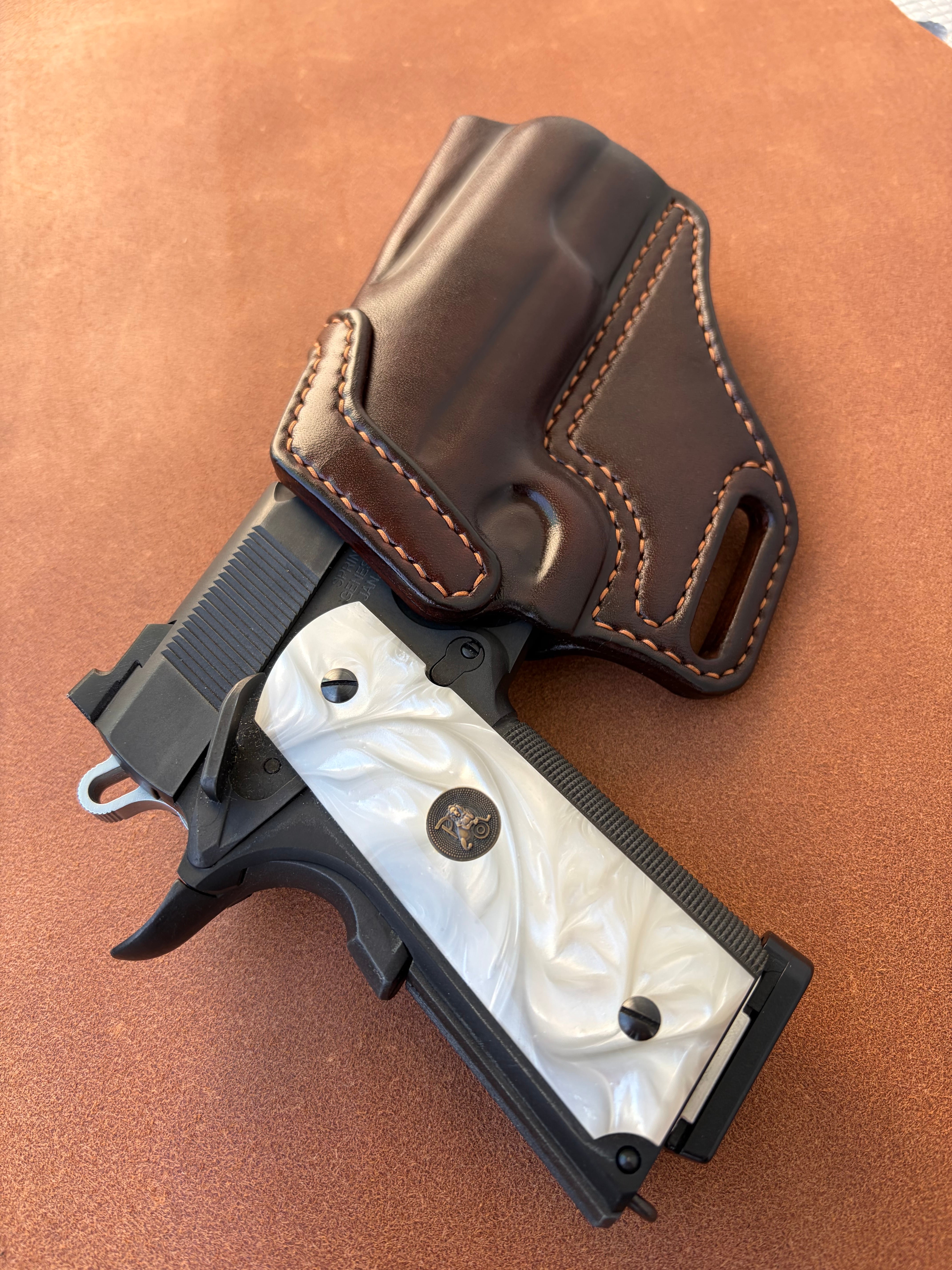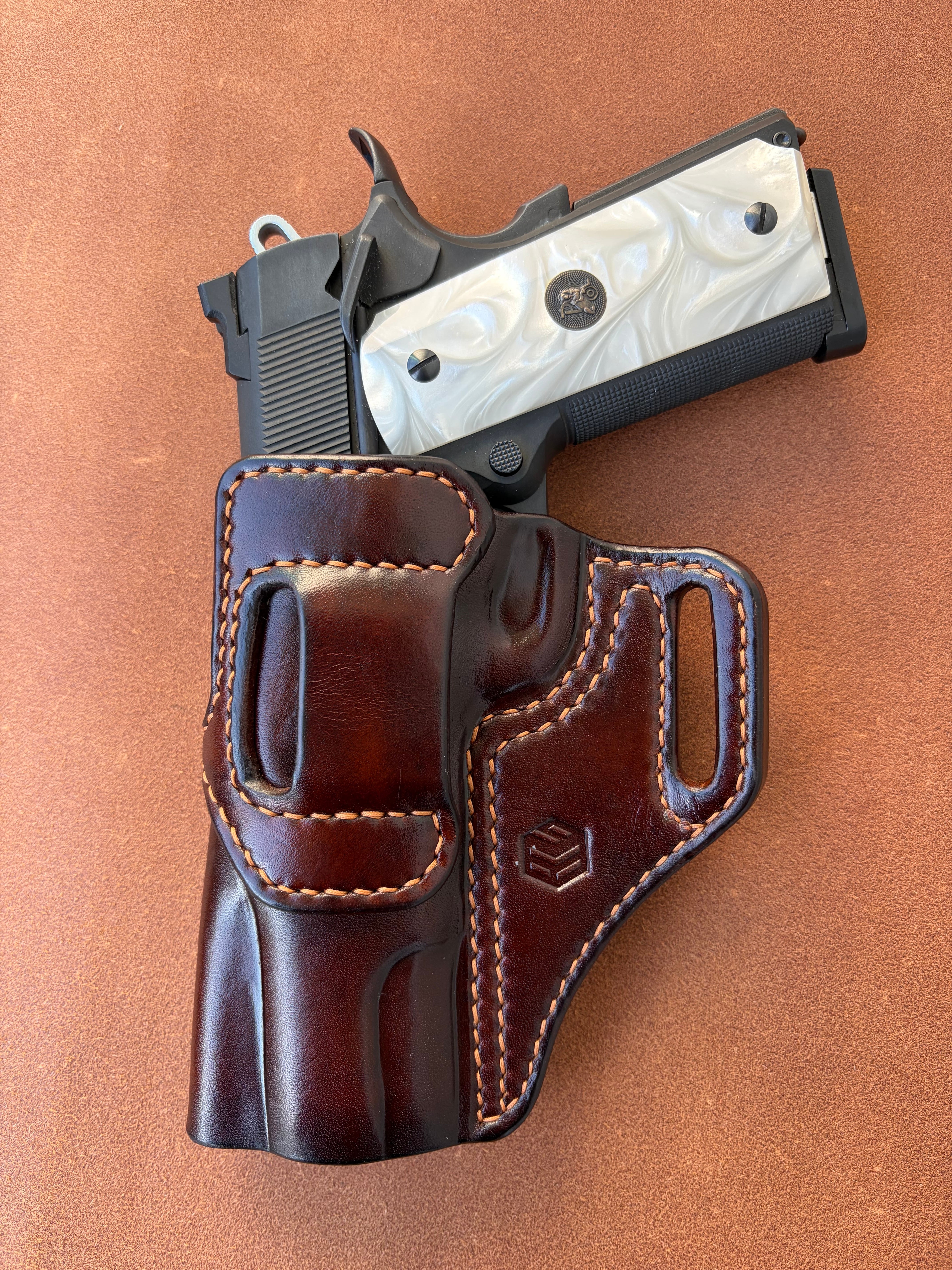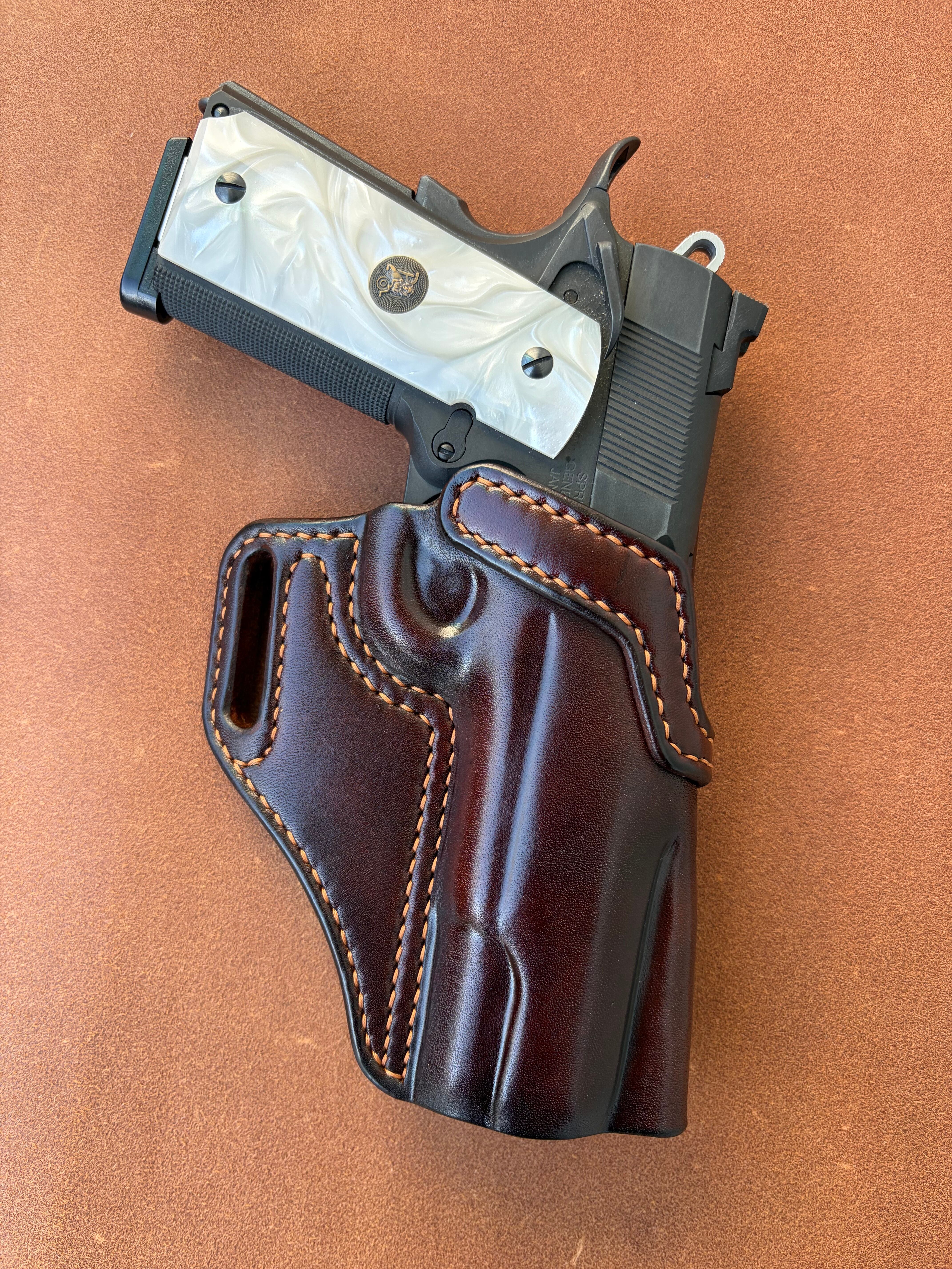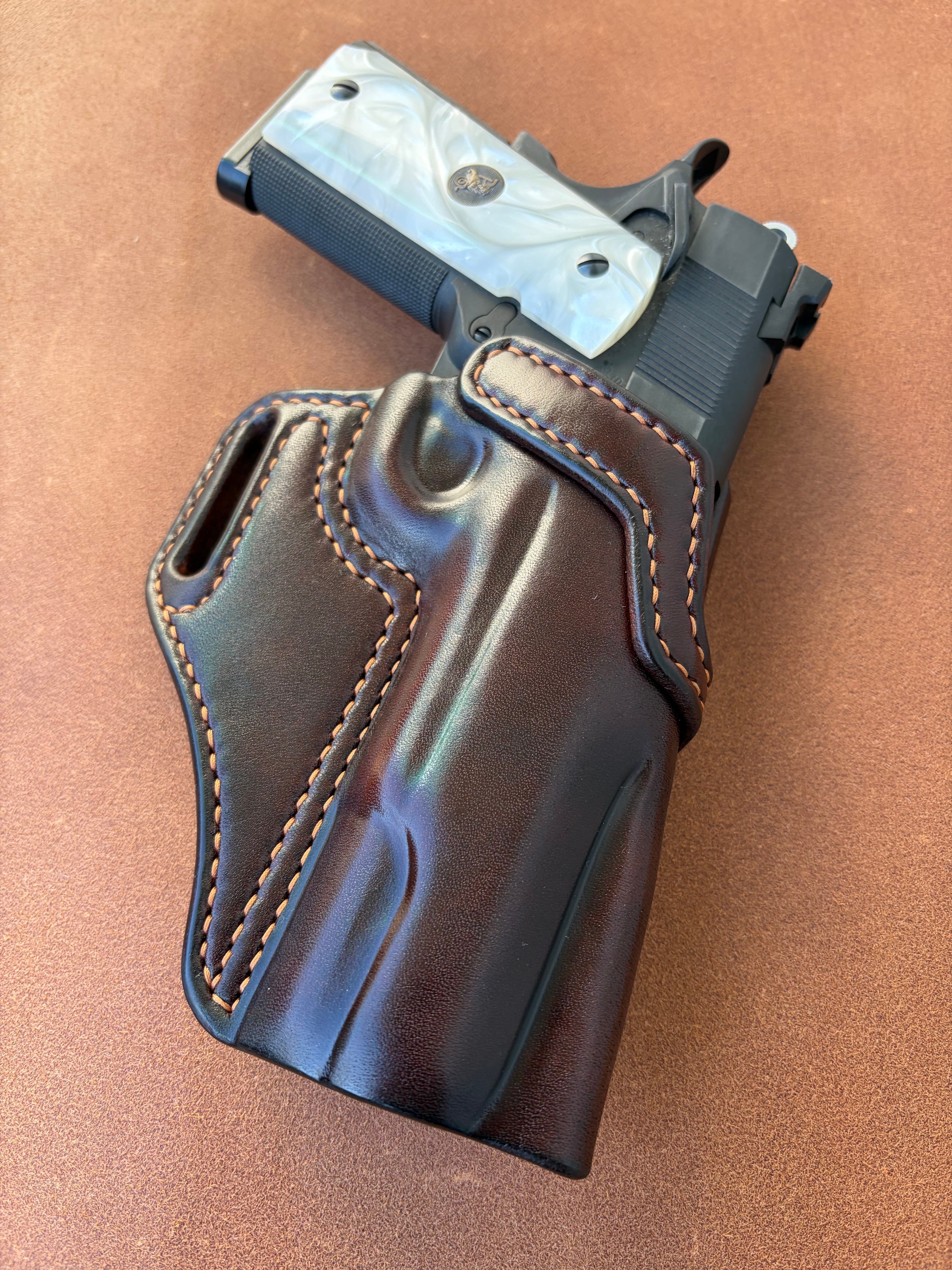 栃木レザー4mm厚(フルベジタブルタンニン鞣 ヌメ革)を切り出しウォールナットブラウン染色を行いウエットフォーミングでフィッティングしておりスムーズにリホルスター可能です