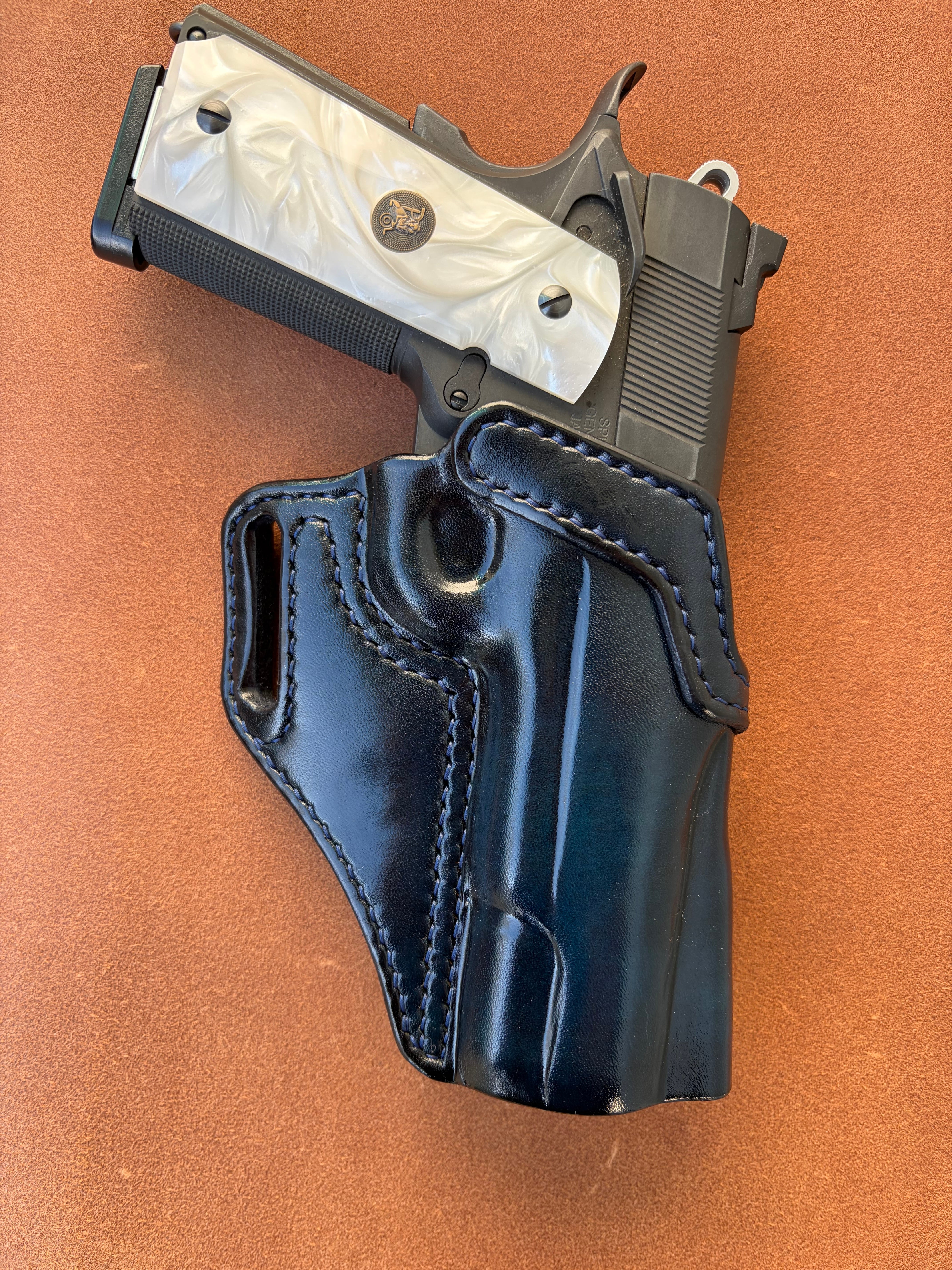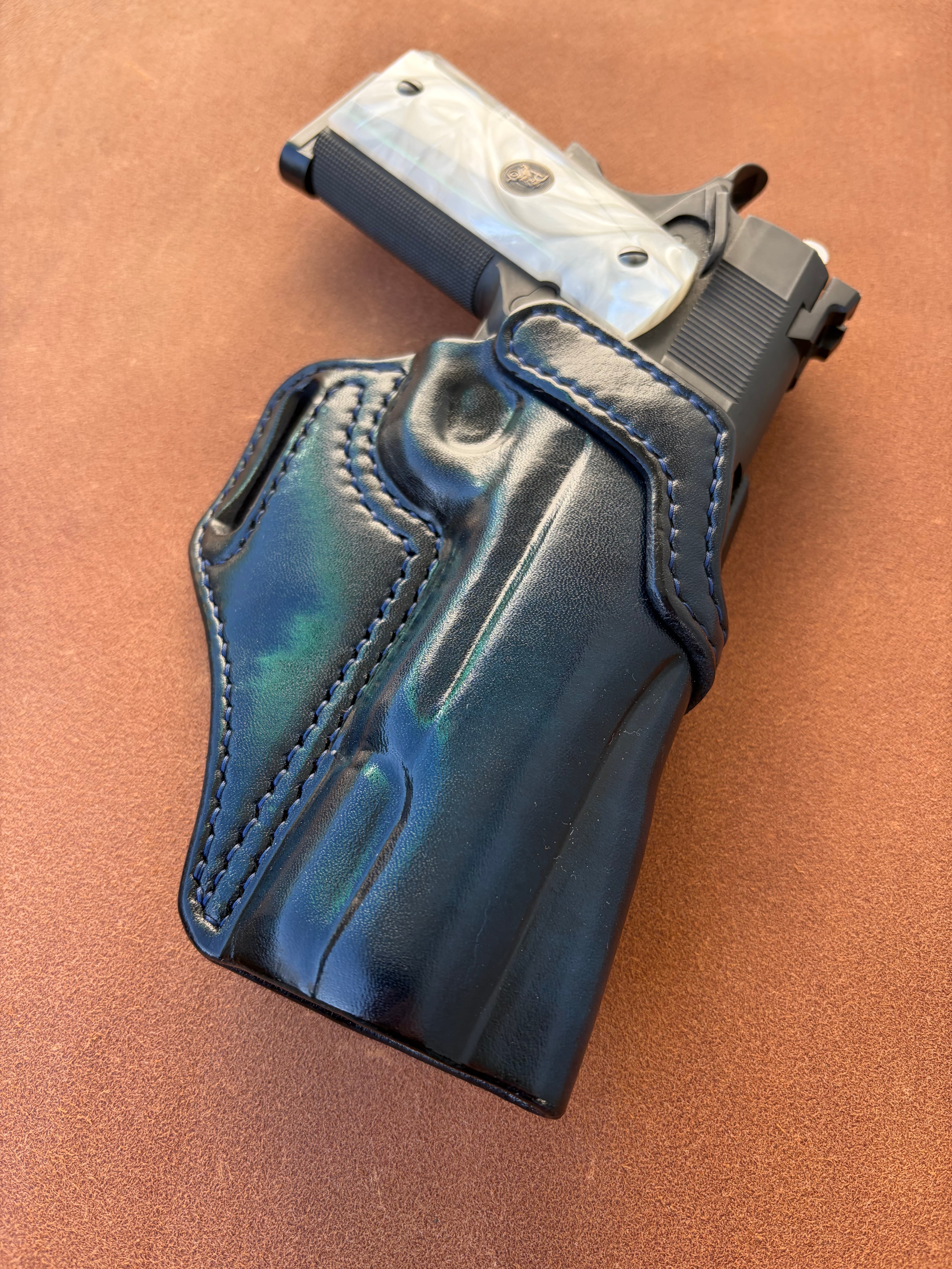 栃木レザー4mm厚(フルベジタブルタンニン鞣 ヌメ革)を切り出しロイヤルブルー染色を行いウエットフォーミングでフィッティングしておりスムーズにリホルスター可能です