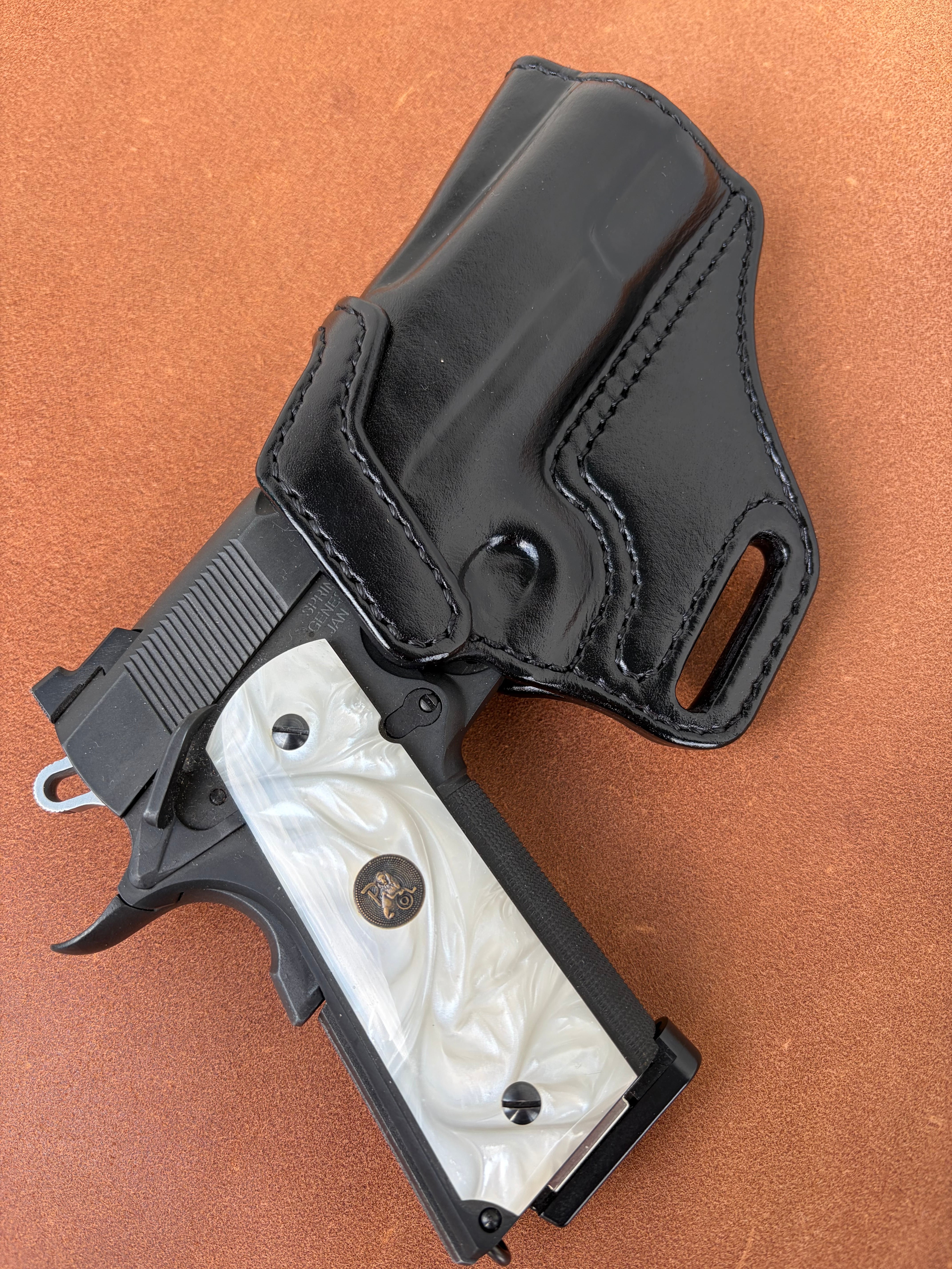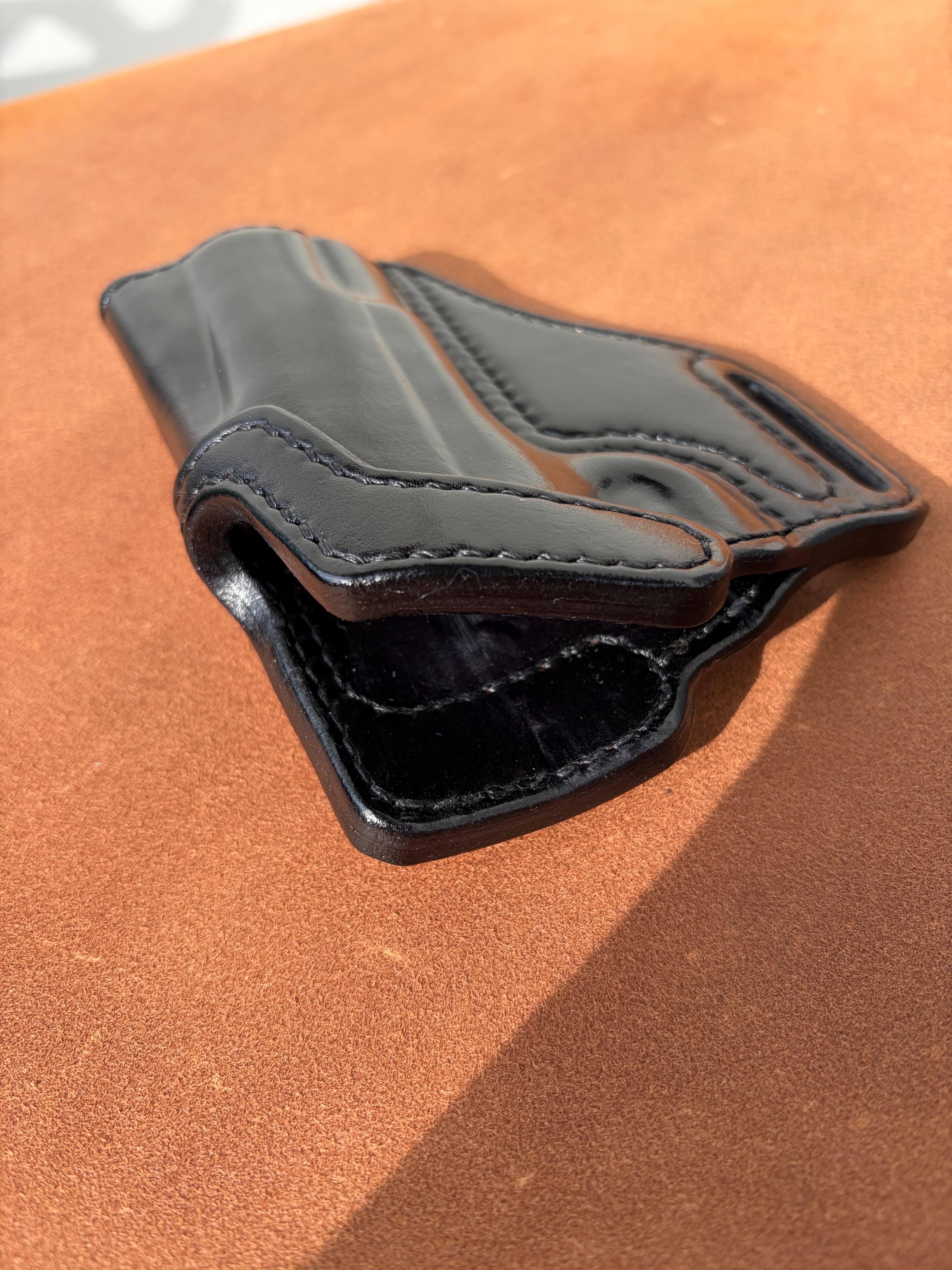 栃木レザーフルベジタブルタンニン鞣 ヌメ革を切り出し黒染色を行いウエットフォーミングでフィッティングしておりスムーズにリホルスター可能です