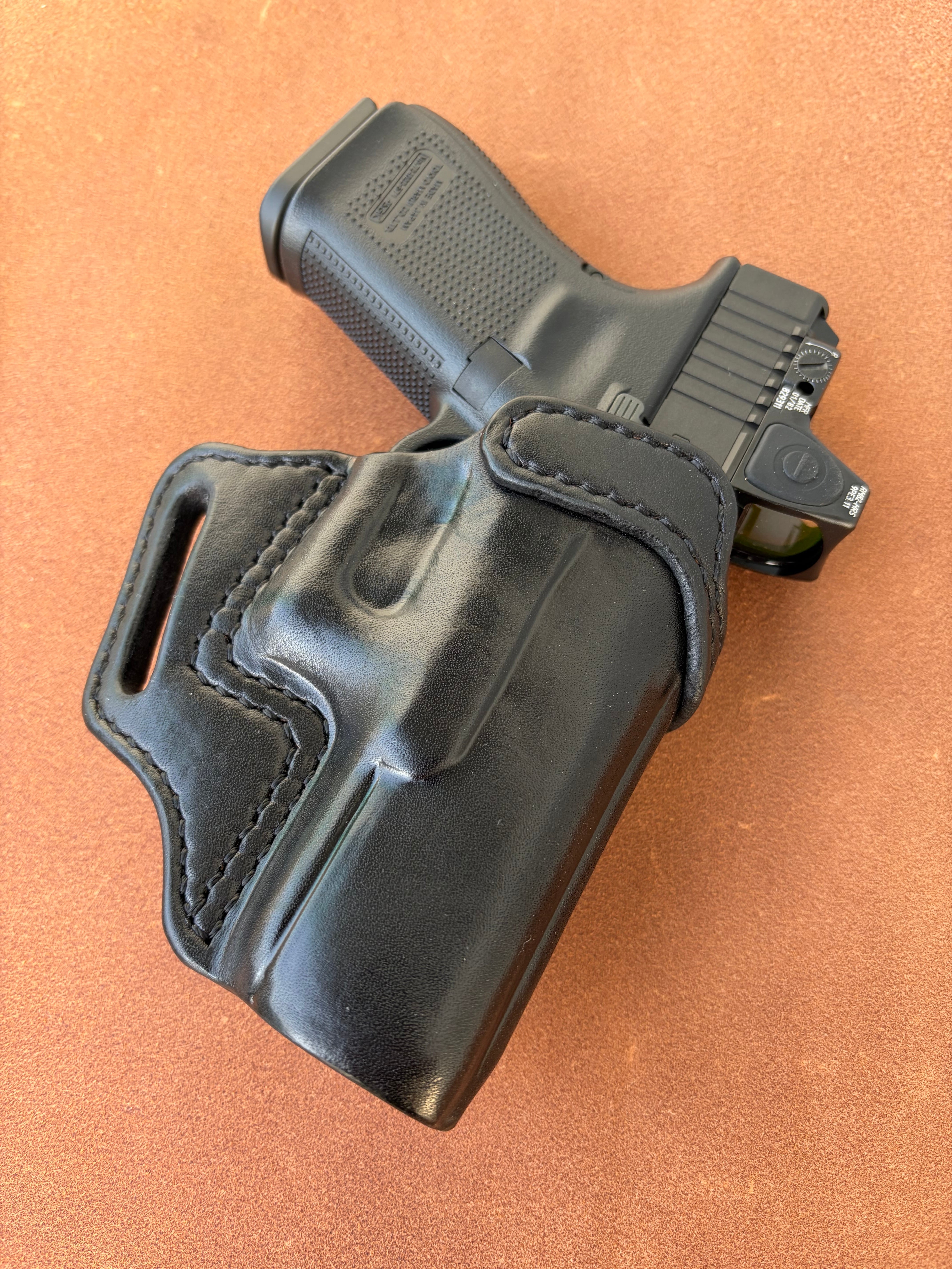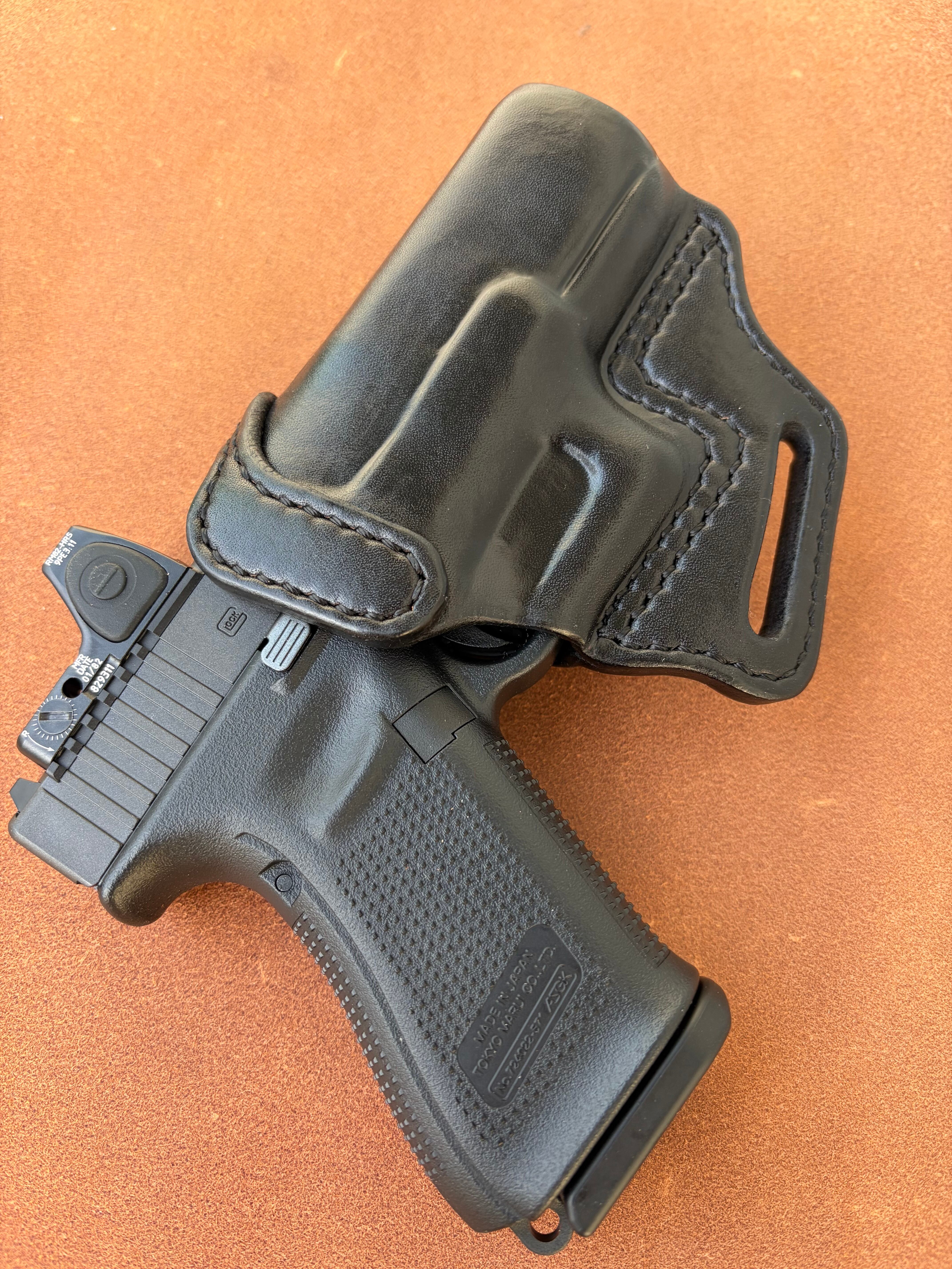 栃木レザー4mm厚(フルベジタブルタンニン鞣 ヌメ革)を切り出し黒染色を行いウエットフォーミングでフィッティングしておりスムーズにリホルスター可能です