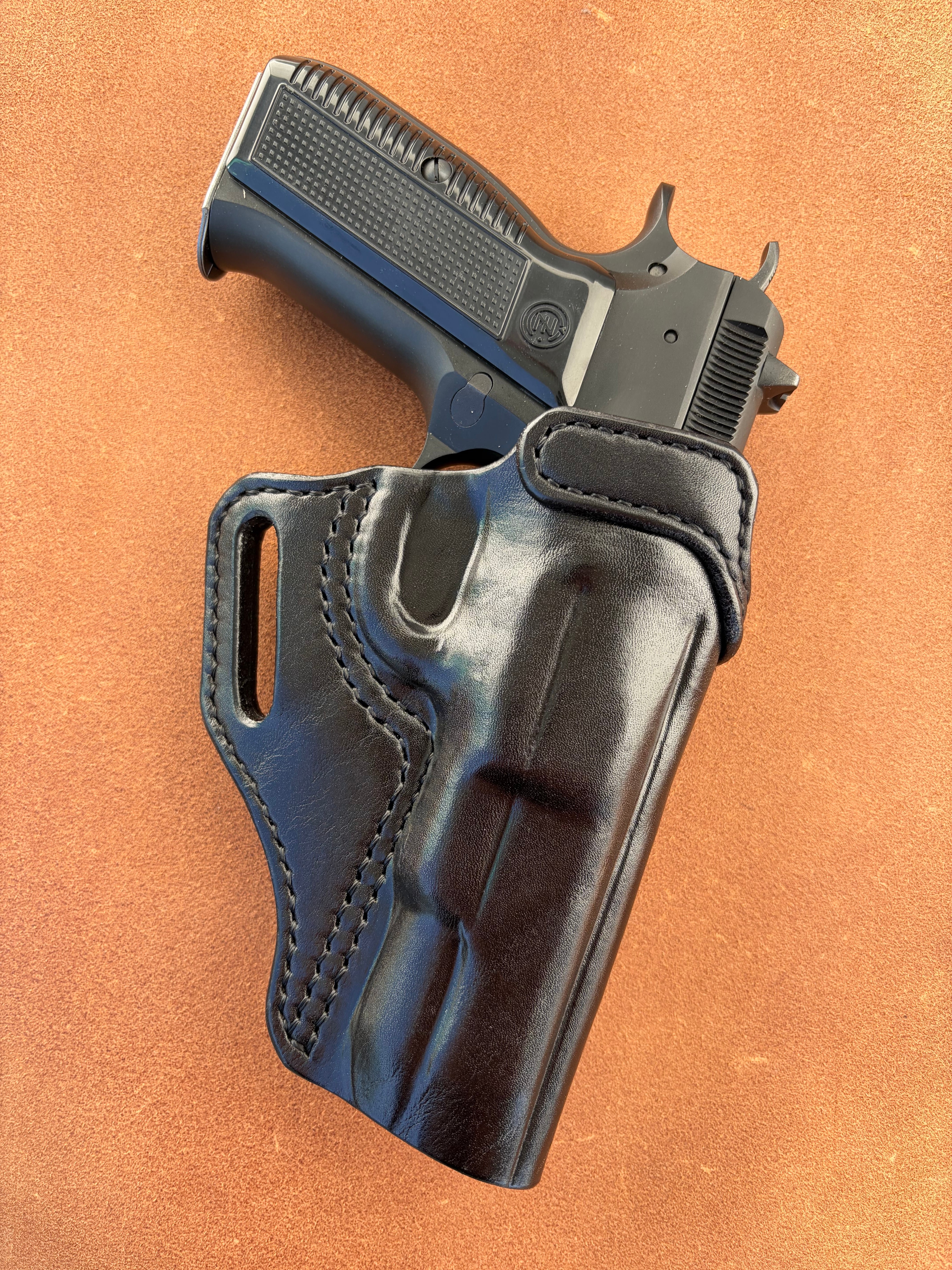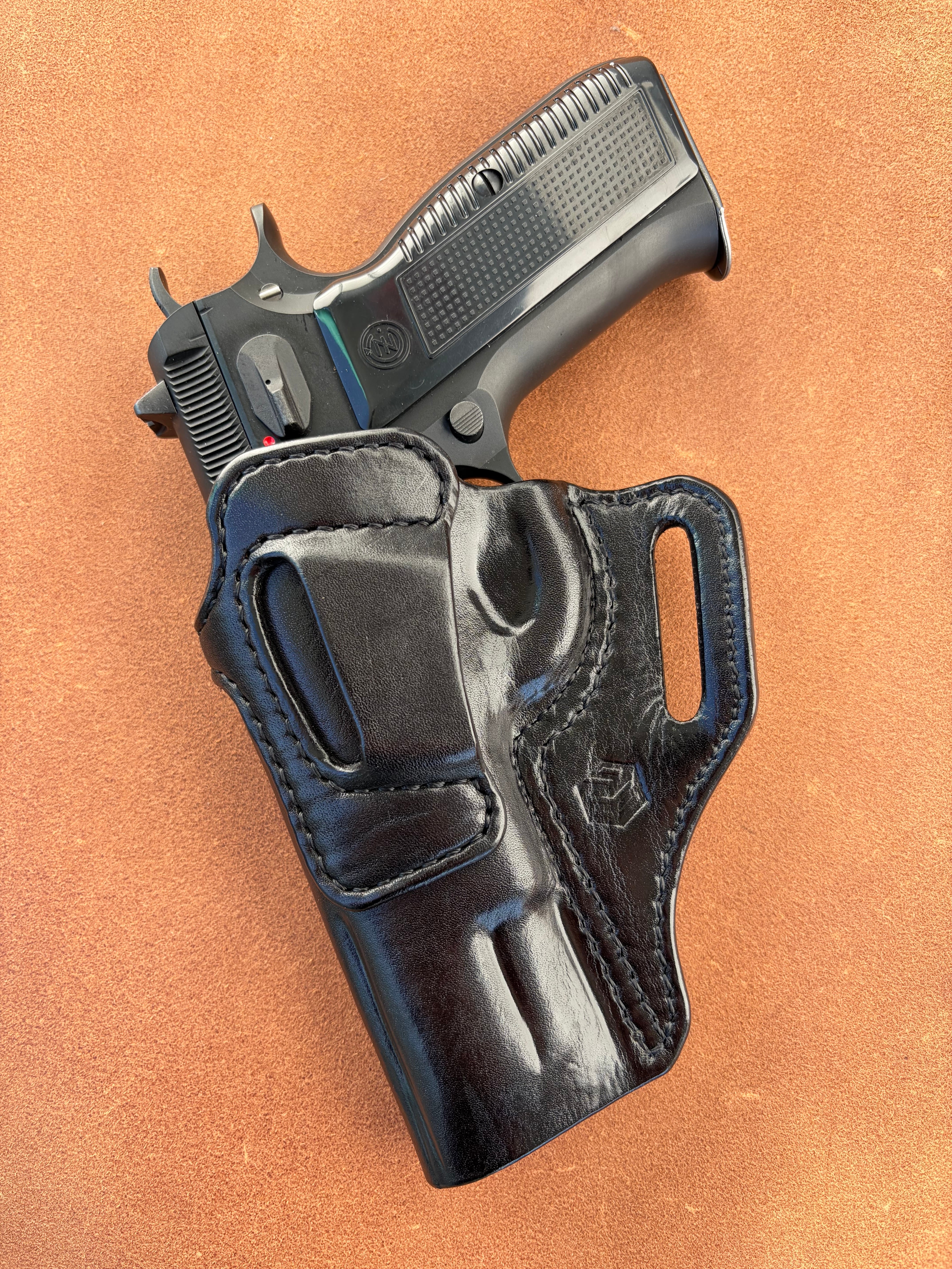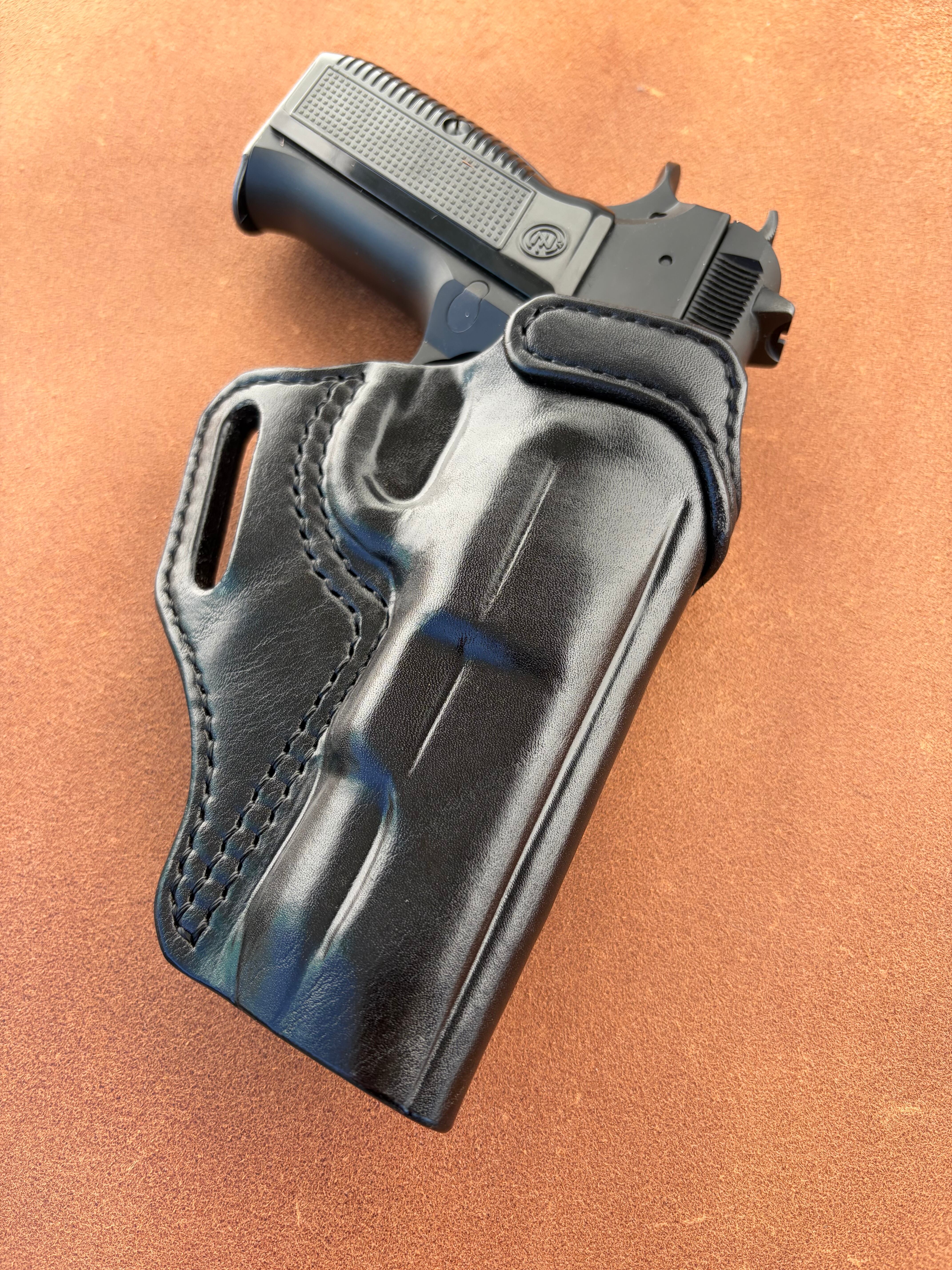 栃木レザー4mm厚(フルベジタブルタンニン鞣 ヌメ革)を切り出し黒染色を行いウエットフォーミングでフィッティングしておりスムーズにリホルスター可能です