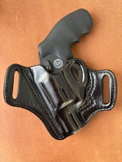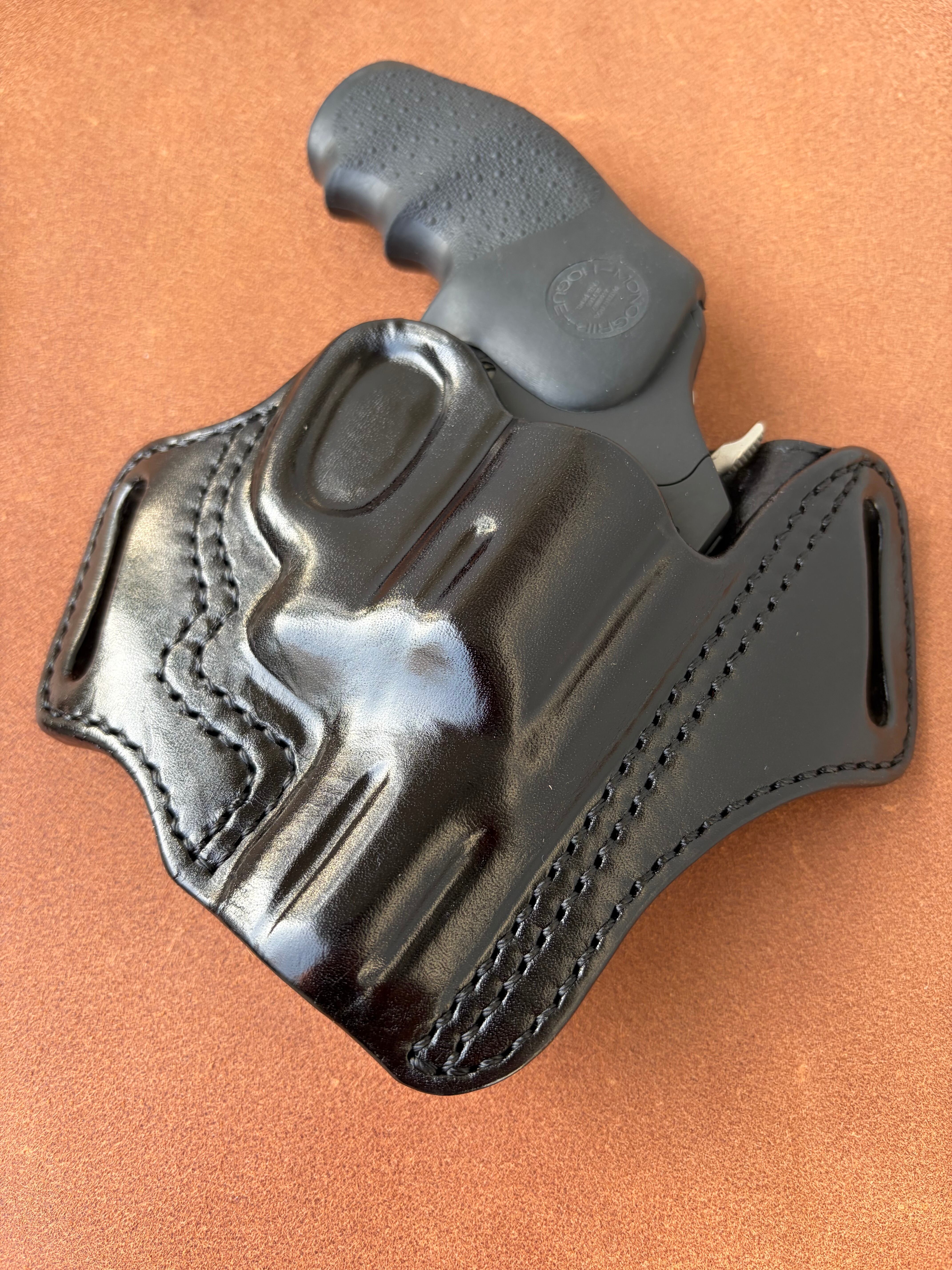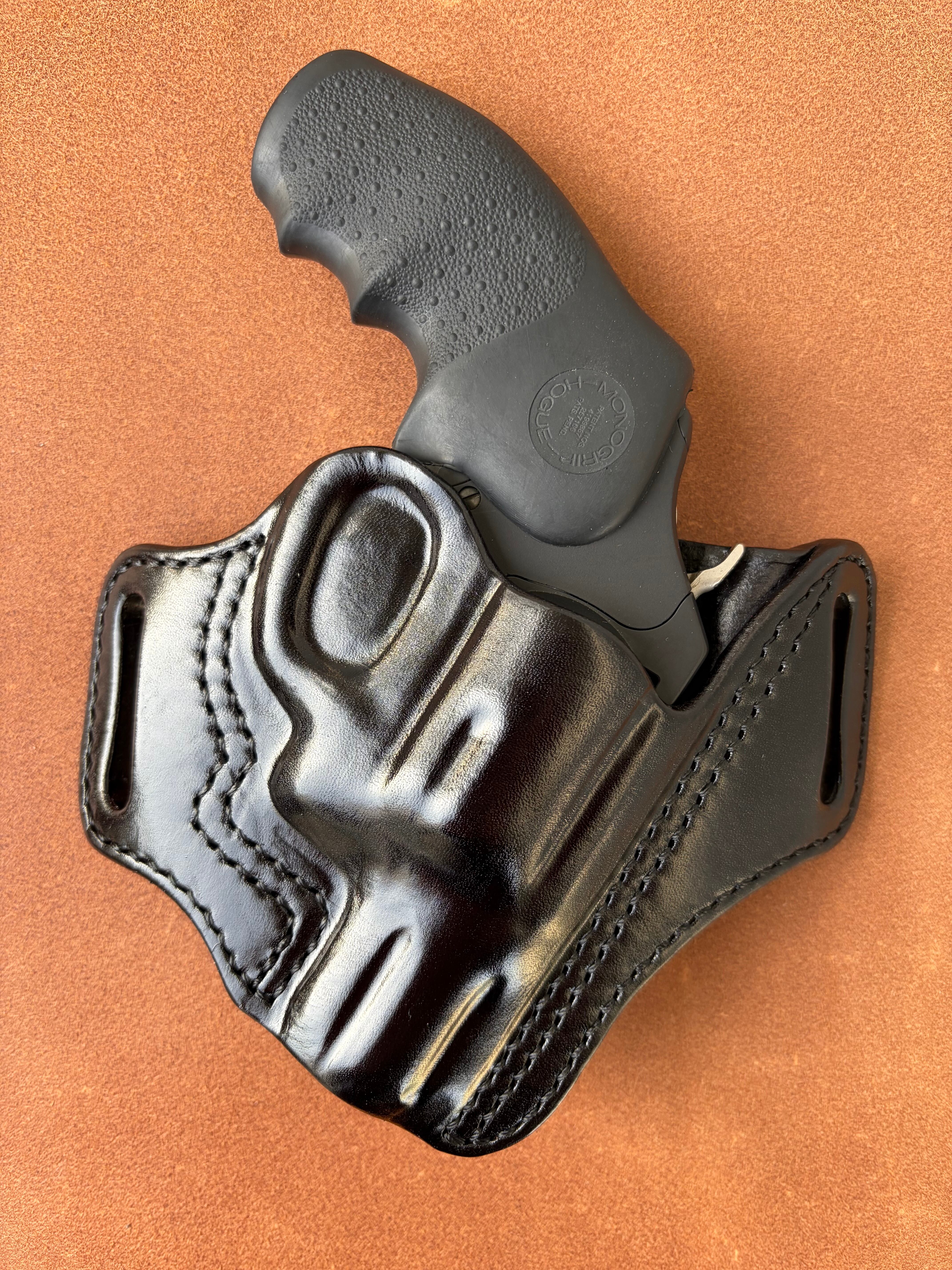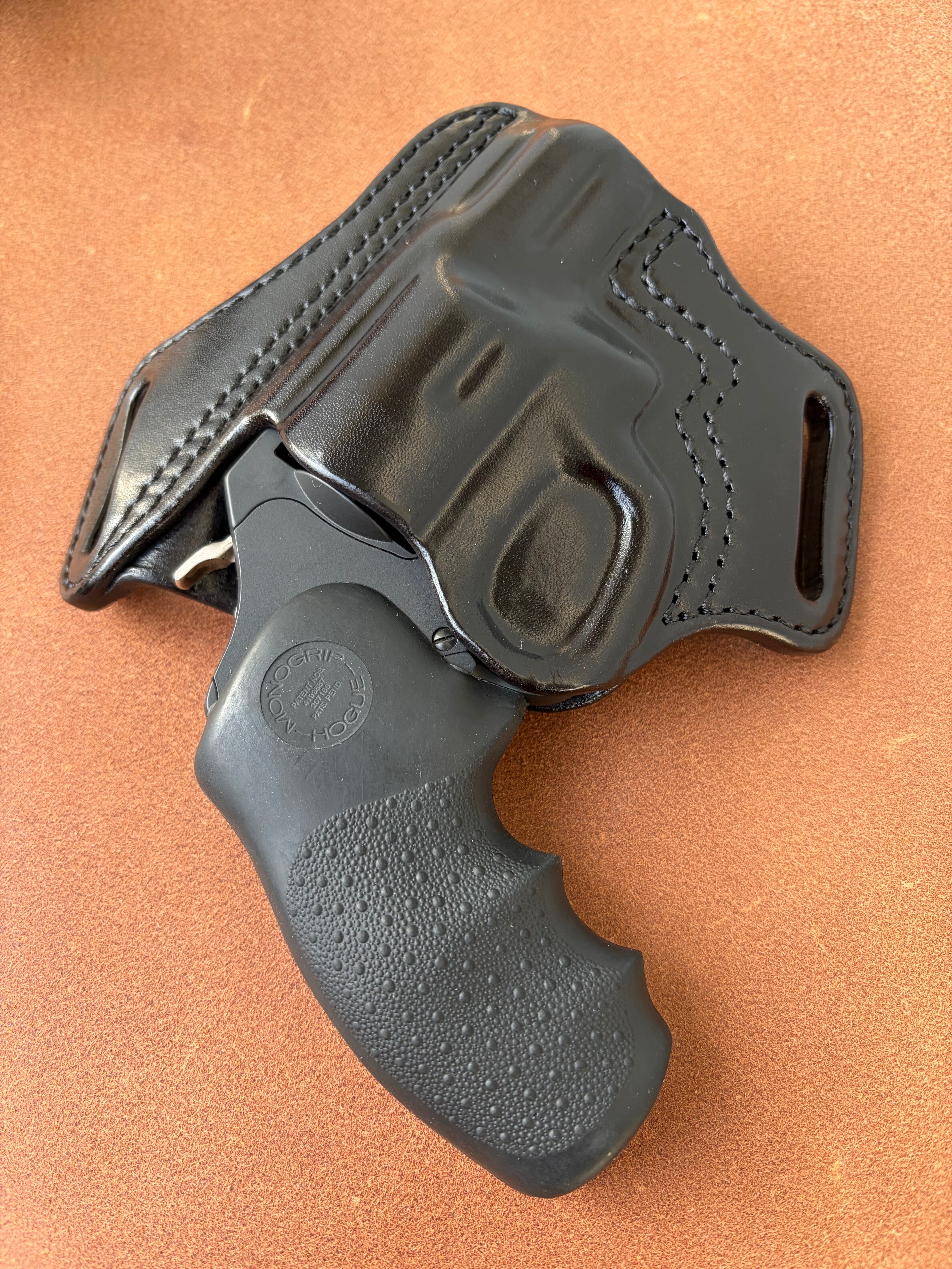 栃木レザー4mm厚(フルベジタブルタンニン鞣 ヌメ革)を切り出し黒染色を行いウエットフォーミングでフィッティングしておりスムーズにリホルスター可能です