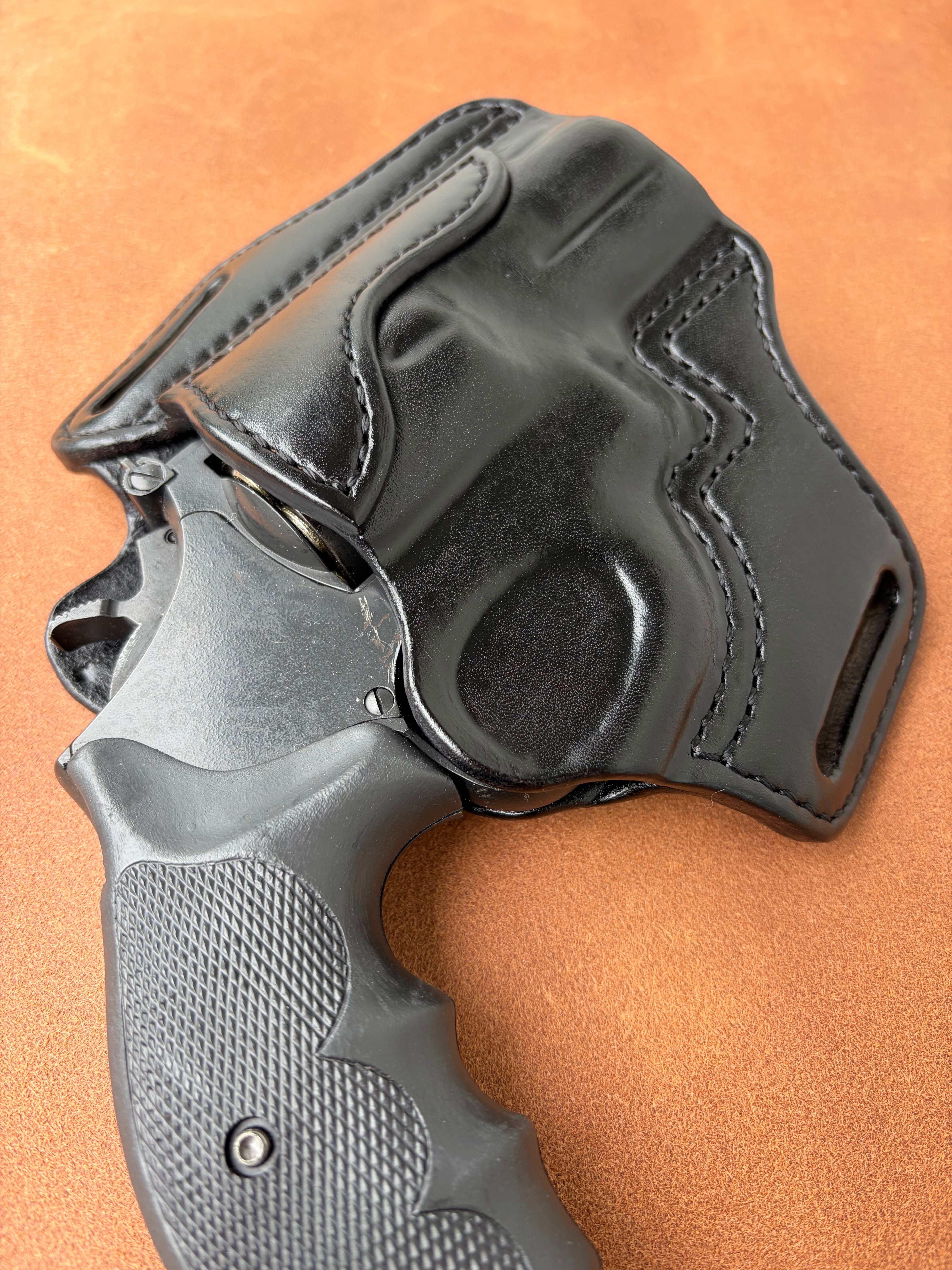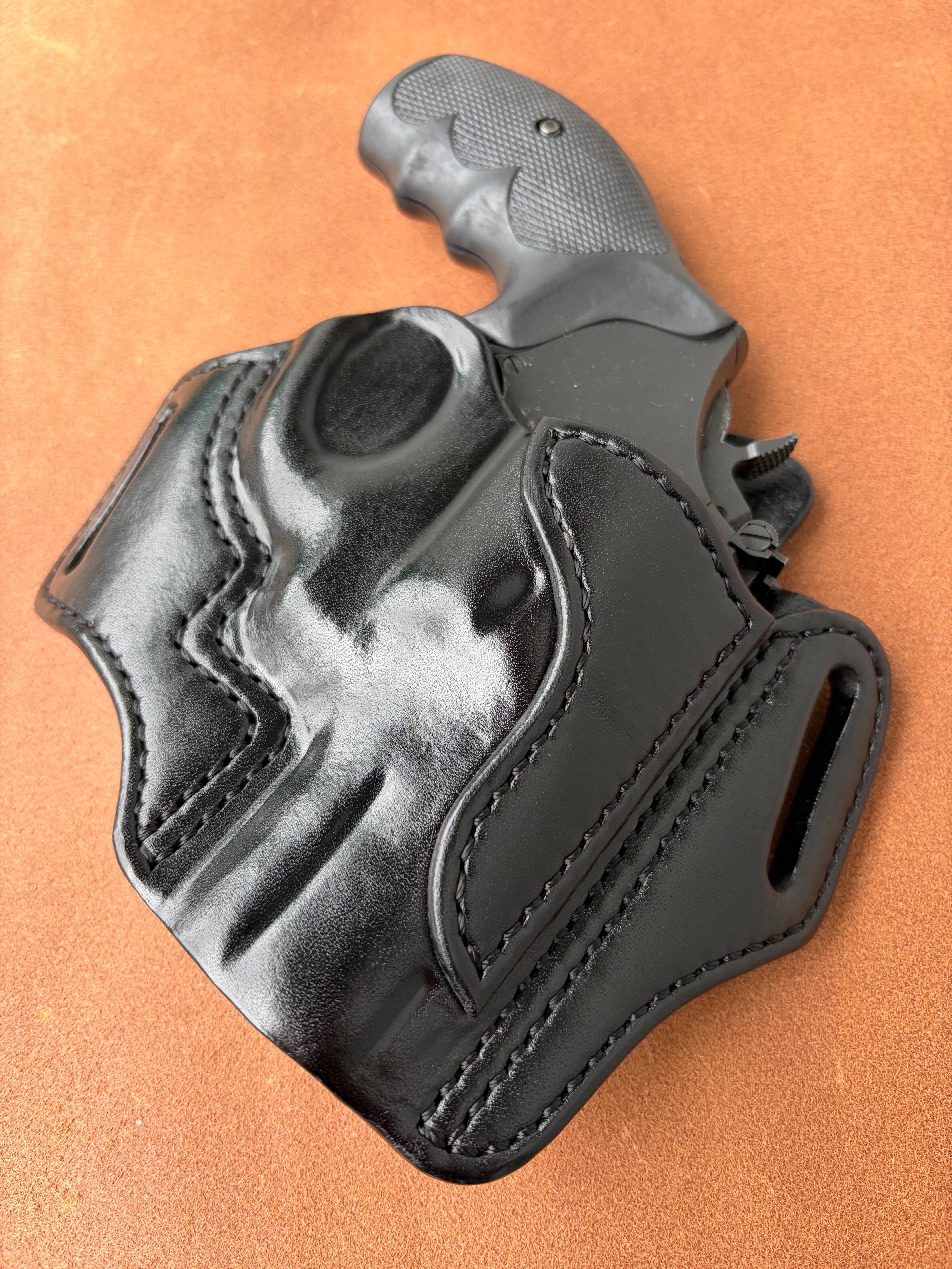 栃木レザー4mm厚(フルベジタブルタンニン鞣 ヌメ革)を切り出し黒染色を行いウエットフォーミングでフィッティングしておりスムーズにリホルスター可能です