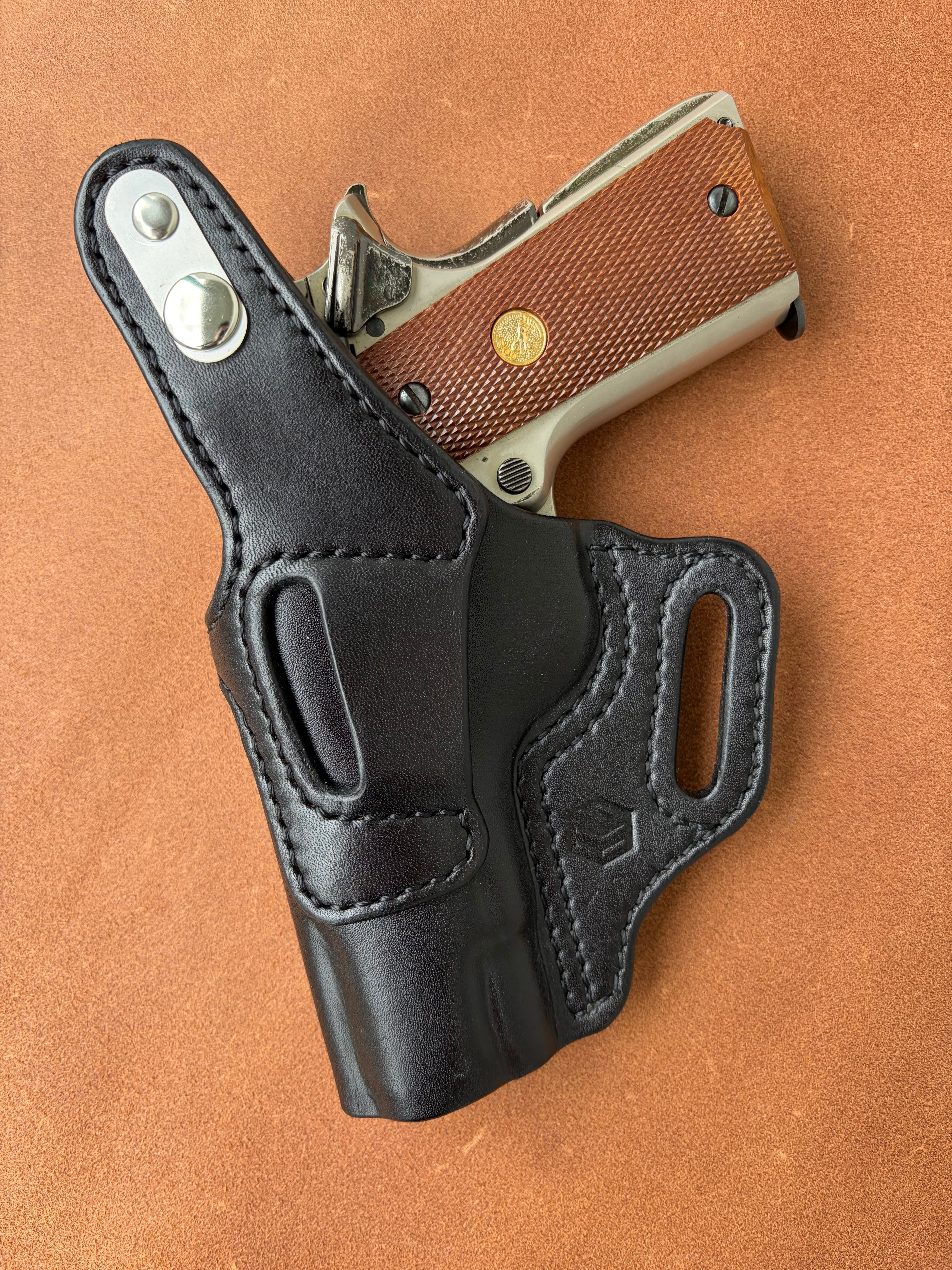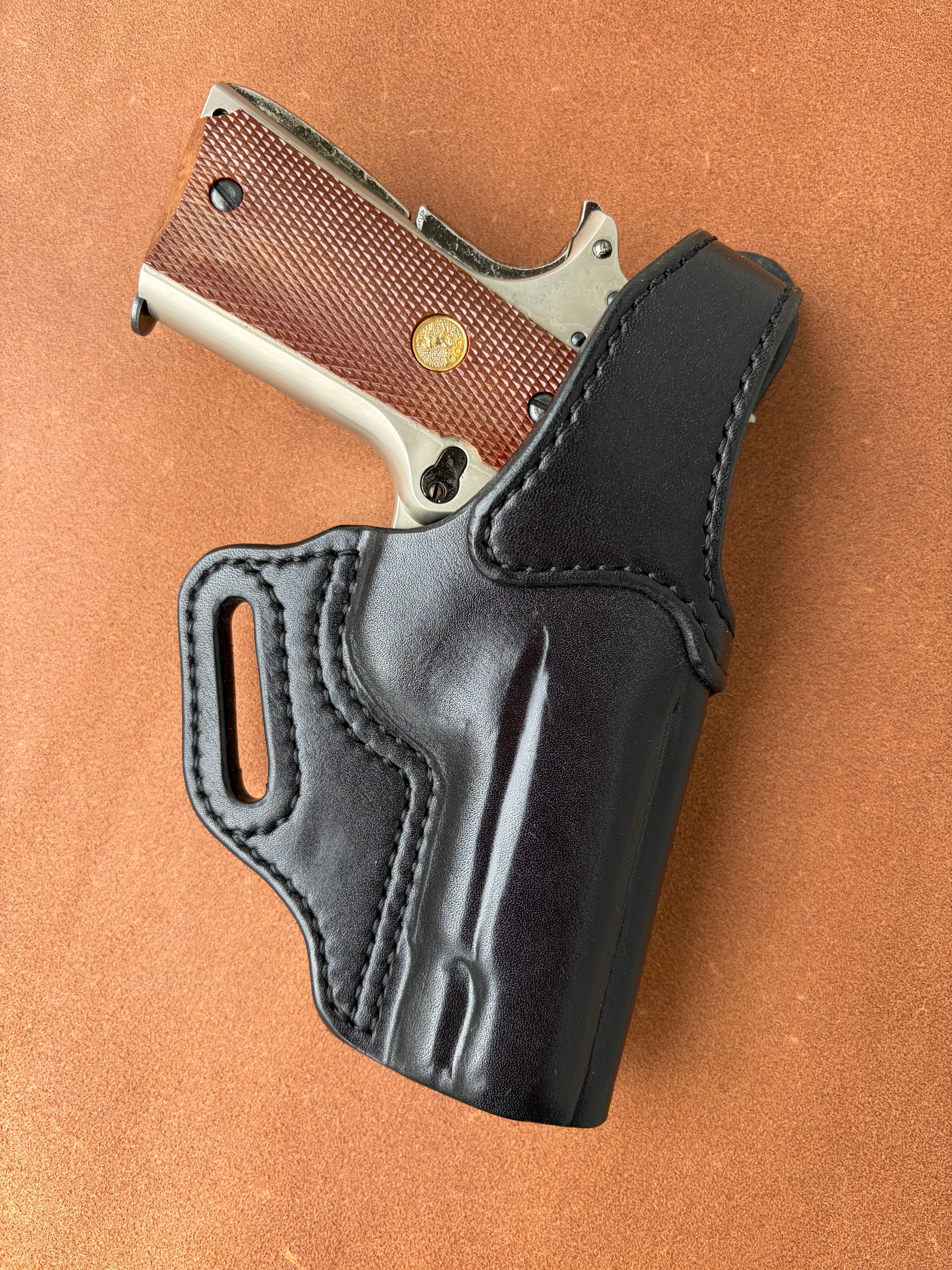 栃木レザー4mm厚(フルベジタブルタンニン鞣 ヌメ革)を切り出し黒染色を行いウエットフォーミングでフィッティングしておりスムーズにリホルスター可能です