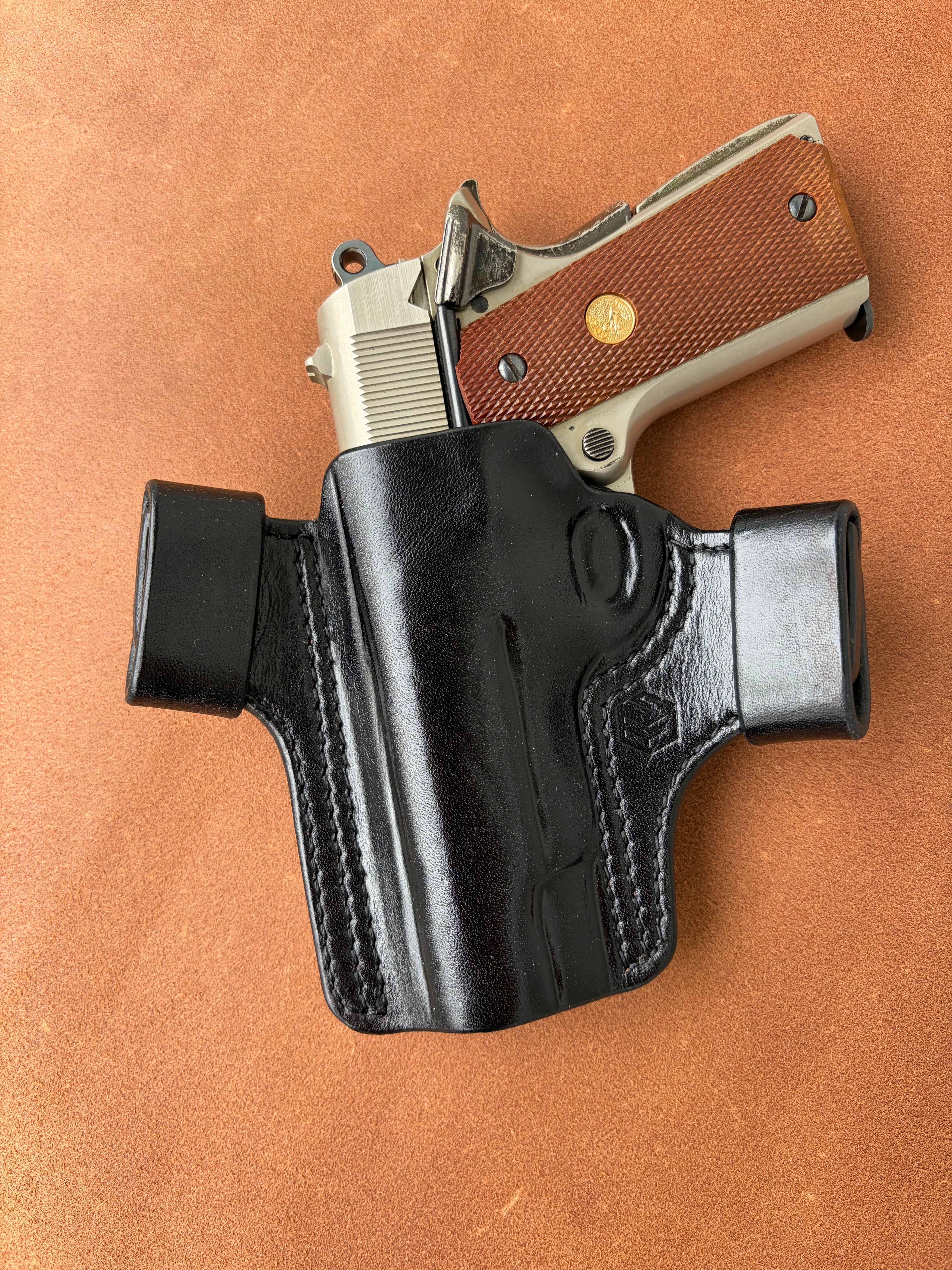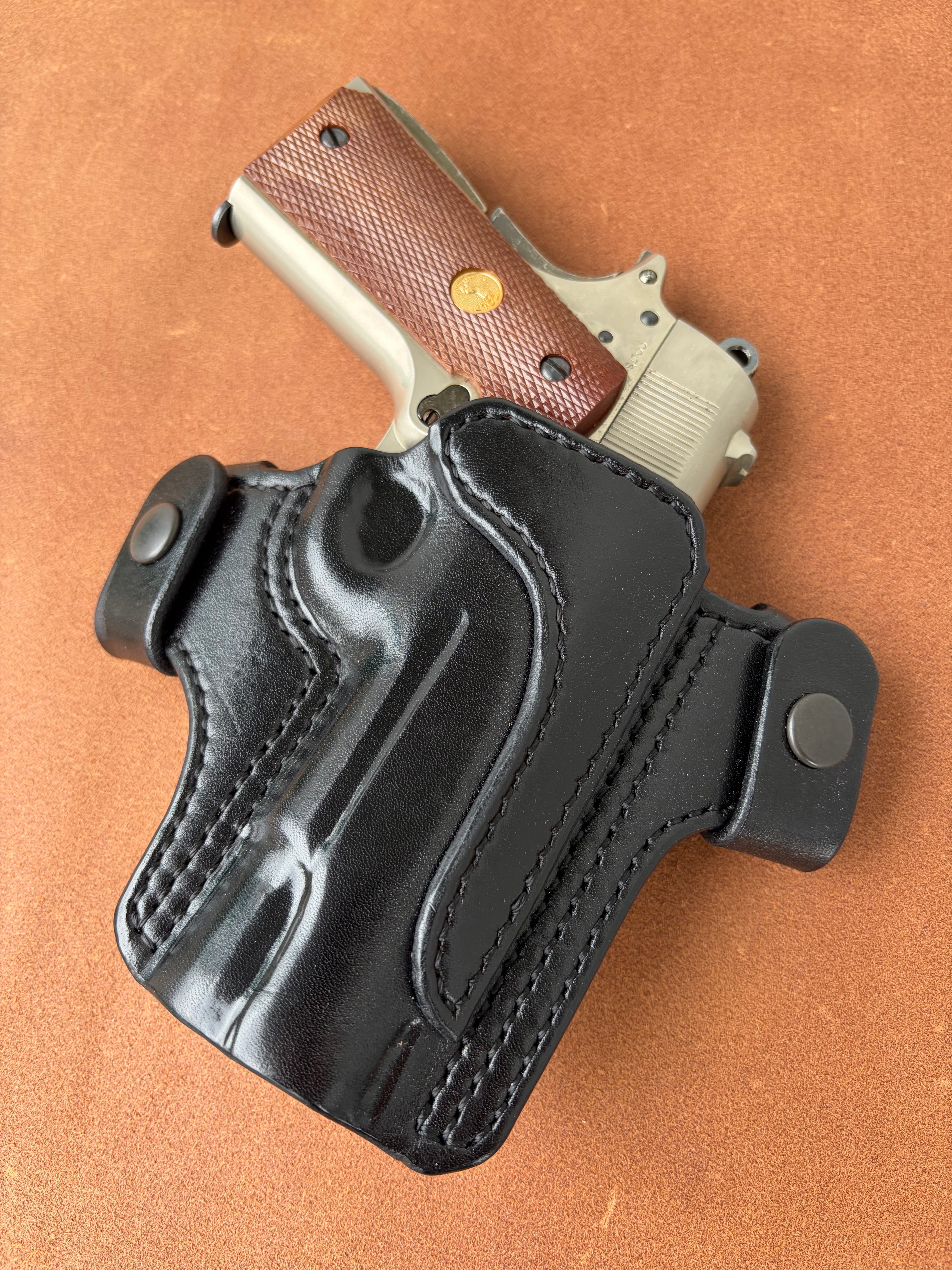 栃木レザー4mm厚(フルベジタブルタンニン鞣 ヌメ革)を切り出し黒染色を行いウエットフォーミングでフィッティングしておりスムーズにリホルスター可能です