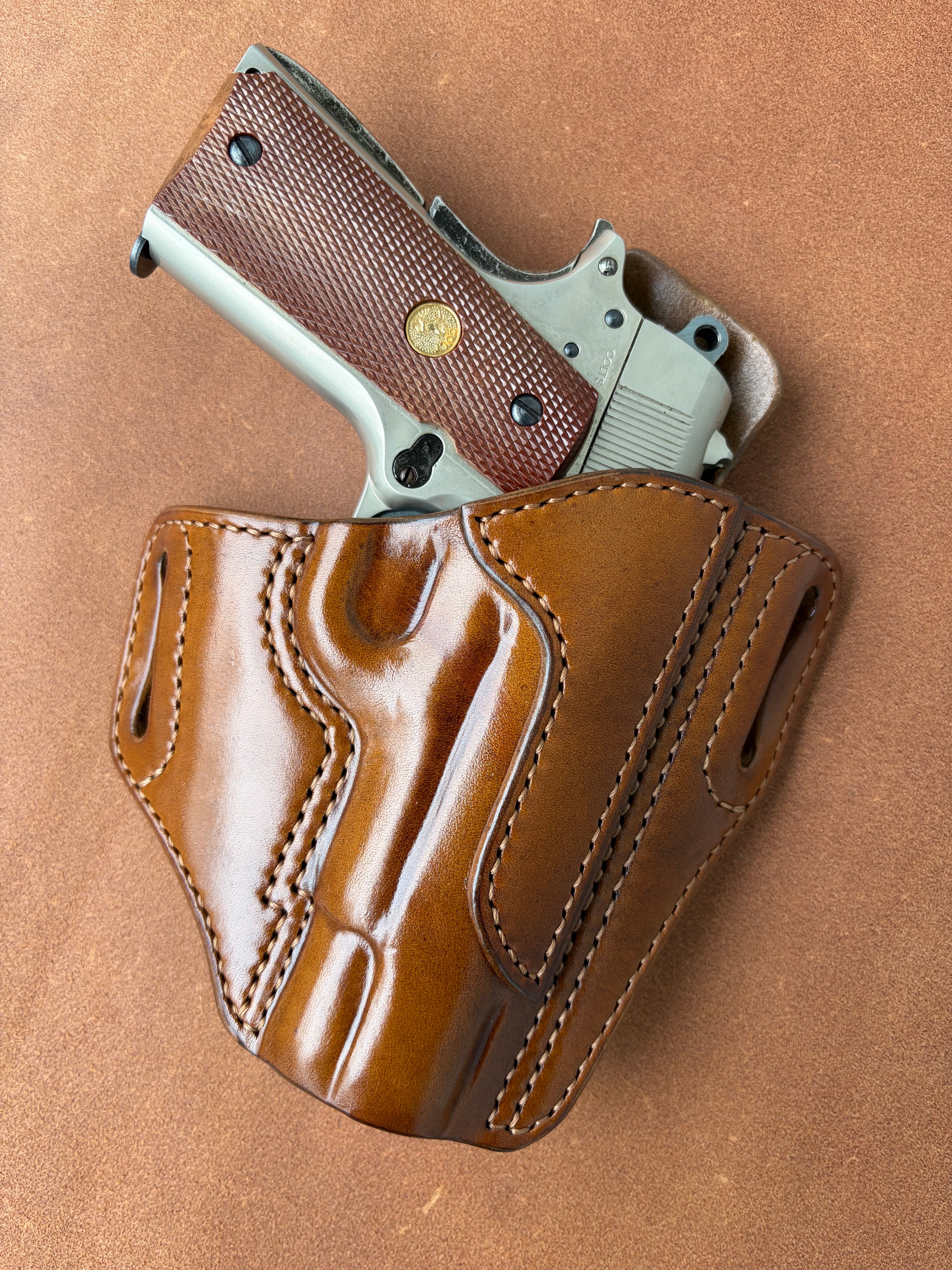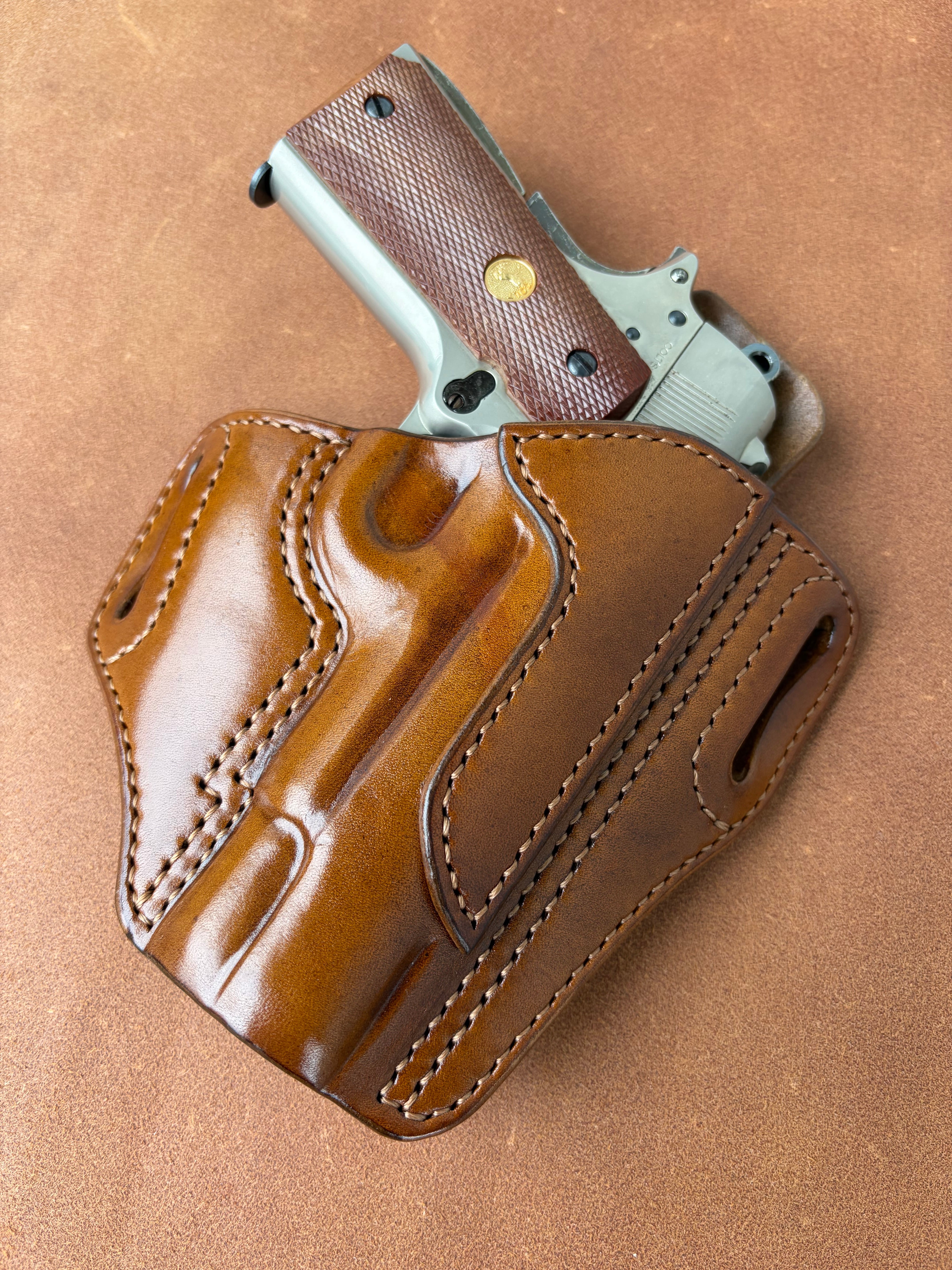 栃木レザー4mm厚(フルベジタブルタンニン鞣 ヌメ革)を切り出しライトブラウン染色を行いウエットフォーミングでフィッティングしておりスムーズにリホルスター可能です