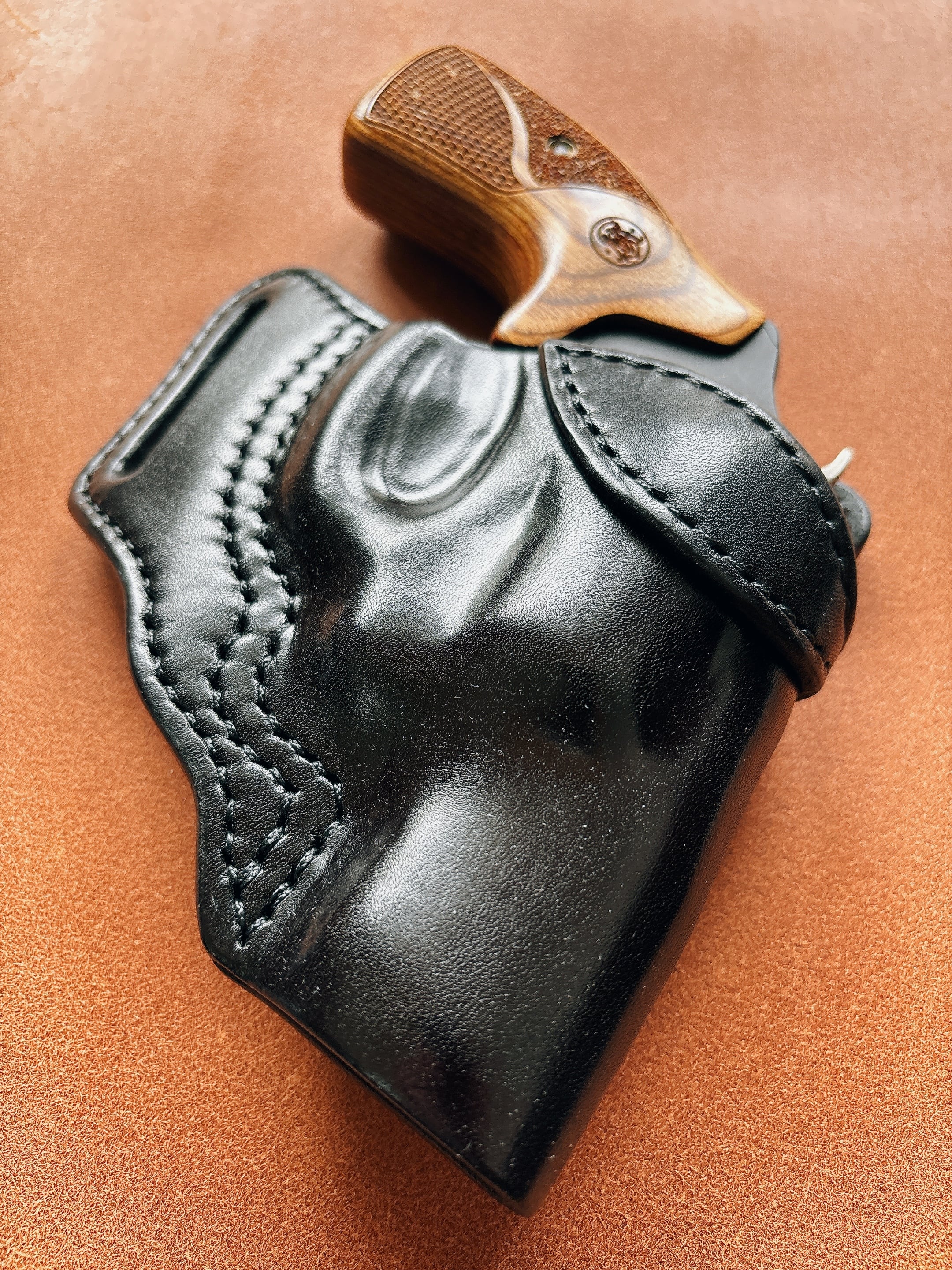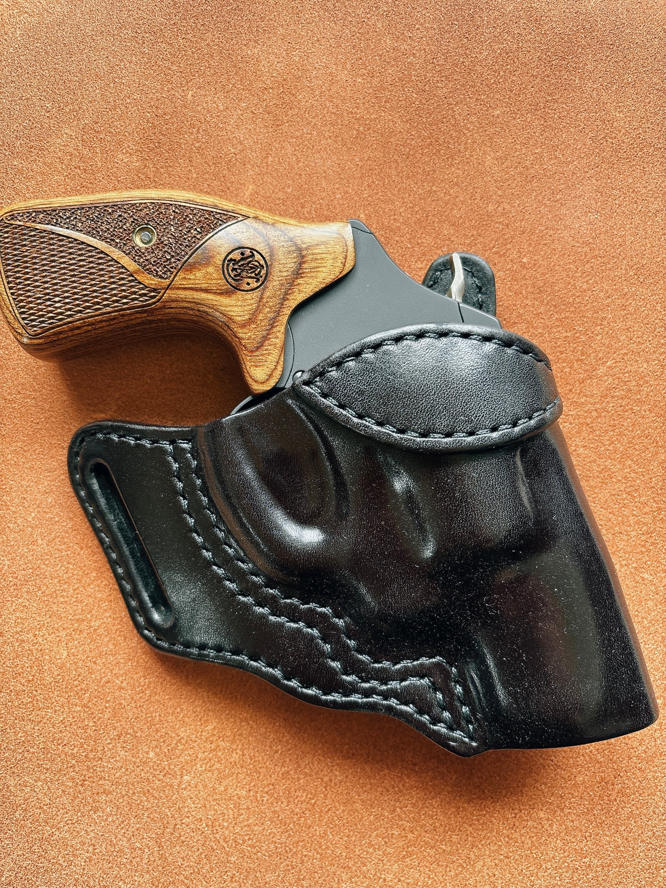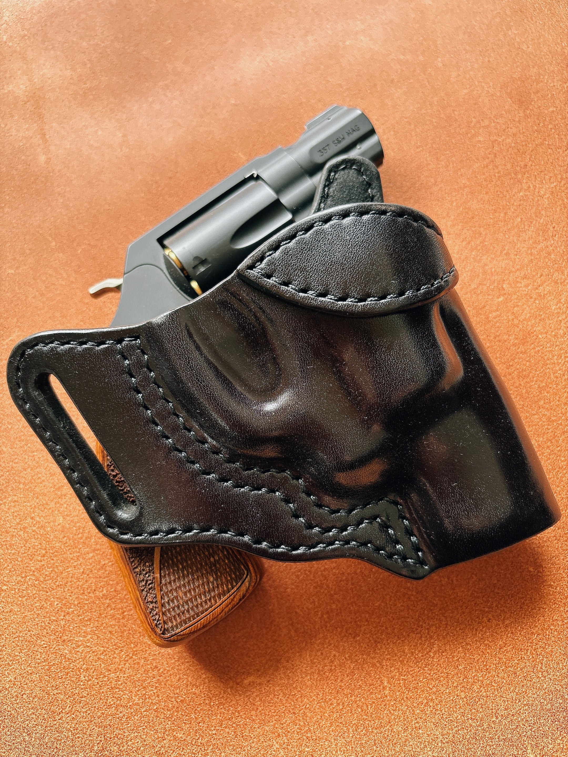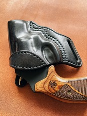 黒染め染色を行いウエットフォーミングにより整形しており銃の形状にフィットさせておりますので抜き易く、ホールド感がありホルスターから銃が脱落する事はありません