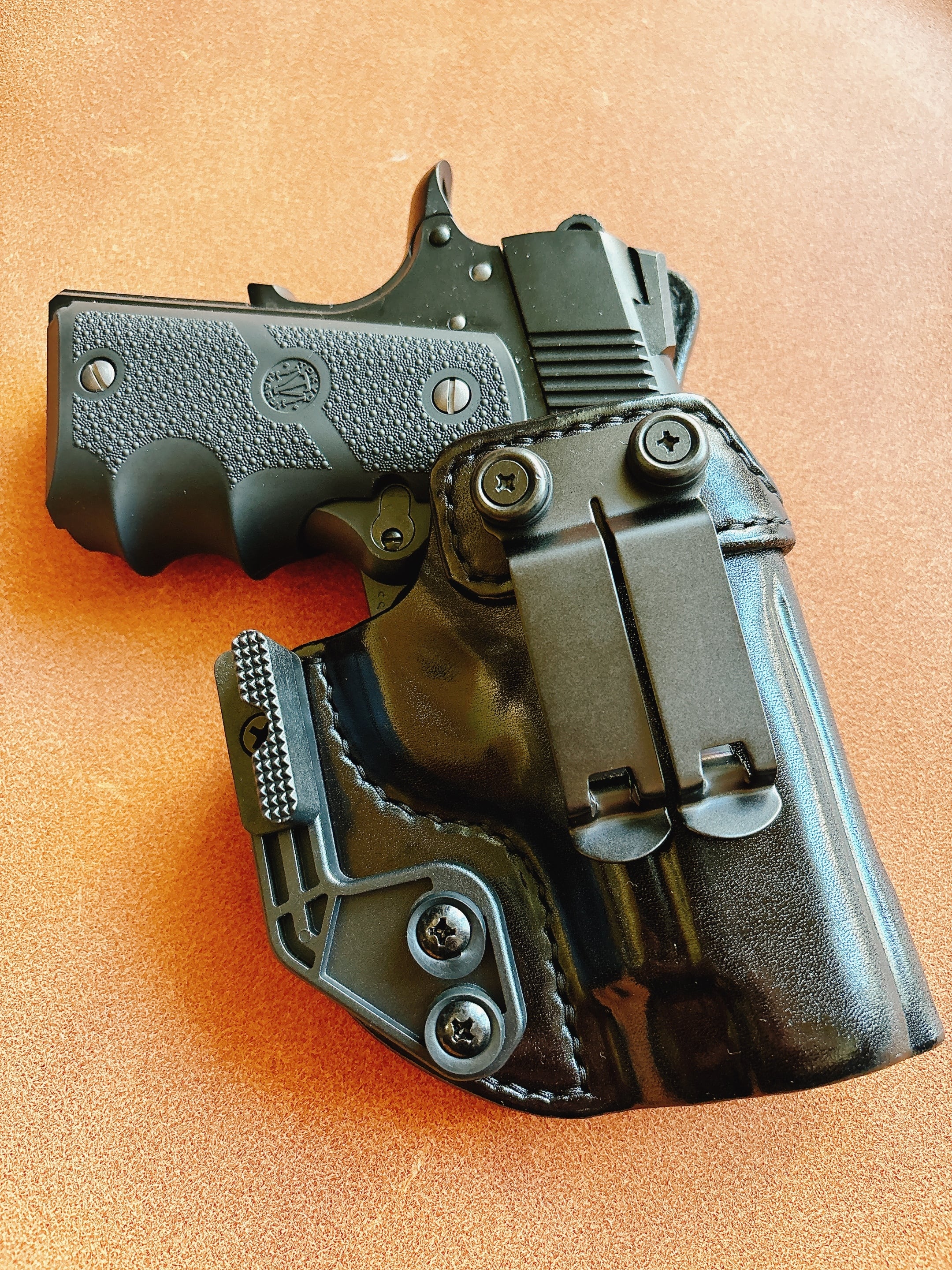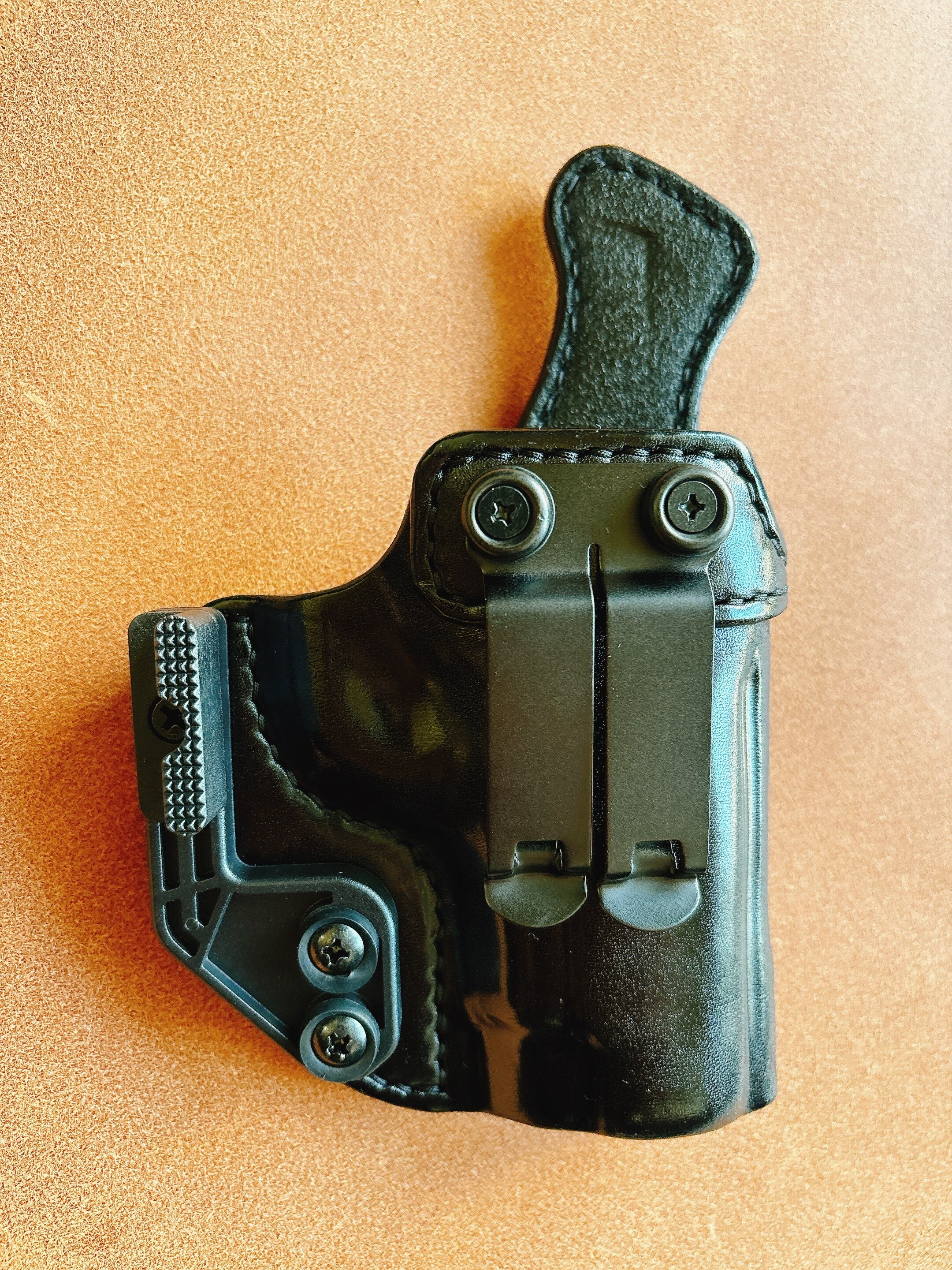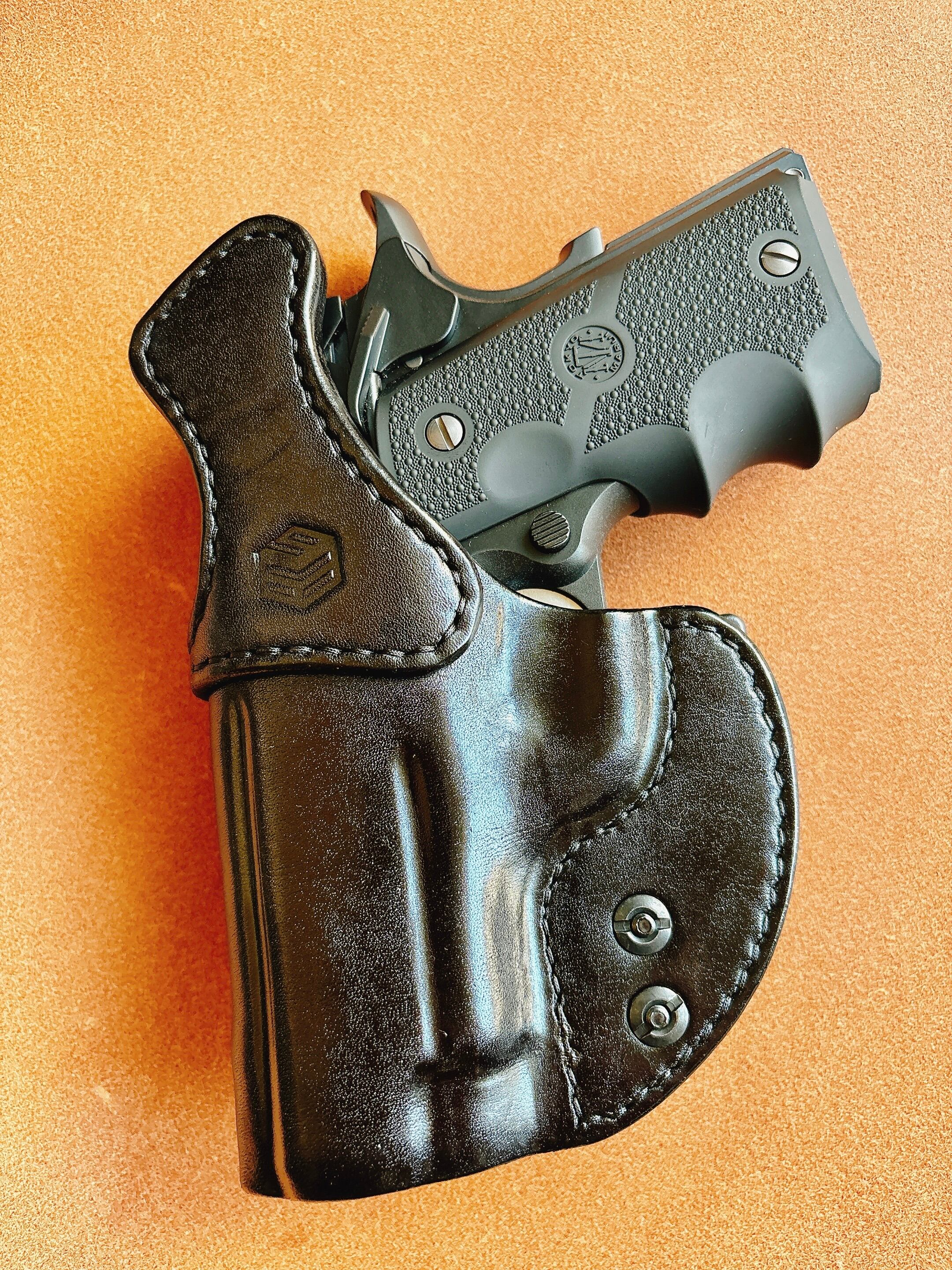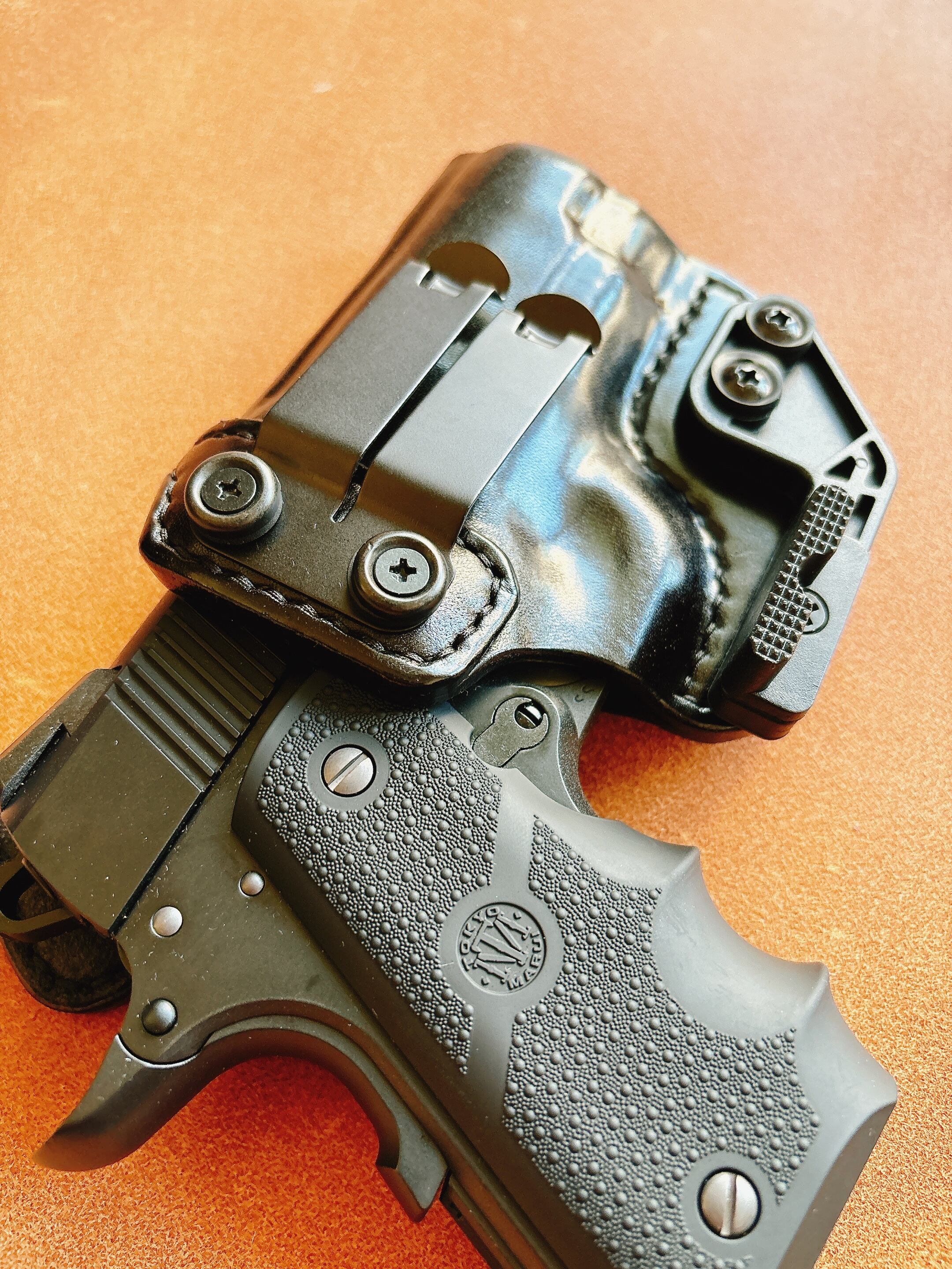 栃木レザー4mm厚(フルベジタブルタンニン鞣 ヌメ革)を切り出し黒色染色を行いウエットフォーミングでフィッティングしておりスムーズにリホルスター可能です