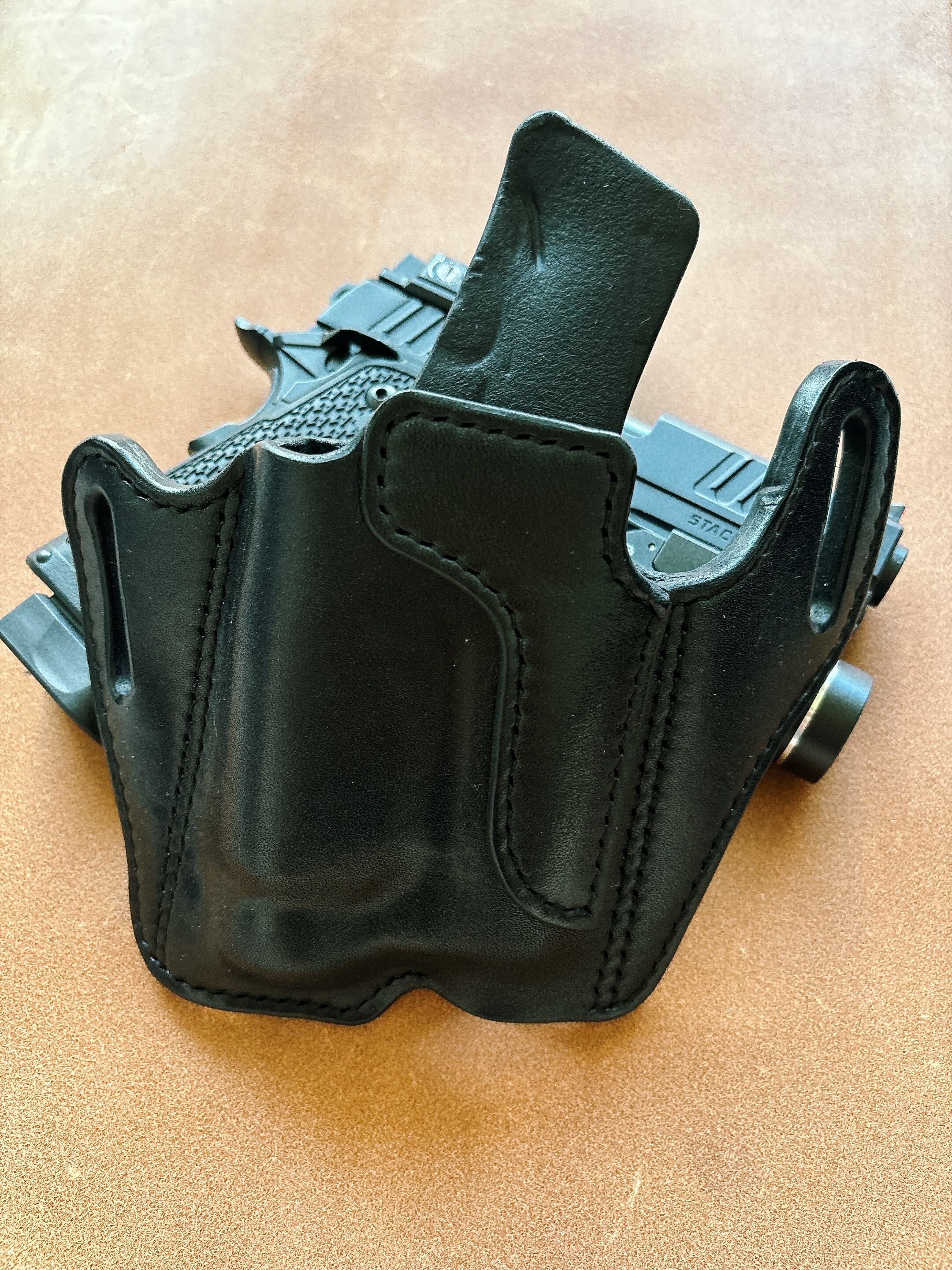 栃木レザー4mm厚(フルベジタブルタンニン鞣 ヌメ革)を切り出し黒染色を行いウエットフォーミングでフィッティングしておりスムーズにリホルスター可能です