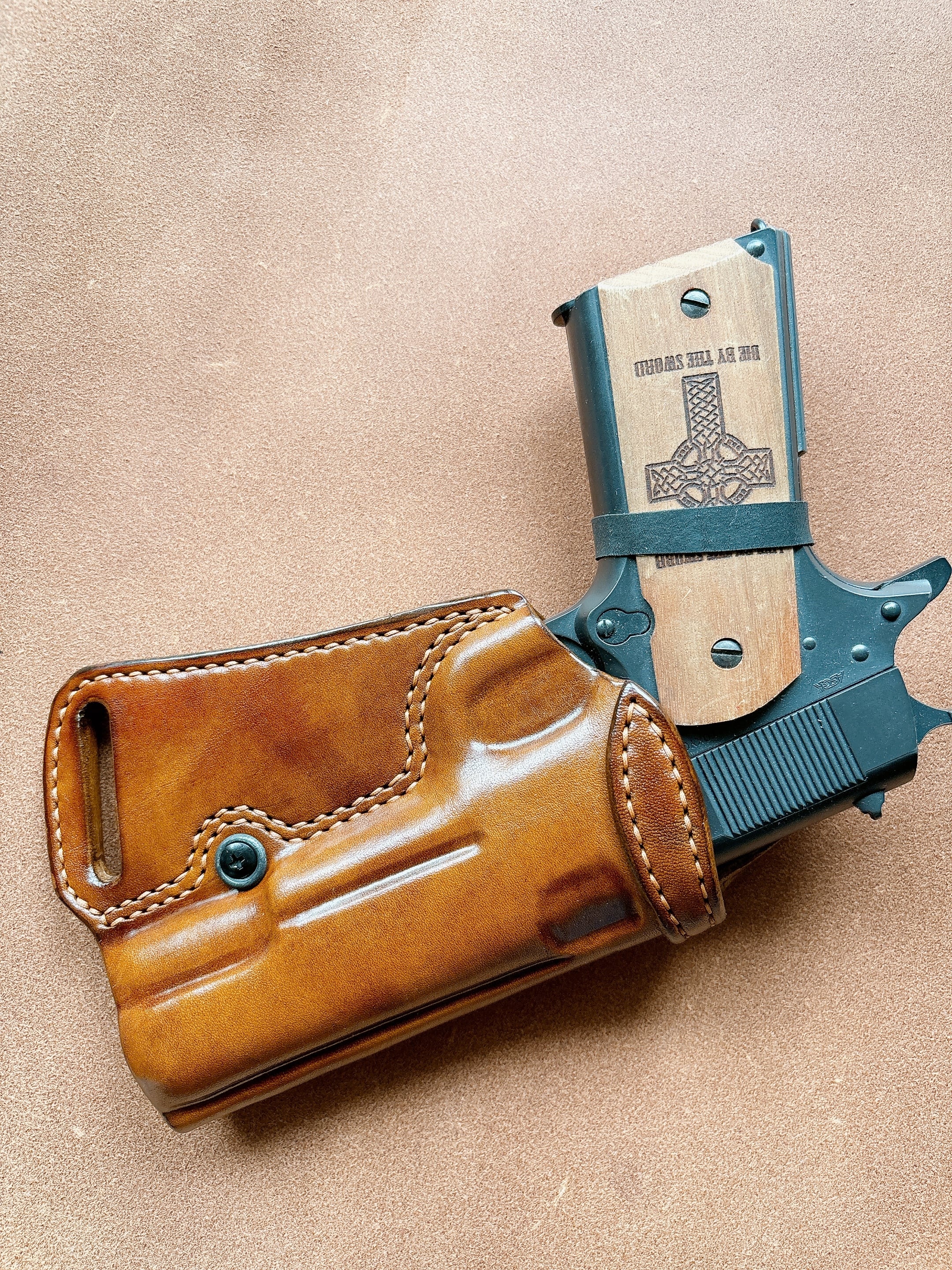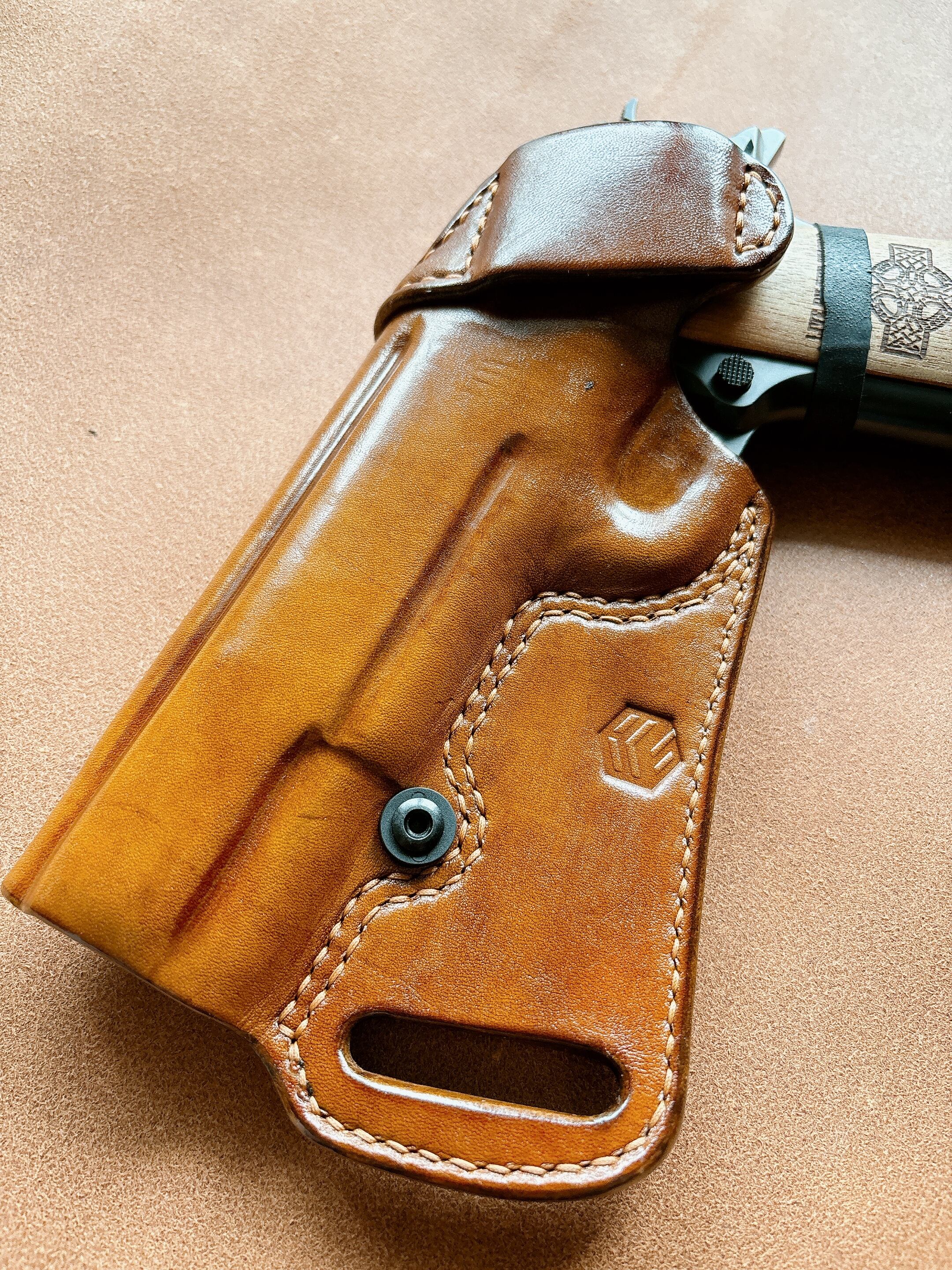 栃木レザー4mm厚(フルベジタブルタンニン鞣 ヌメ革)を切り出し黒・ライトブラウン染色を行いウエットフォーミングでフィッティングしておりスムーズにリホルスター可能です