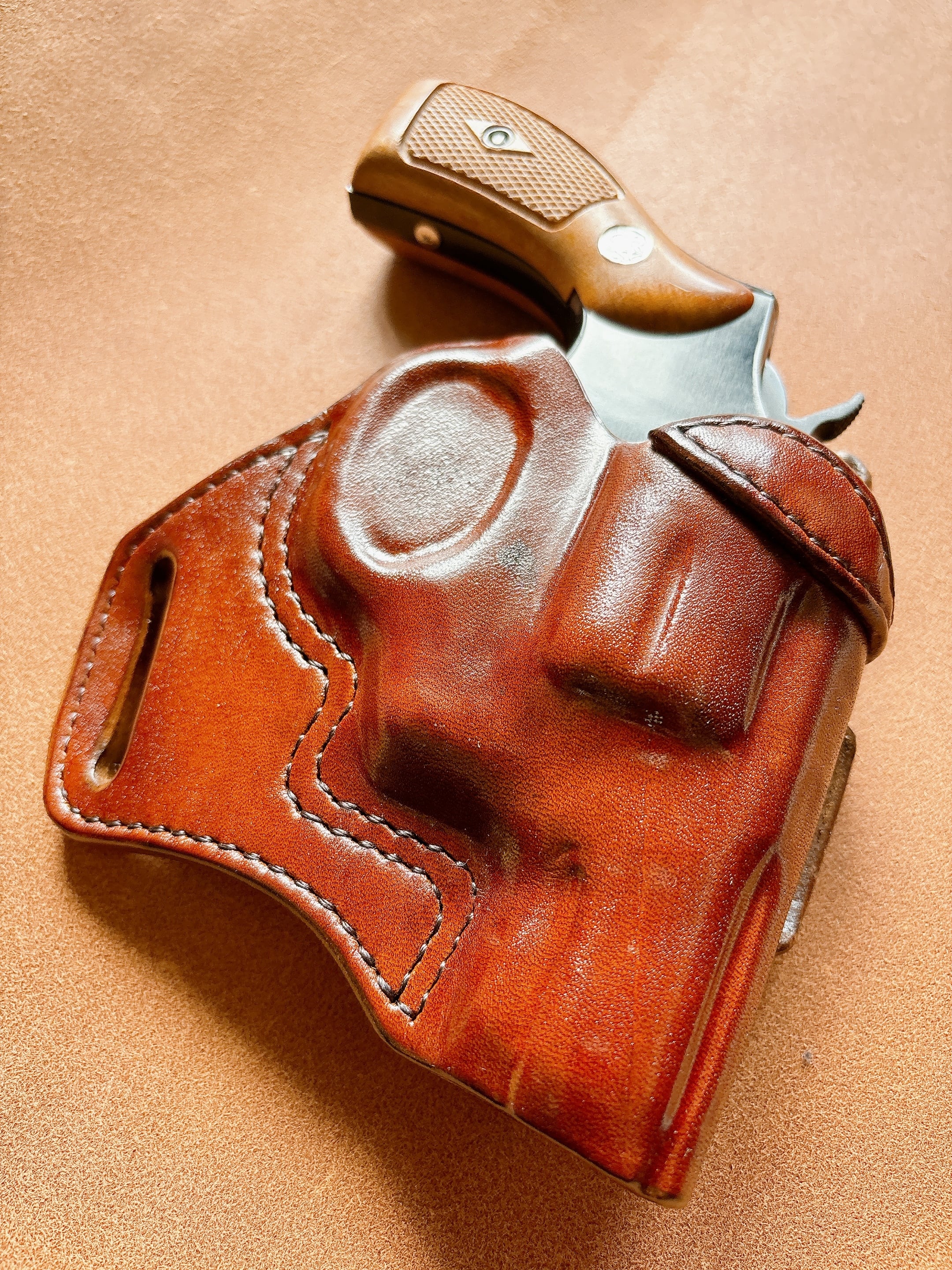 栃木レザー4mm厚(フルベジタブルタンニン鞣 ヌメ革)を切り出しライトブラウン染色を行いウエットフォーミングでフィッティングしておりスムーズにリホルスター可能です