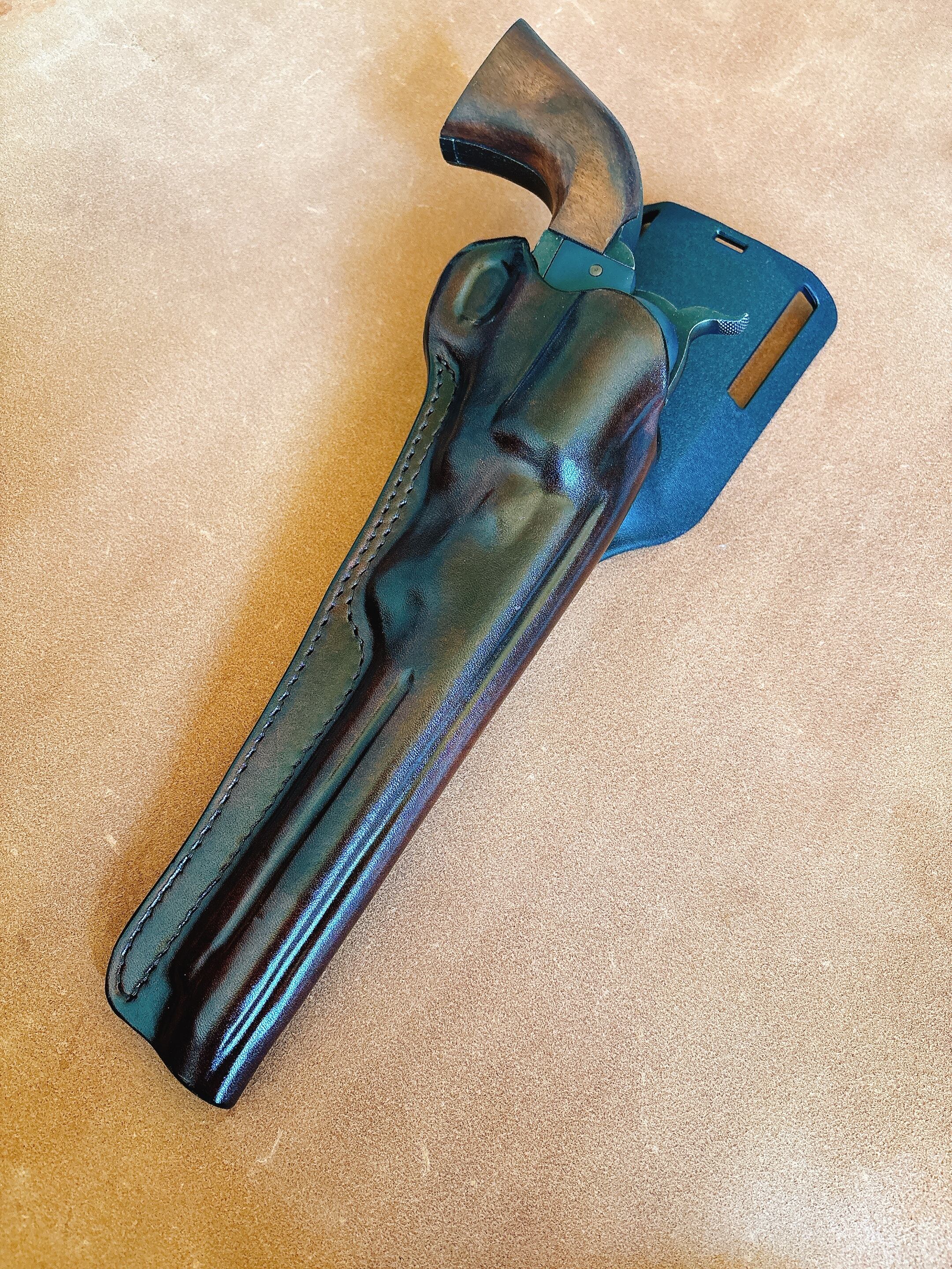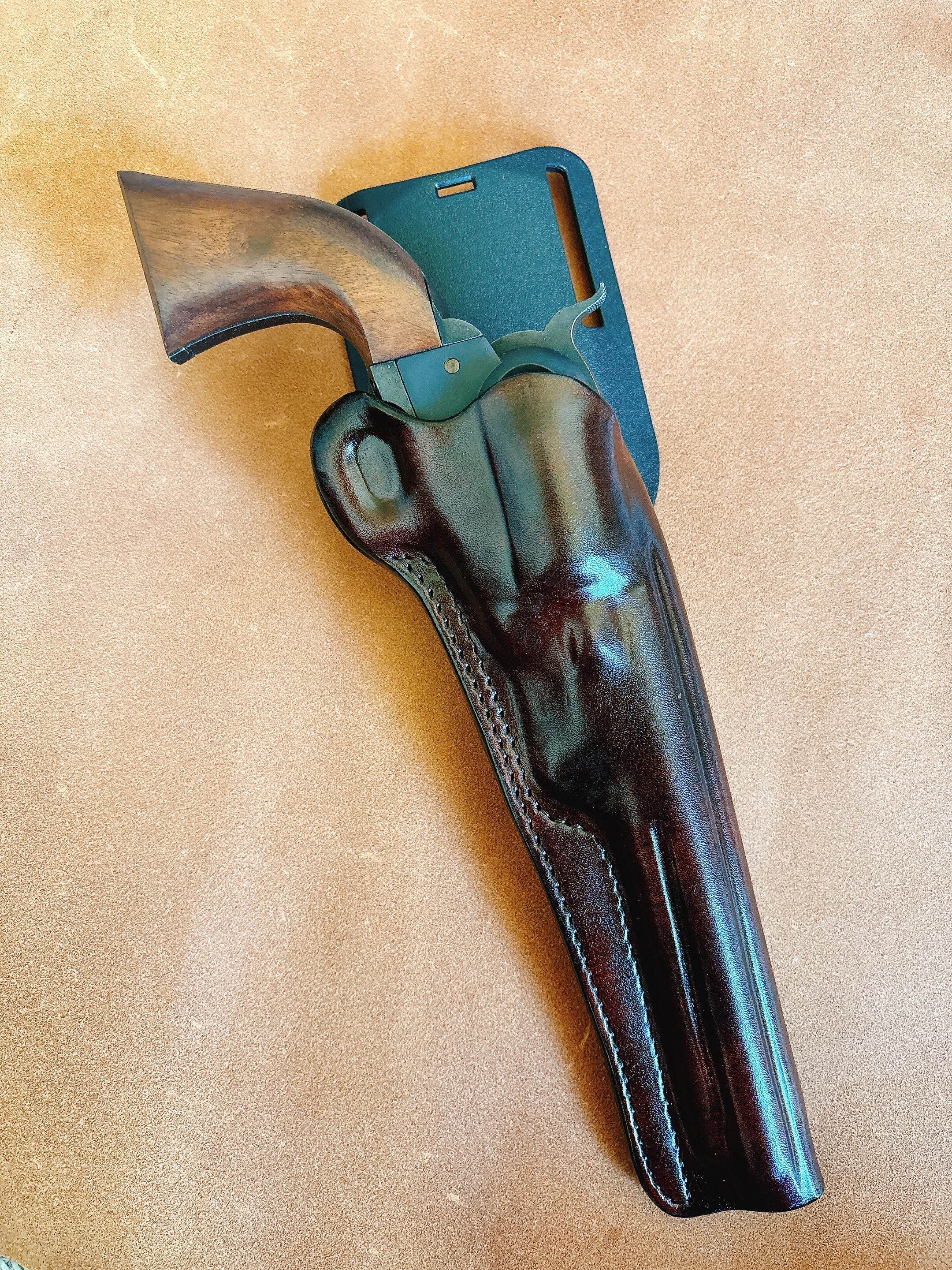 栃木レザー4mm厚(フルベジタブルタンニン鞣 ヌメ革)を切り出し調合したブラウンにて染色を行いウエットフォーミングでフィッティングしておりスムーズにリホルスター可能です