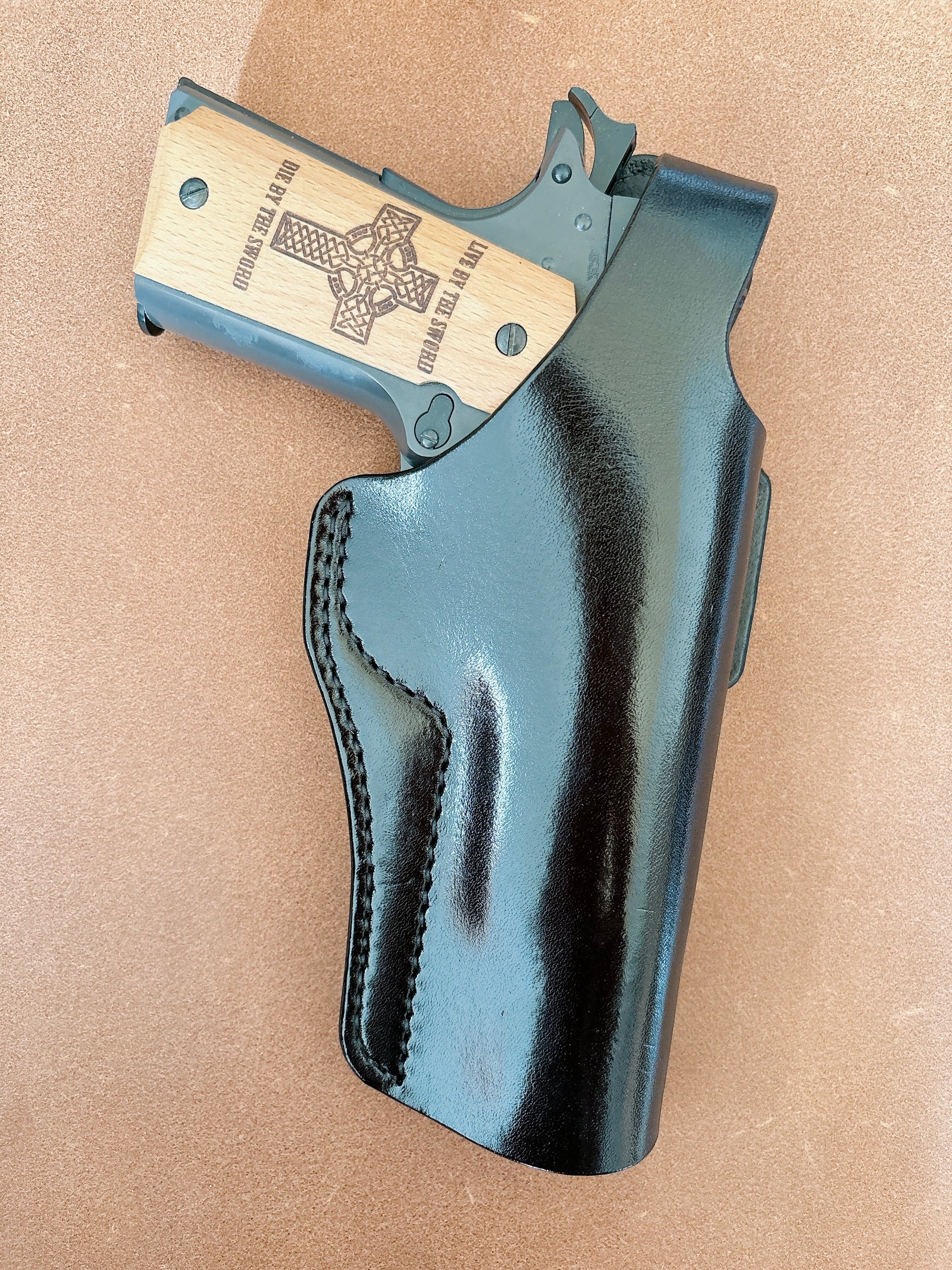 栃木レザー4mm厚(フルベジタブルタンニン鞣 ヌメ革)を切り出し黒染色を行いウエットフォーミングでフィッティングしておりスムーズにリホルスター可能です