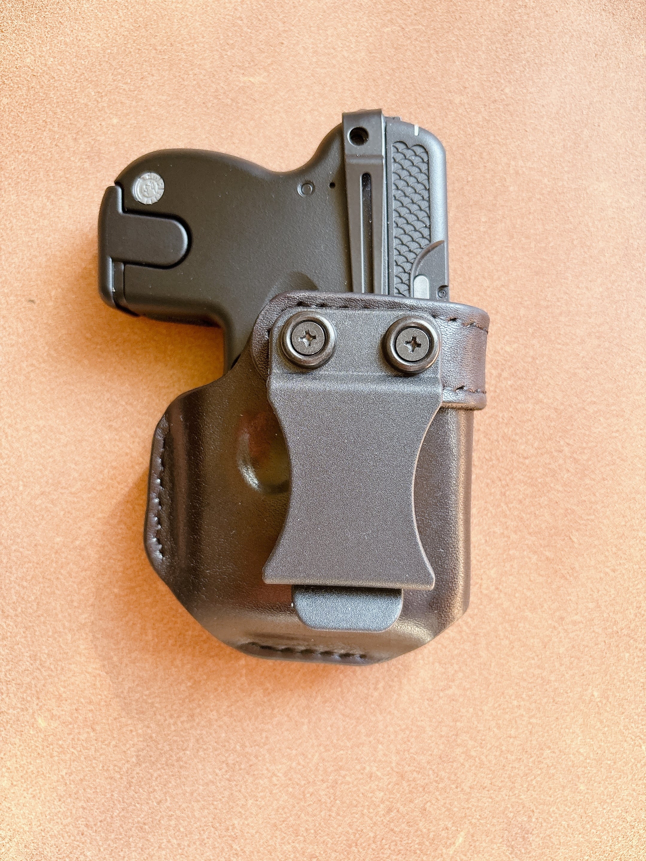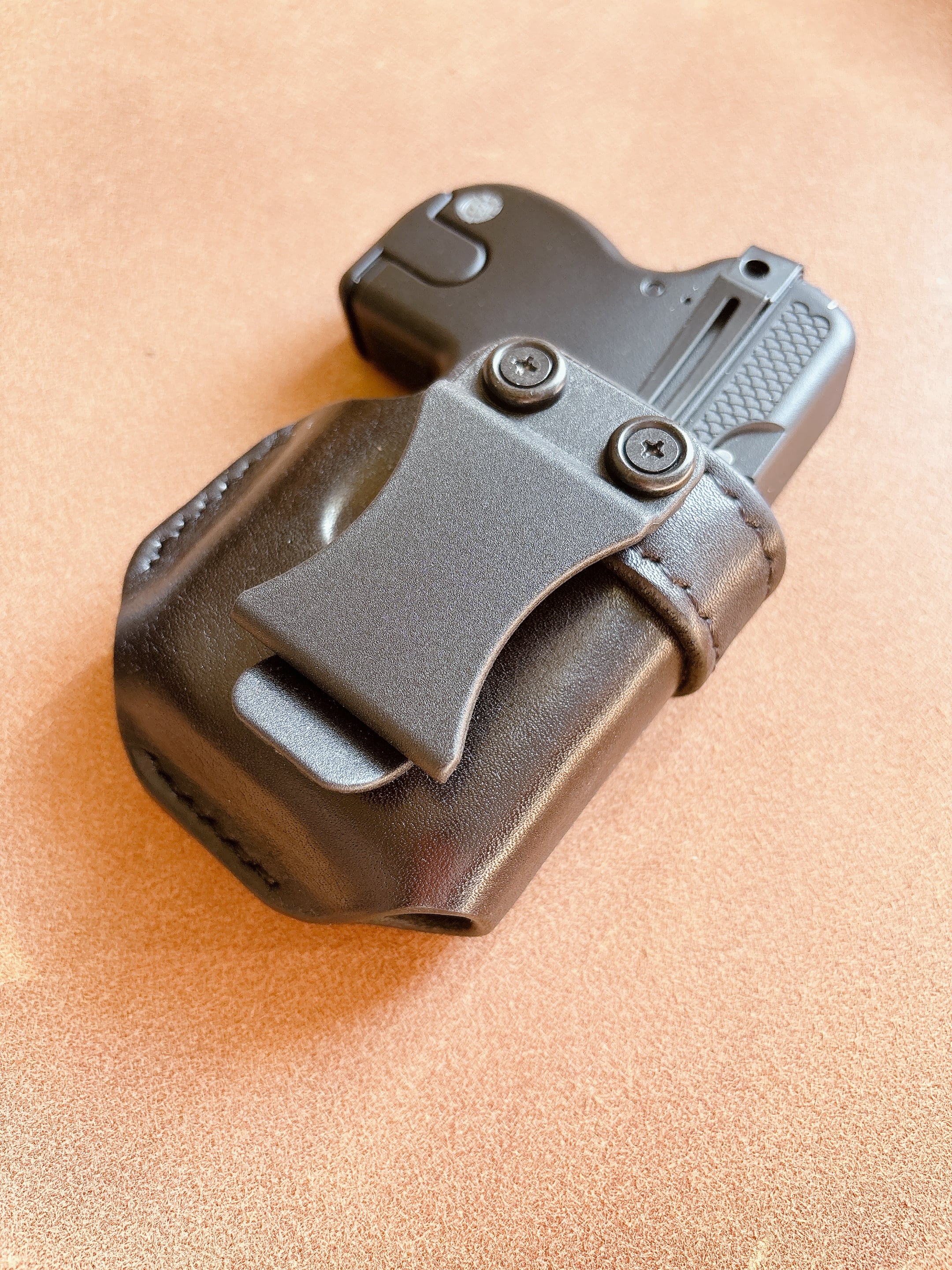 栃木レザー4mm厚(フルベジタブルタンニン鞣 ヌメ革)を切り出し黒に染色を行いウエットフォーミングでフィッティングしておりスムーズにリホルスター可能です