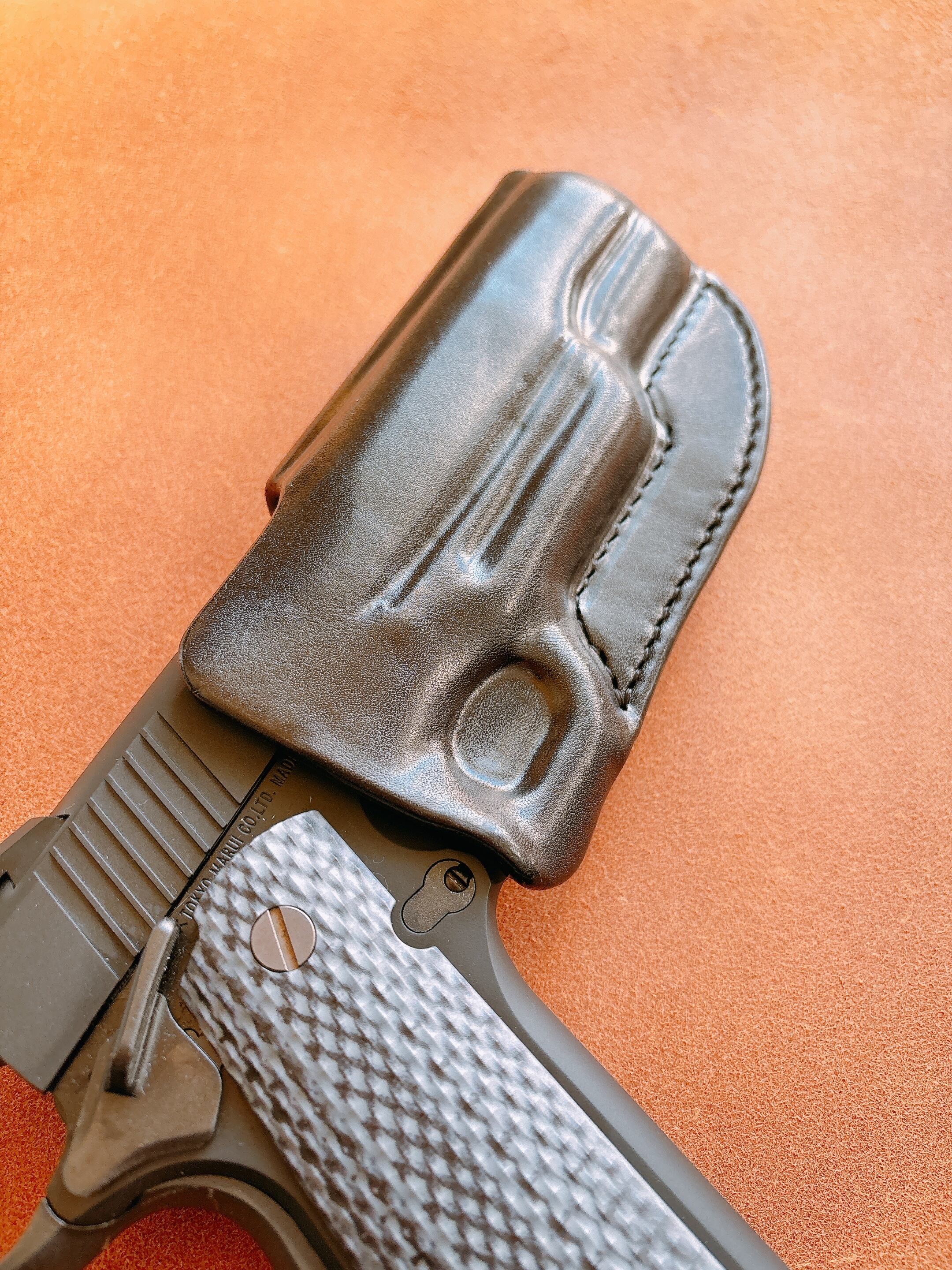 栃木レザー4mm厚を黒染めしウェットフォーミングで整形。カイデックスに近い感覚でご使用頂けます